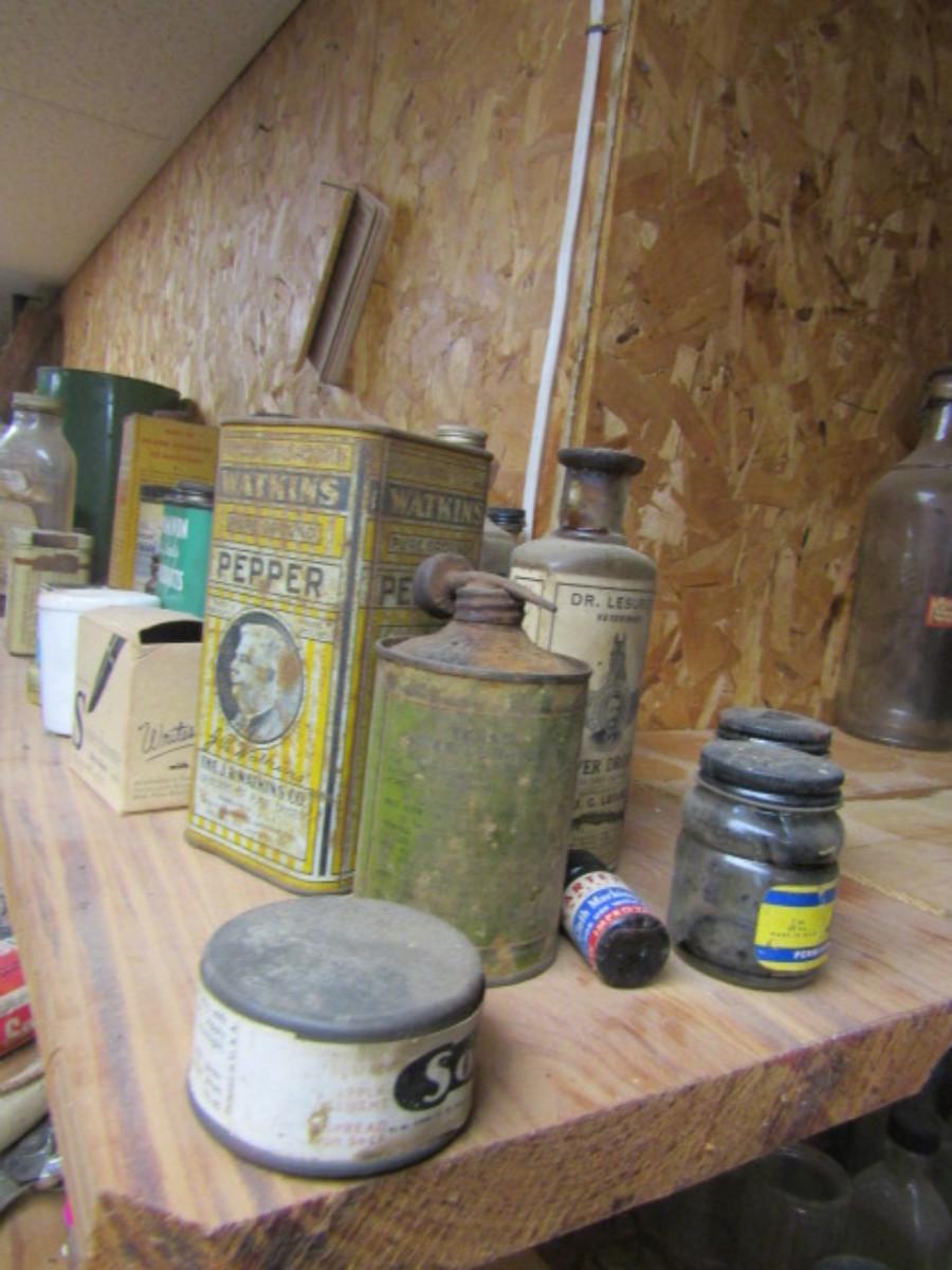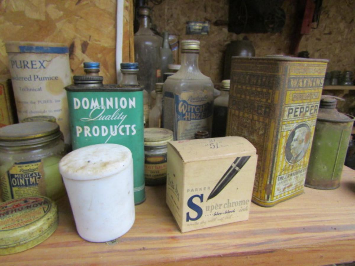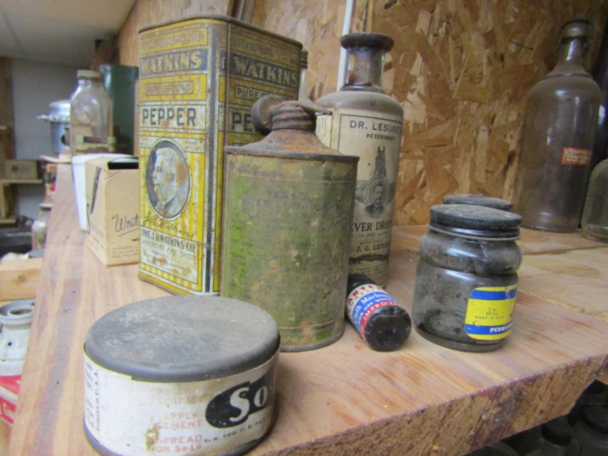Collection of Antique Tins, Bottles and Jars. Stored in non-climatized basement so expect item may need to be cleaned from dust, insects, etc.