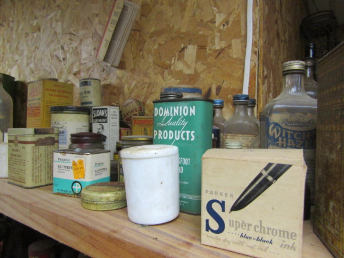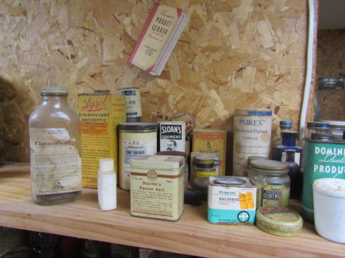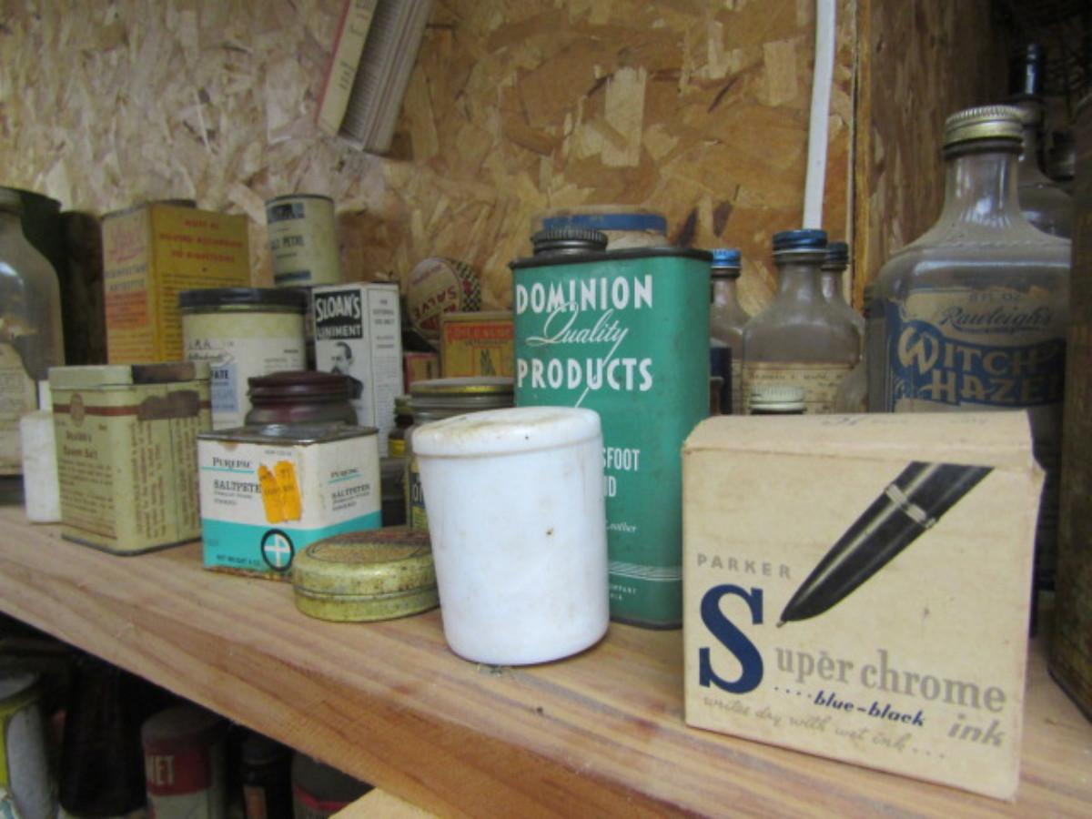 Collection of Antique Tins, Bottles and Jars. Stored in non-climatized basement so expect item may need to be cleaned from dust, insects, etc.