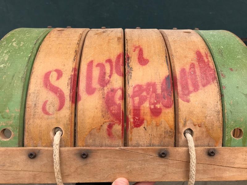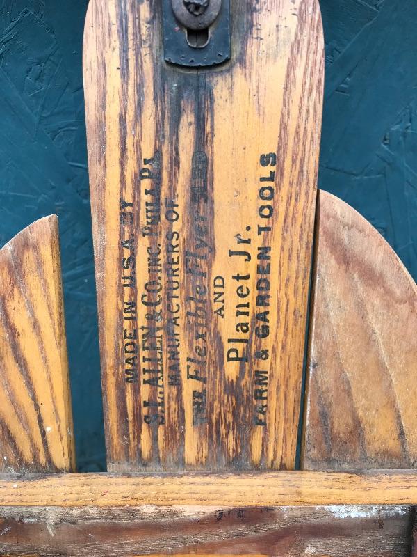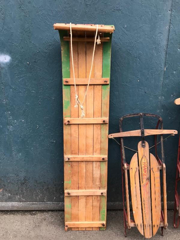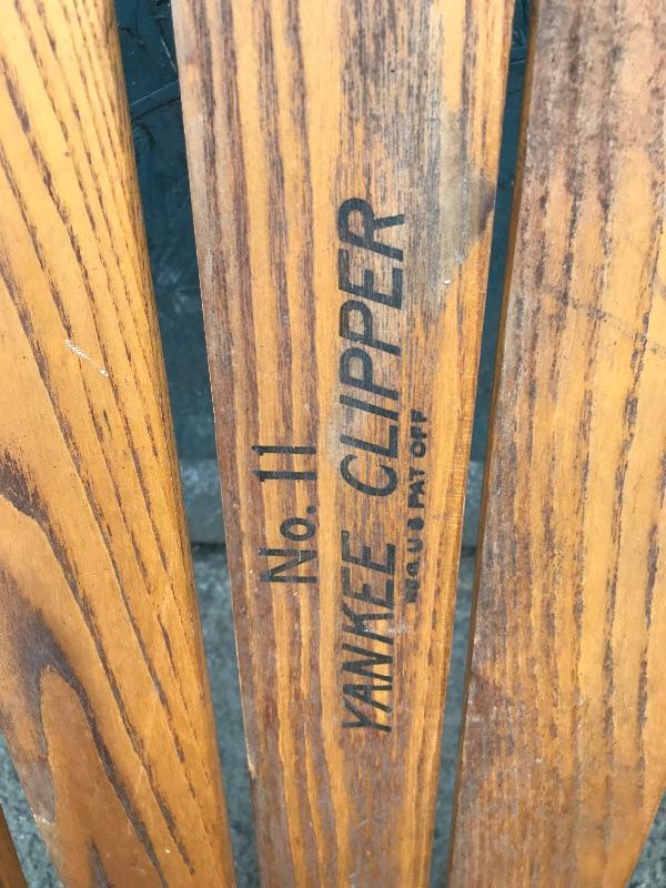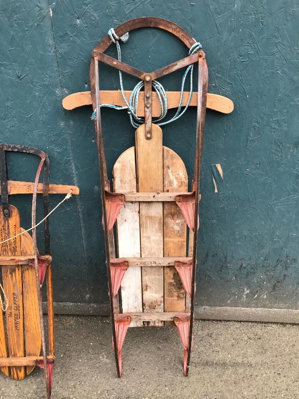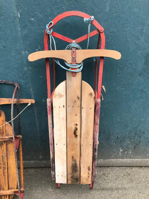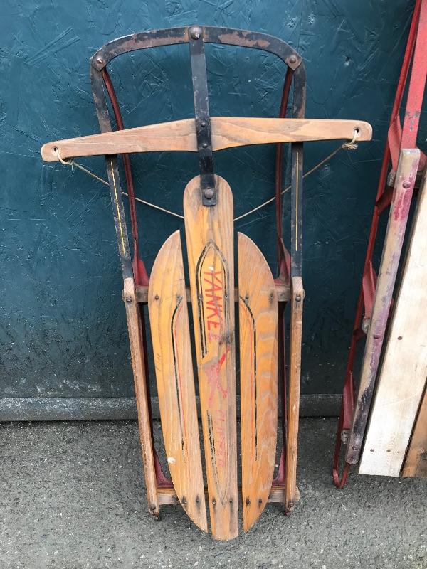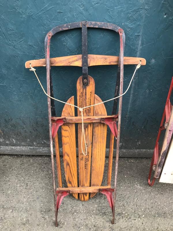 The small sled is 40.5"L x 17"W x 6"H, made of wood and steel, Yankee Clipper brand.