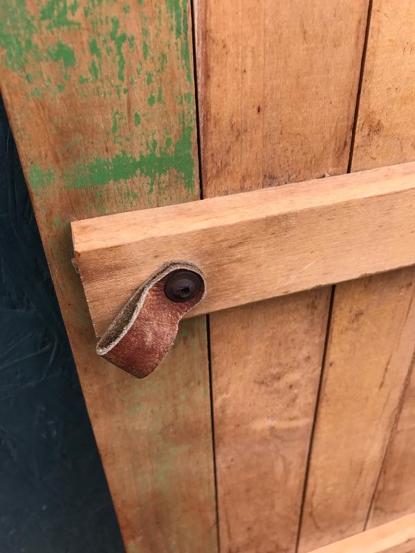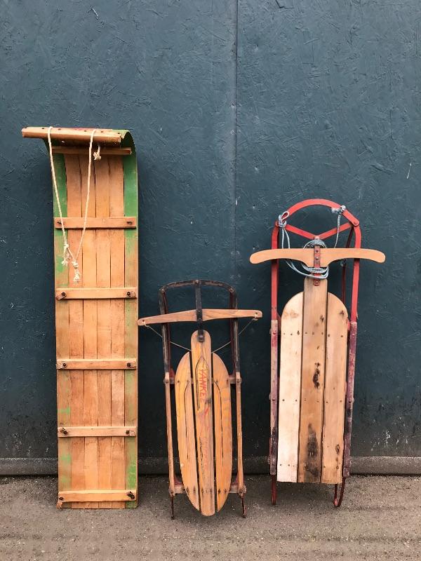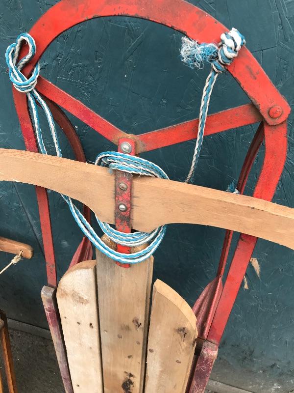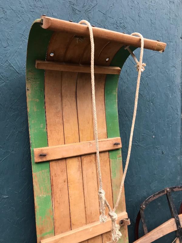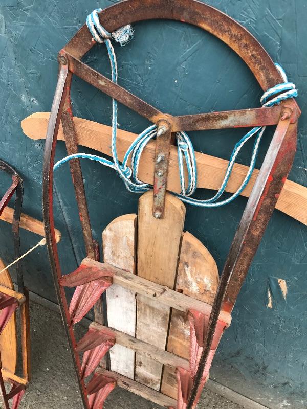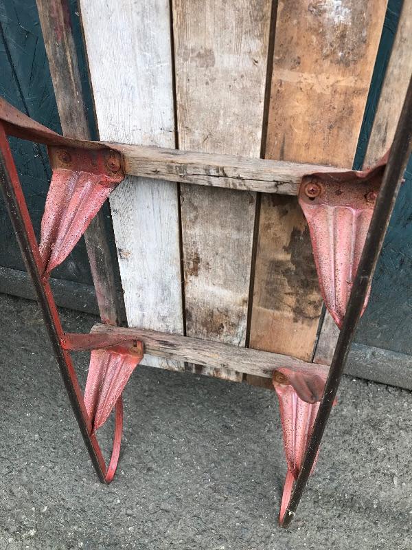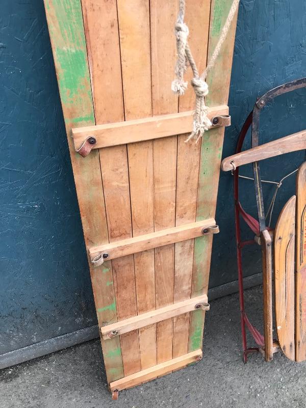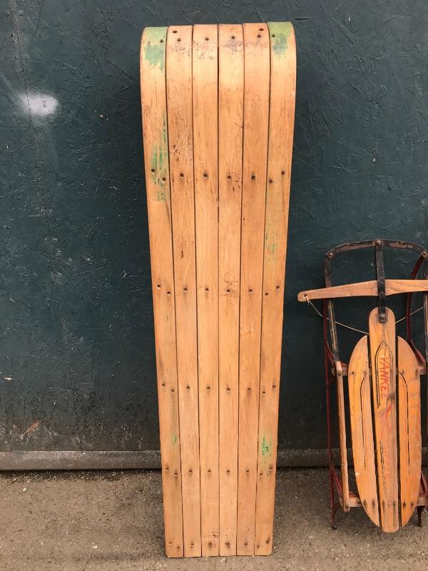 The medium sled is 54"L x 21"W x 7"H, made of wood and steel.