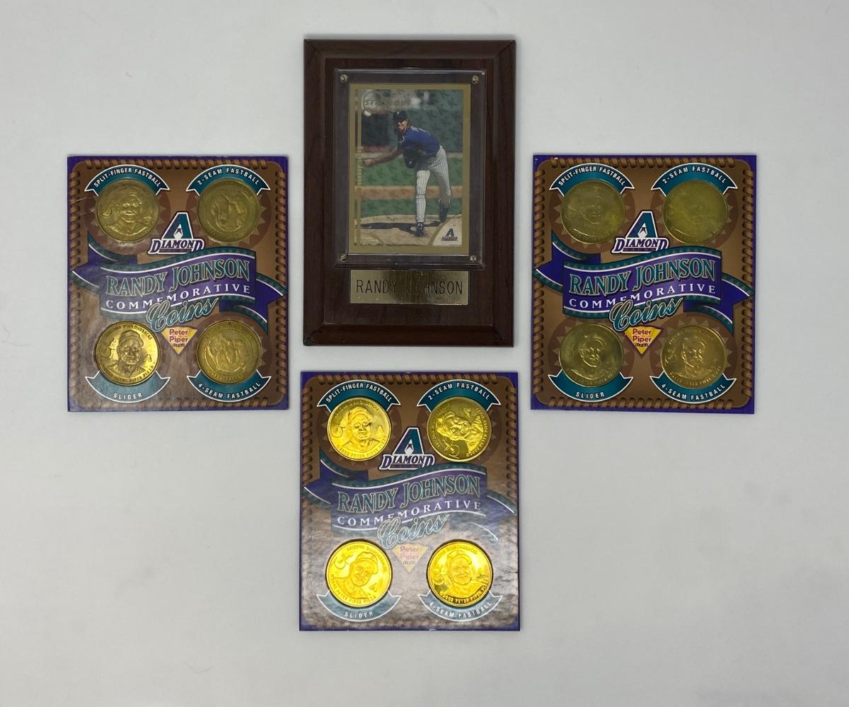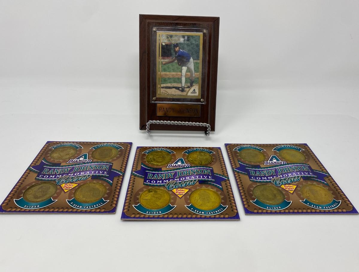 Collection of Arizona Diamondbacks Randy Johnson Memorability Including a 1999 Strikeout Kings Topps Baseball Card and a Set of 3 Commemorative Coins