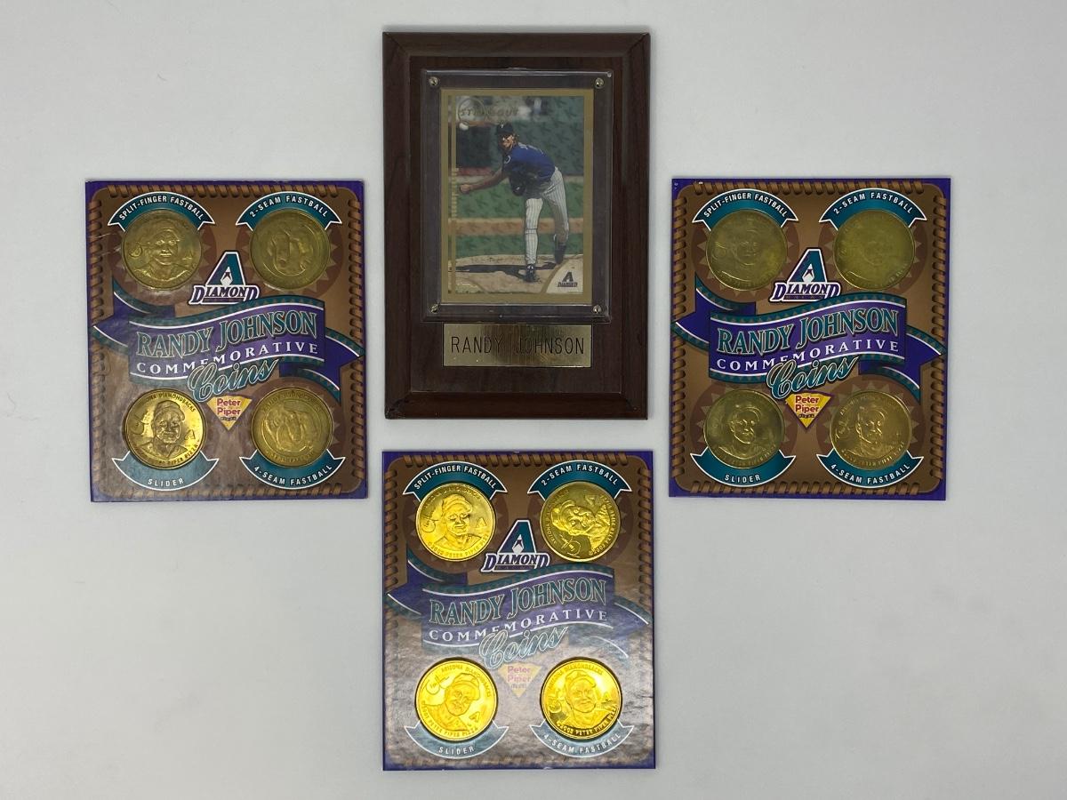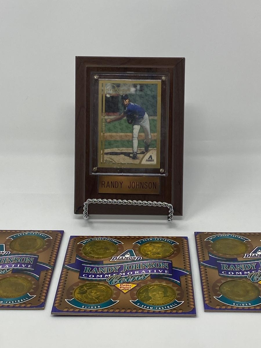 Collection of Arizona Diamondbacks Randy Johnson Memorability Including a 1999 Strikeout Kings Topps Baseball Card and a Set of 3 Commemorative Coins