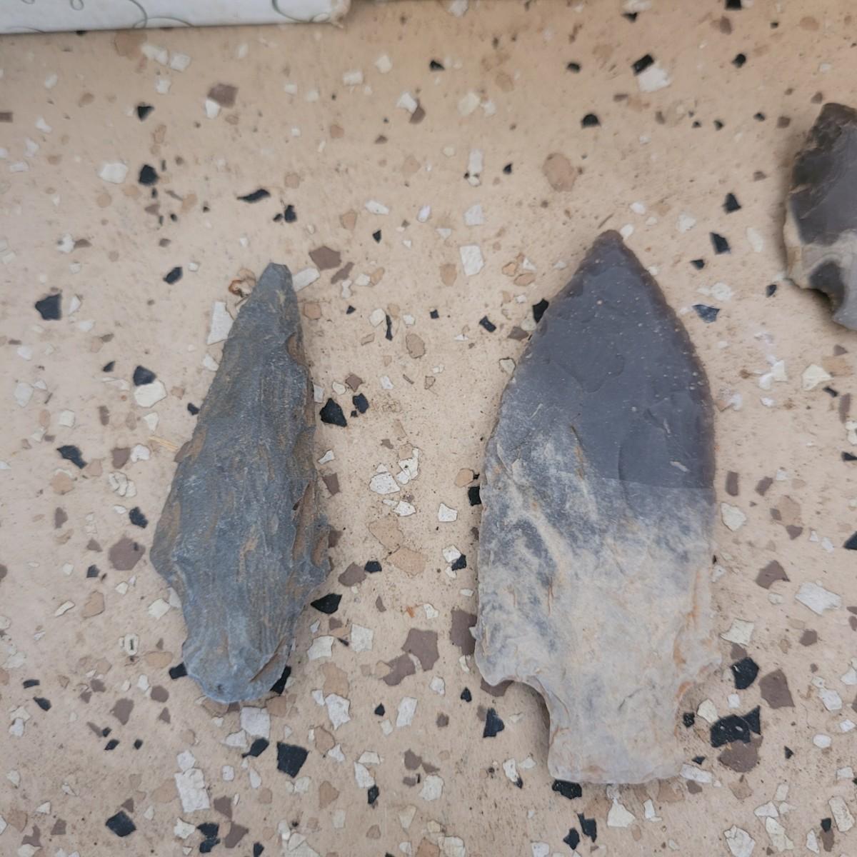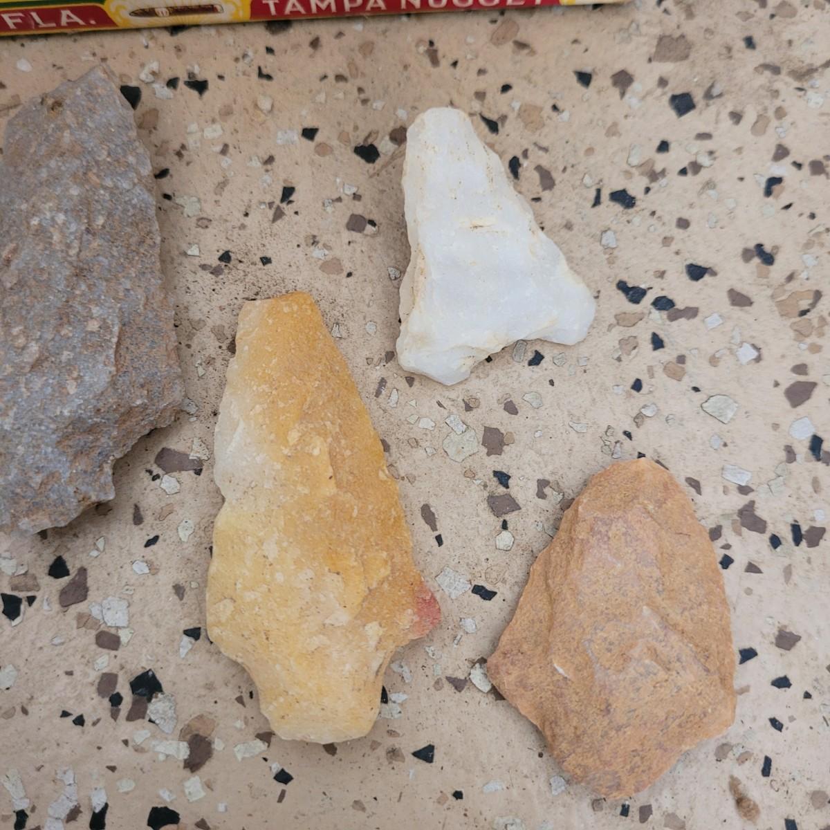 This collection of arrowheads, rocks and minerals includes what appears to be flint, shale, mica and other varieties. Shipping available.
