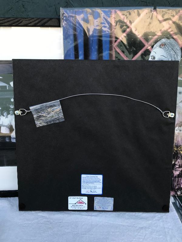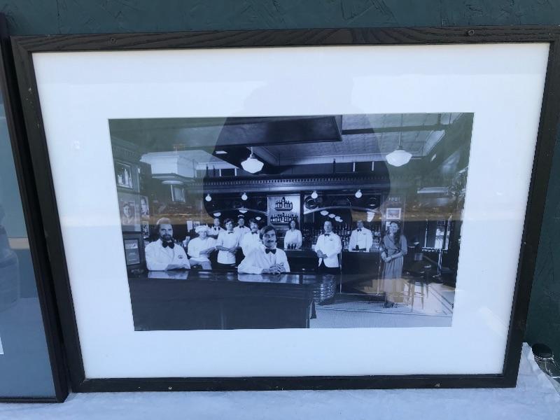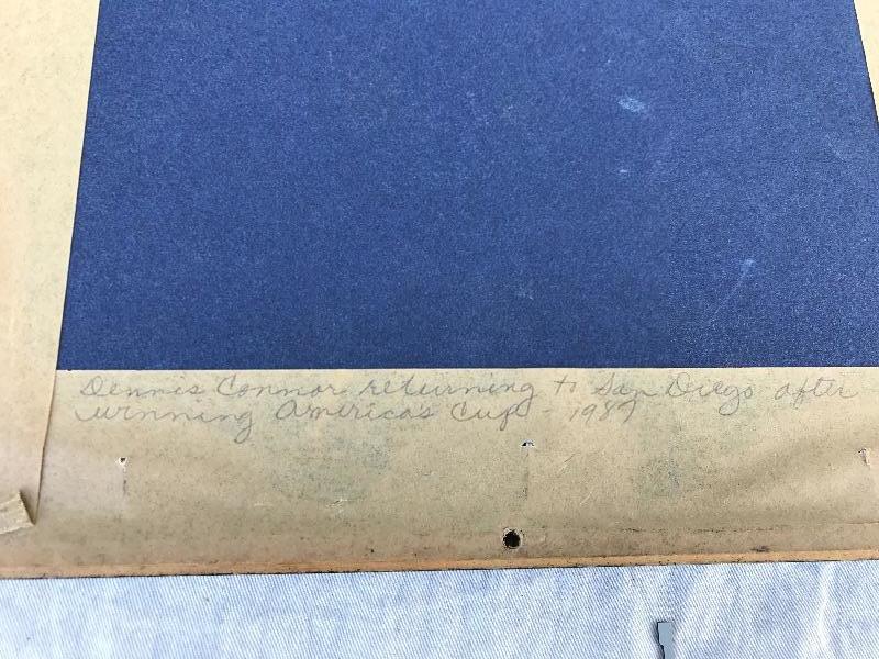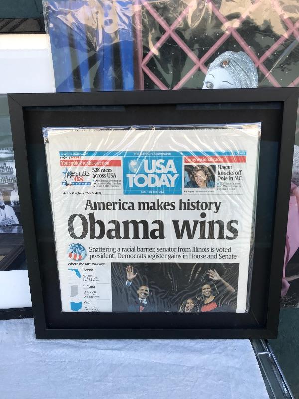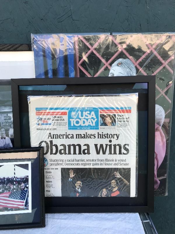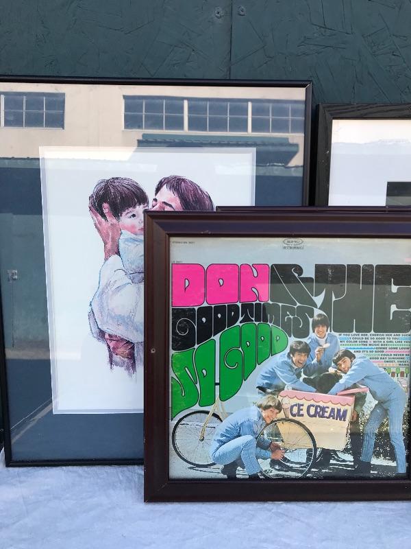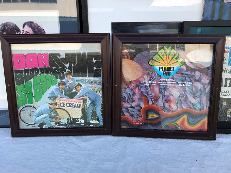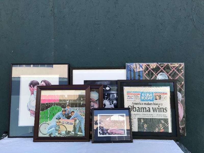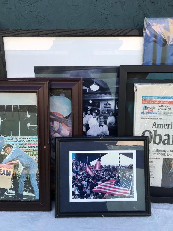 The framed photo reads "Dennis Connor returning to San Diego after winning America's Cup 1987", dimensions are 10.5" x 8.75". Lot includes two framed LP Album covers--Don & the Goodtimes "So Good" and Lary Coryell "Planet End", dimensions are 14.5" x 14.5. Framed USA Today Newspaper front page "Obama Wins" dimensions 16" x 15.75". Clown and doll poster is 16" x 20". Framed photo of staff from McCormick and Schmick's (longtime Seattle restaurant that closed down) is 25.5" x 19.25". The signed art print of father and son is 16.25" x 20.5".
