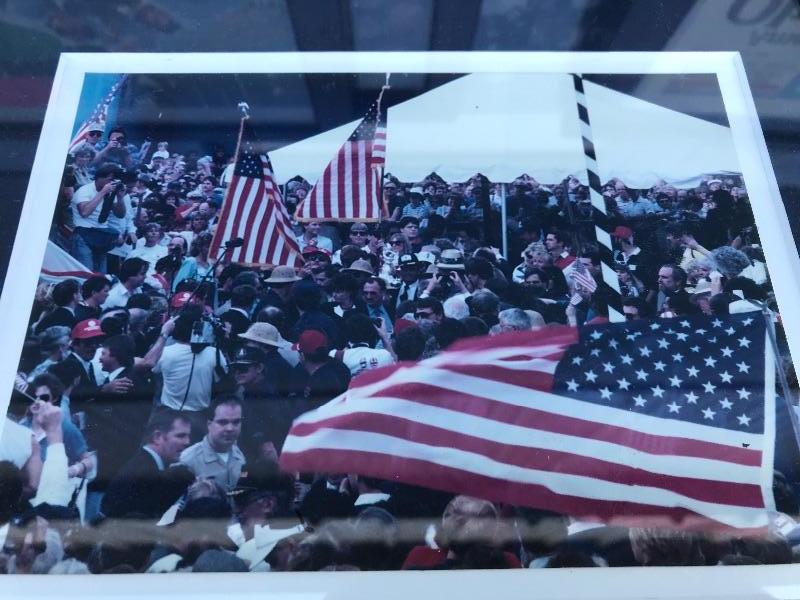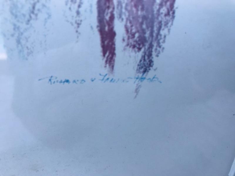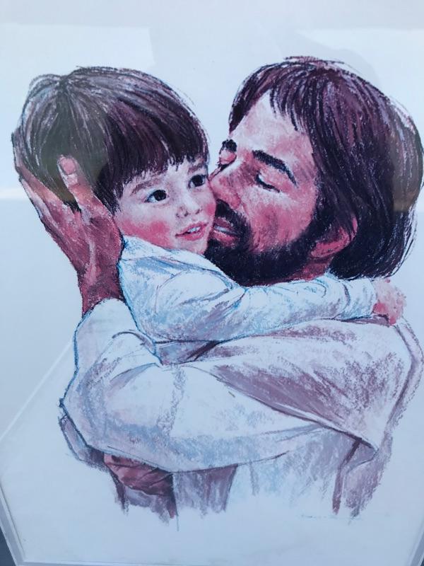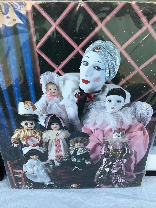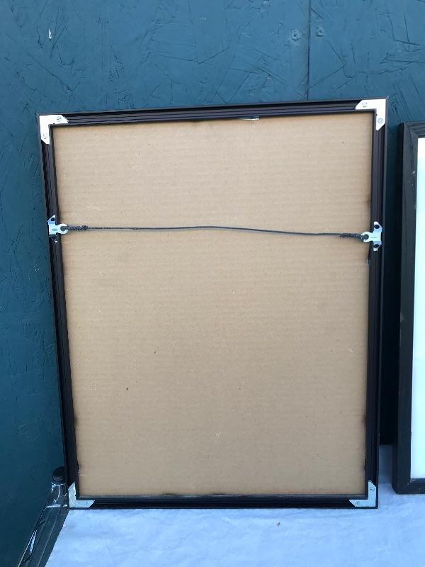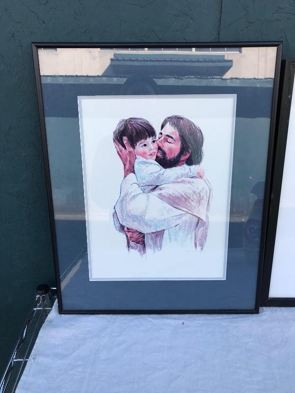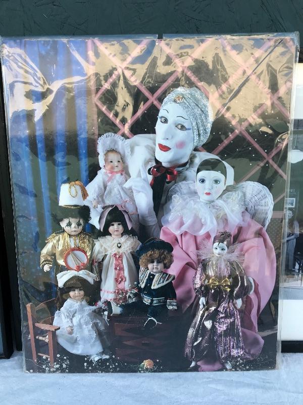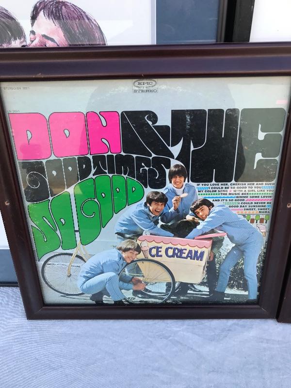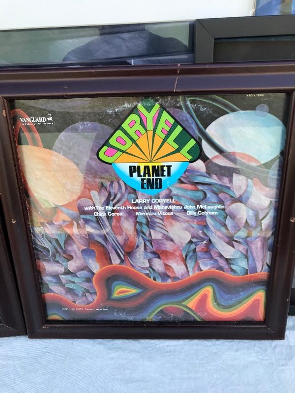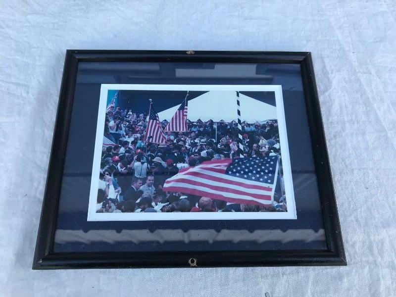 The framed photo reads "Dennis Connor returning to San Diego after winning America's Cup 1987", dimensions are 10.5" x 8.75". Lot includes two framed LP Album covers--Don & the Goodtimes "So Good" and Lary Coryell "Planet End", dimensions are 14.5" x 14.5. Framed USA Today Newspaper front page "Obama Wins" dimensions 16" x 15.75". Clown and doll poster is 16" x 20". Framed photo of staff from McCormick and Schmick's (longtime Seattle restaurant that closed down) is 25.5" x 19.25". The signed art print of father and son is 16.25" x 20.5".