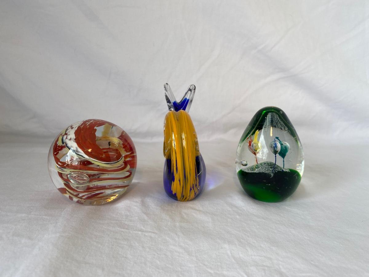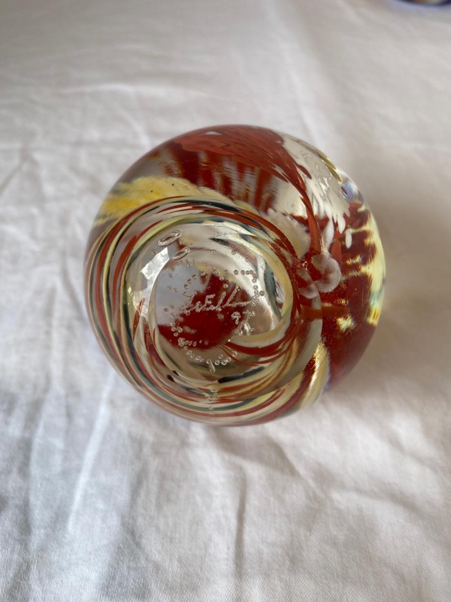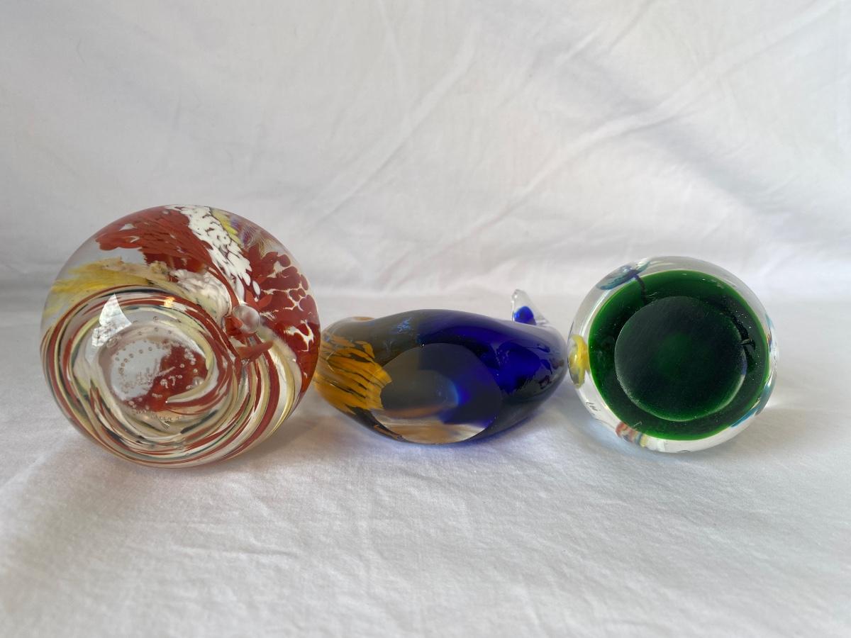 Collection of Art glass paperweights. The red/orange/yellow swirl glass paperweight is signed on the bottom but cannot make out the artist name. Preowned, like new, and sold as is