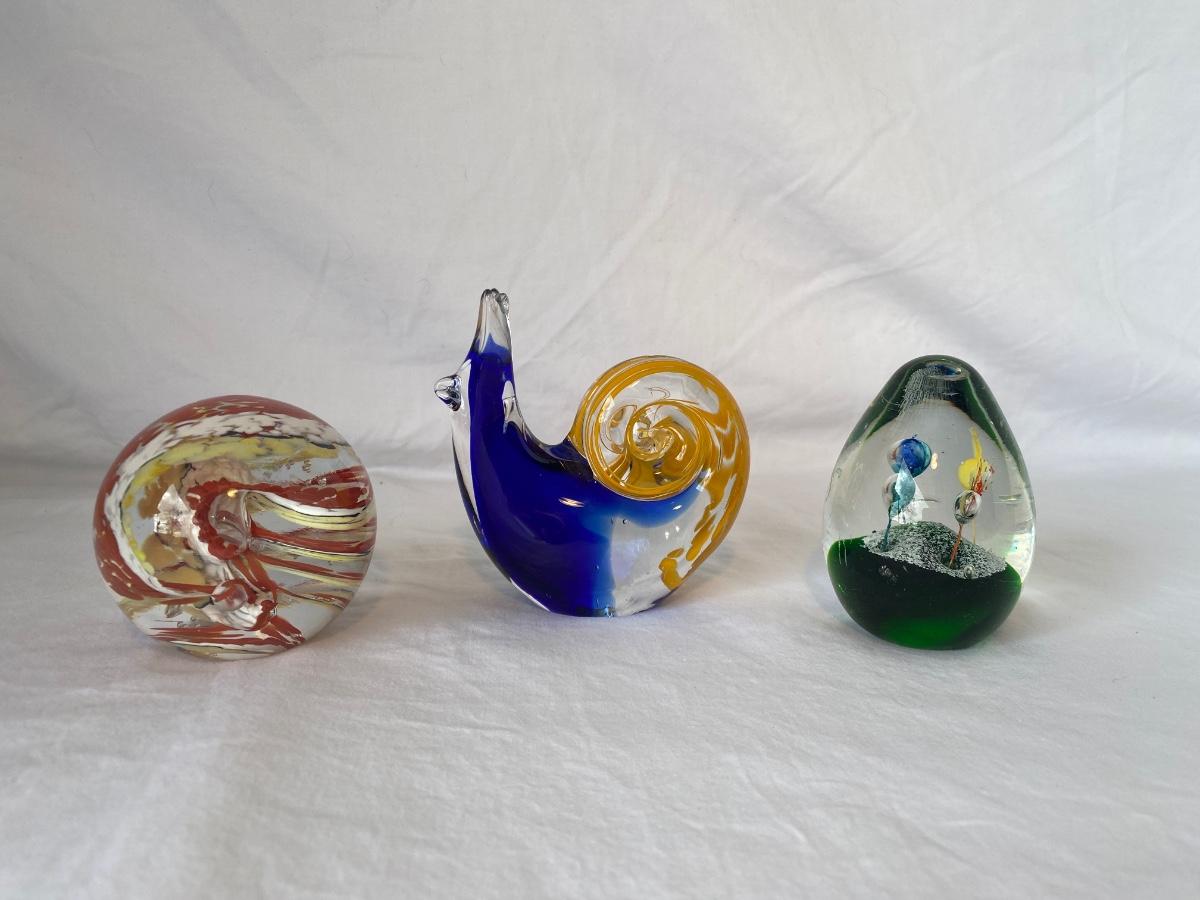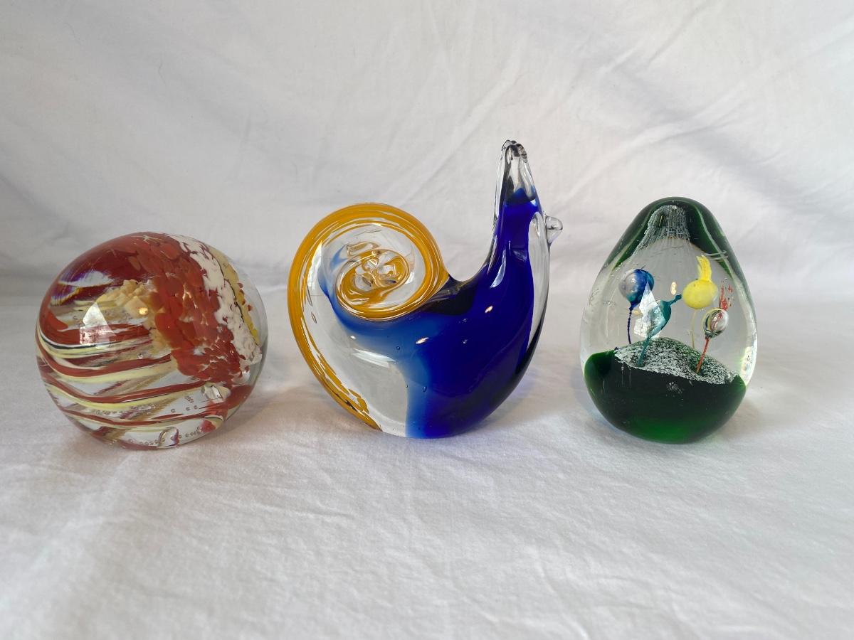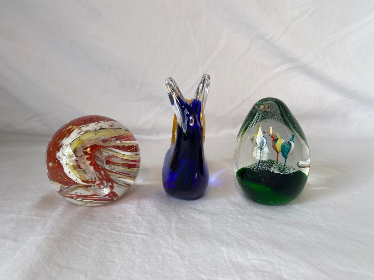 Collection of Art glass paperweights. The red/orange/yellow swirl glass paperweight is signed on the bottom but cannot make out the artist name. Preowned, like new, and sold as is