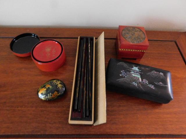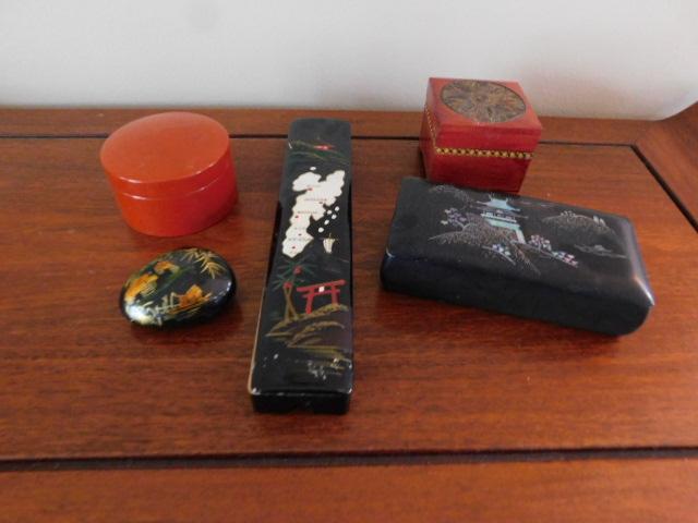 Collection of Asian Laquer and Wood Boxes Various Shapes and Sizes
