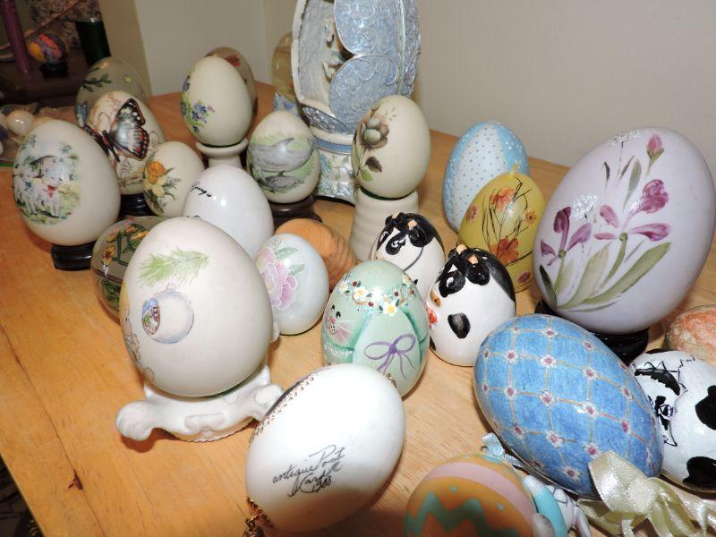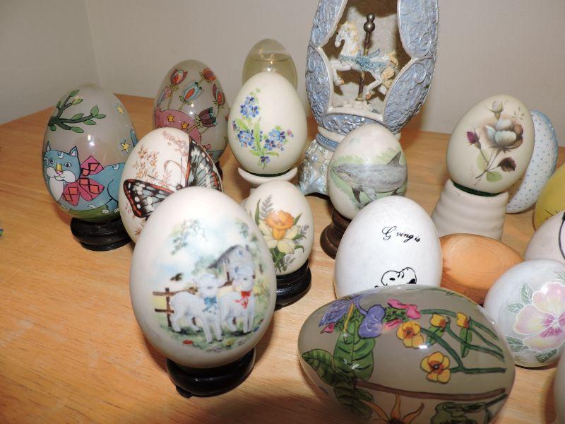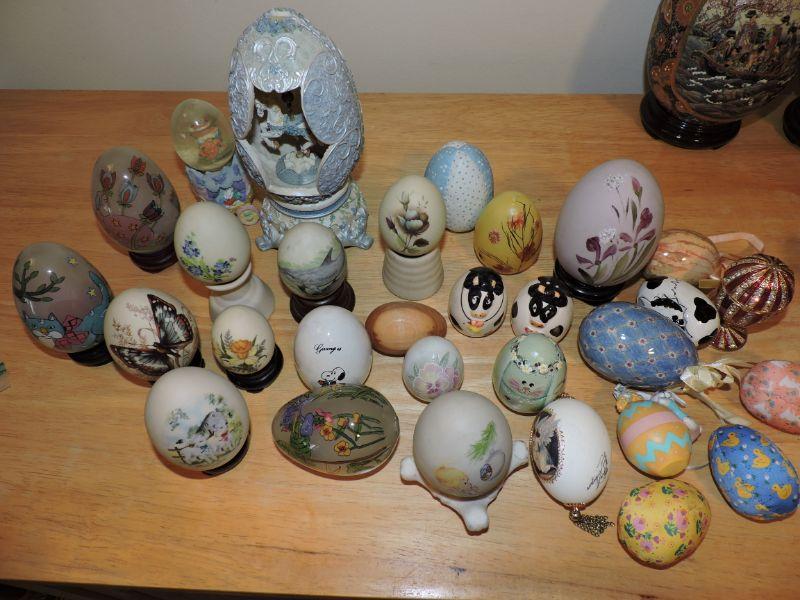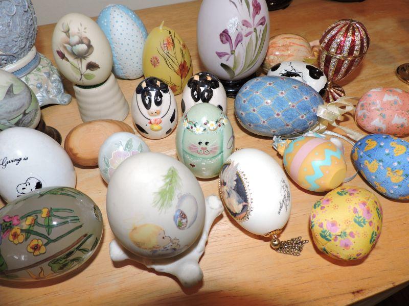 Collection of assorted eggs, some with stands. Glass, porcelain, wood, and fabric. About 30 eggs. **Please read Terms and Conditions before placing a bid. Pick up is Thursday, August 15, 2019 from 4pm to 7pm or Sunday, August 18 from 11am-2pm in Mullica Hill. All sales are final. All sales are as is, where is. Please review all photos. Any props included in photos are not included in listing. All measurements are approximate.