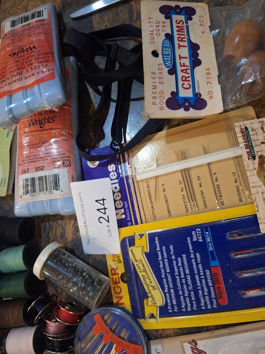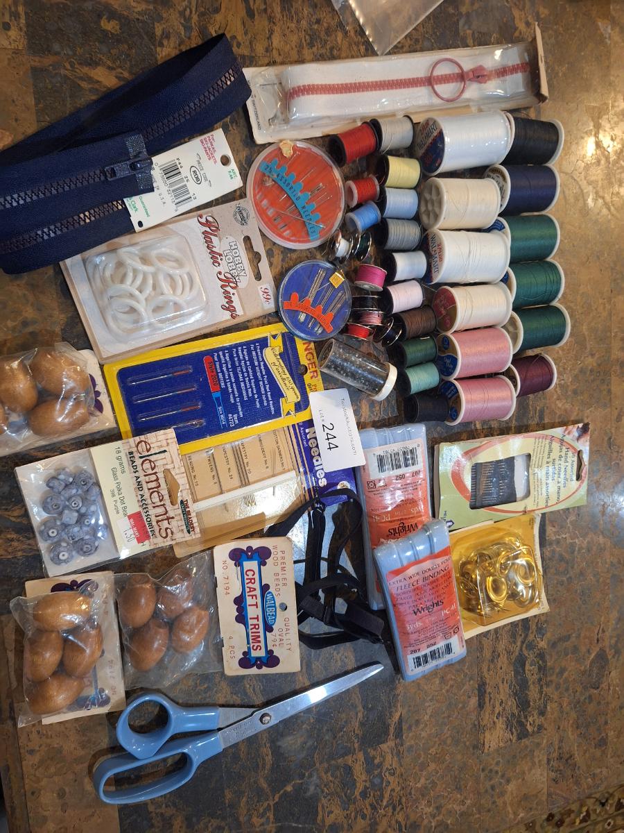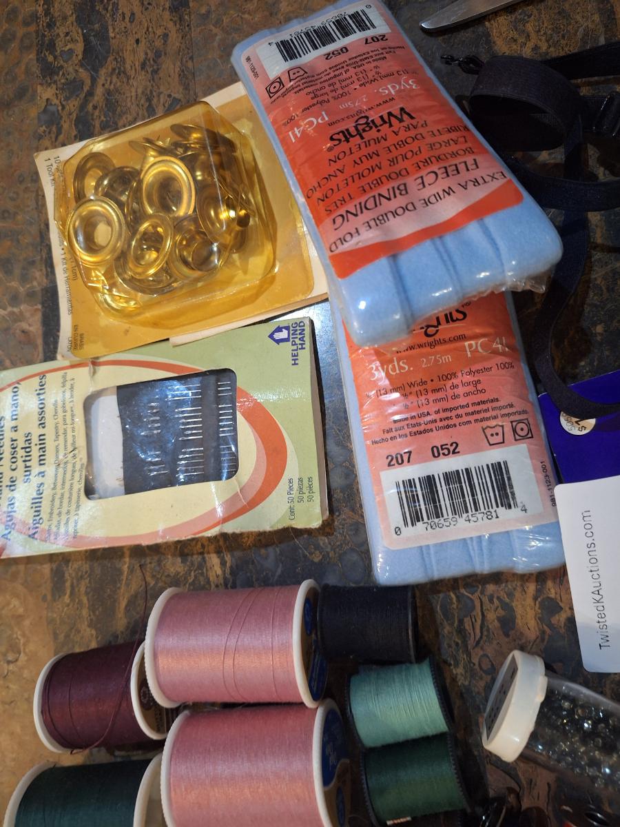 thread, needles, machine needles, beads, rings, trim, scissors and more.