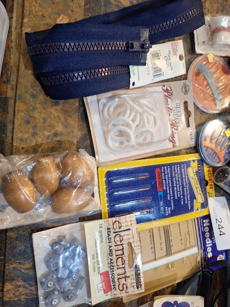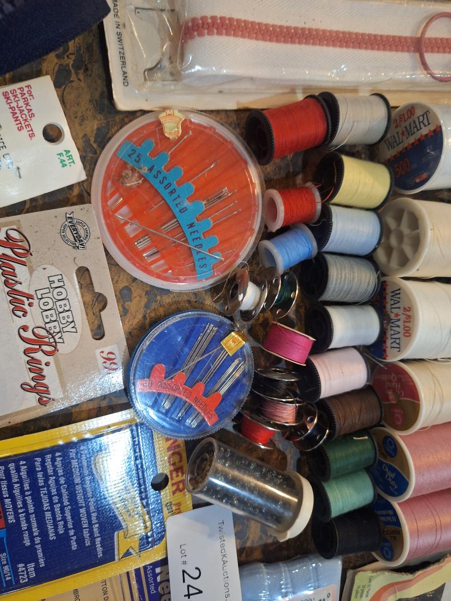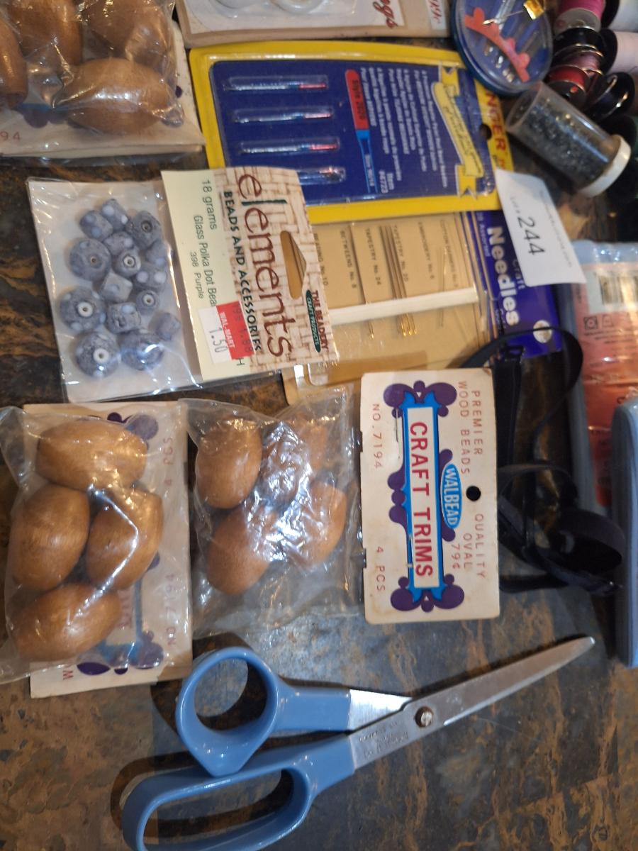thread, needles, machine needles, beads, rings, trim, scissors and more.