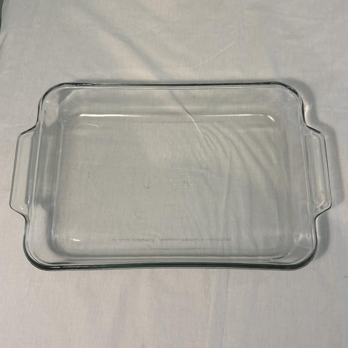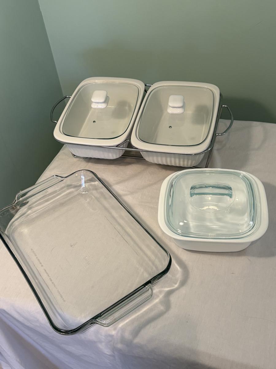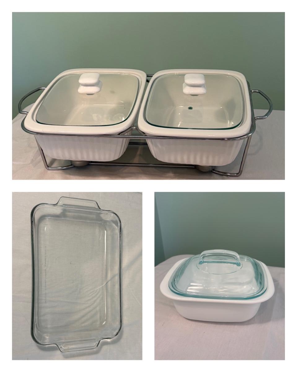 This lot is made up of a chafing dish buffet set (approximately 15"x10"x5"H), a Coringware baking dish (approximately 8.5"x7.5"x3"H), and an Anchor casserole dish (approximately 16"x10"x2.5"H).
