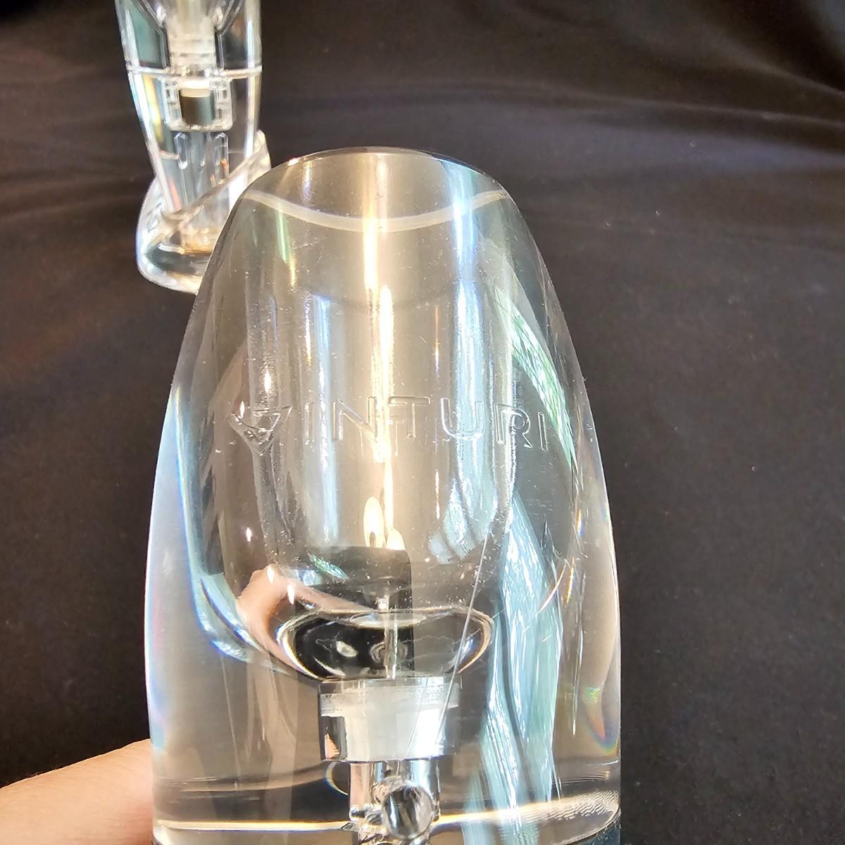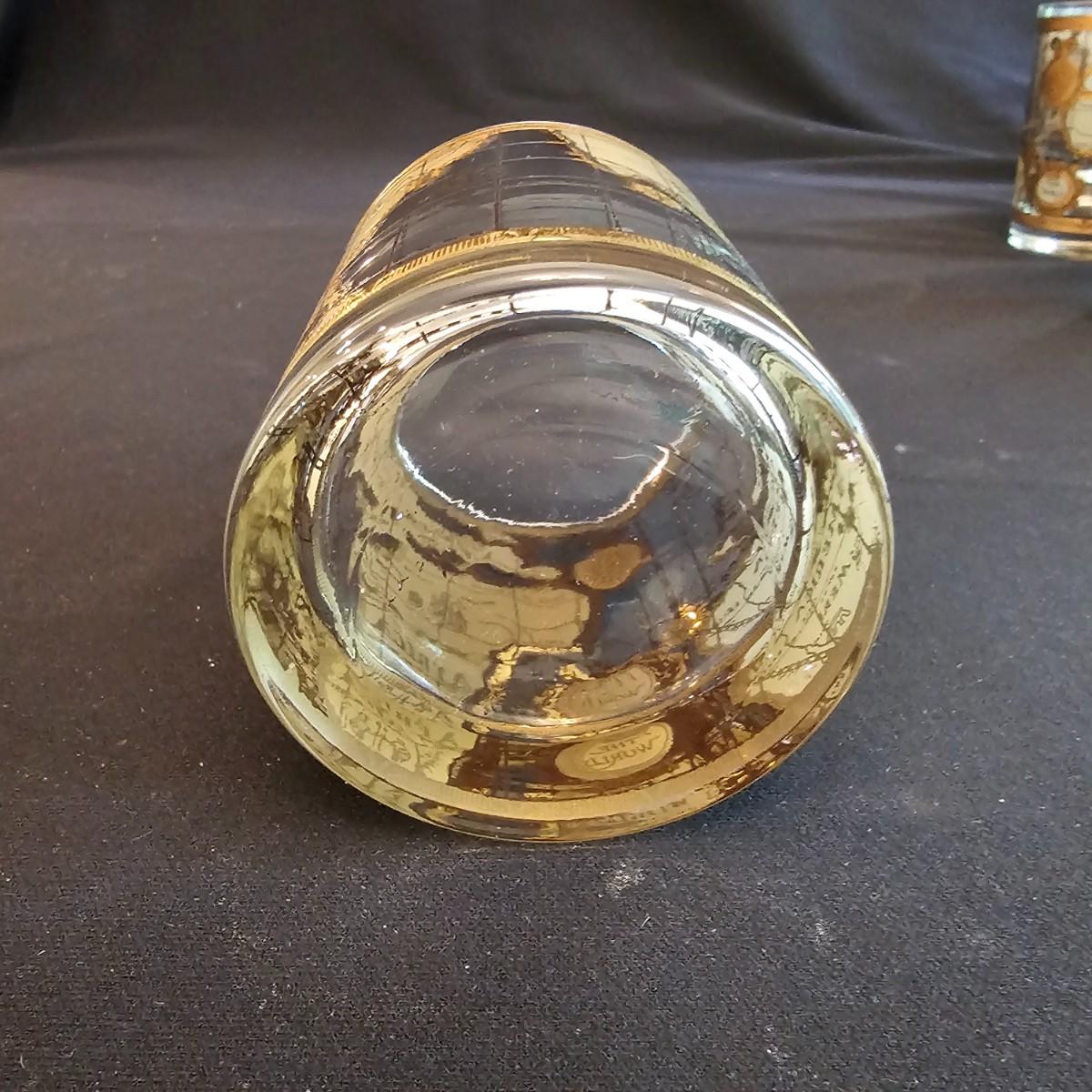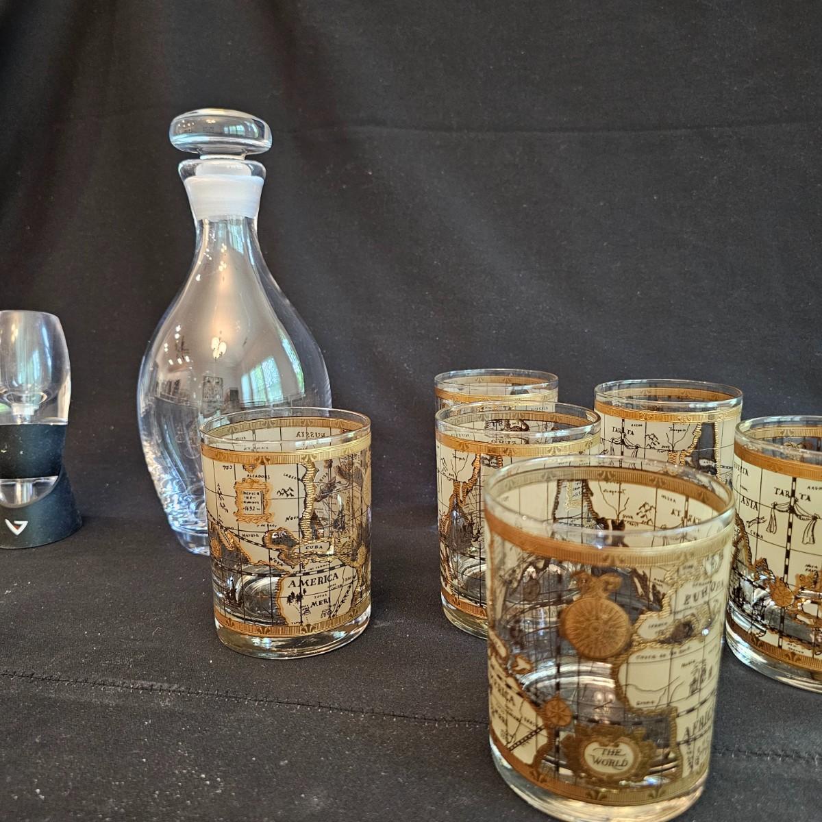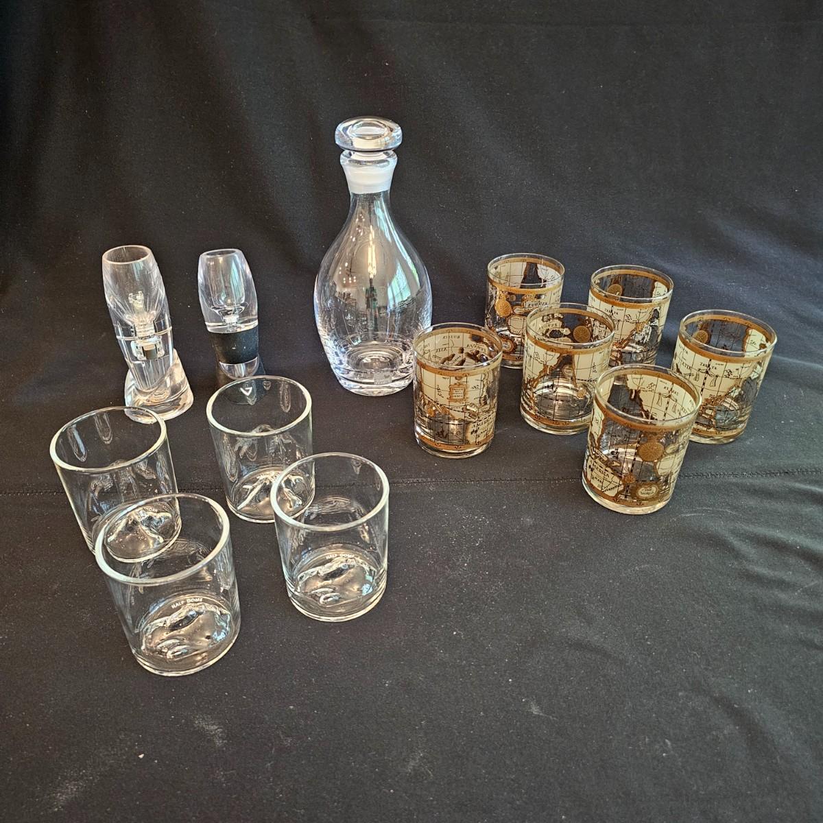 Bar glasses, a decanter and two Vinturi brand pieces for aerating wine. Glass decanter is by Simon Pearce, measures 4.5"D x 10.5"H. Set of six gold colored glasses have world maps on them, measure 3.25" x 4"H. A set of four clear glasses have four different mountain range impressions rising up from the bottom. See photos for details. Shipping available.
