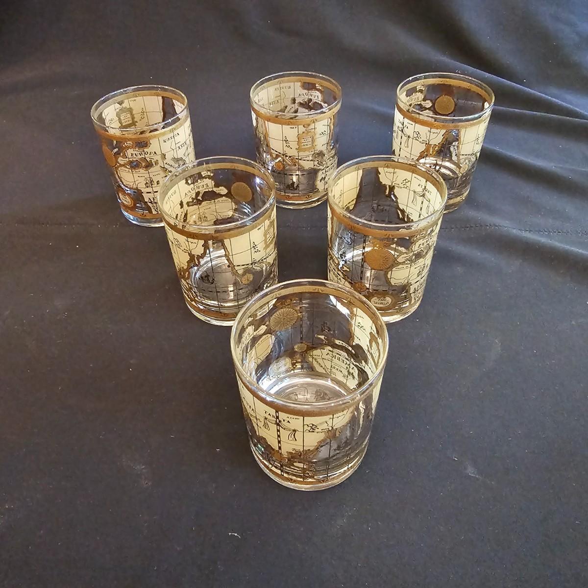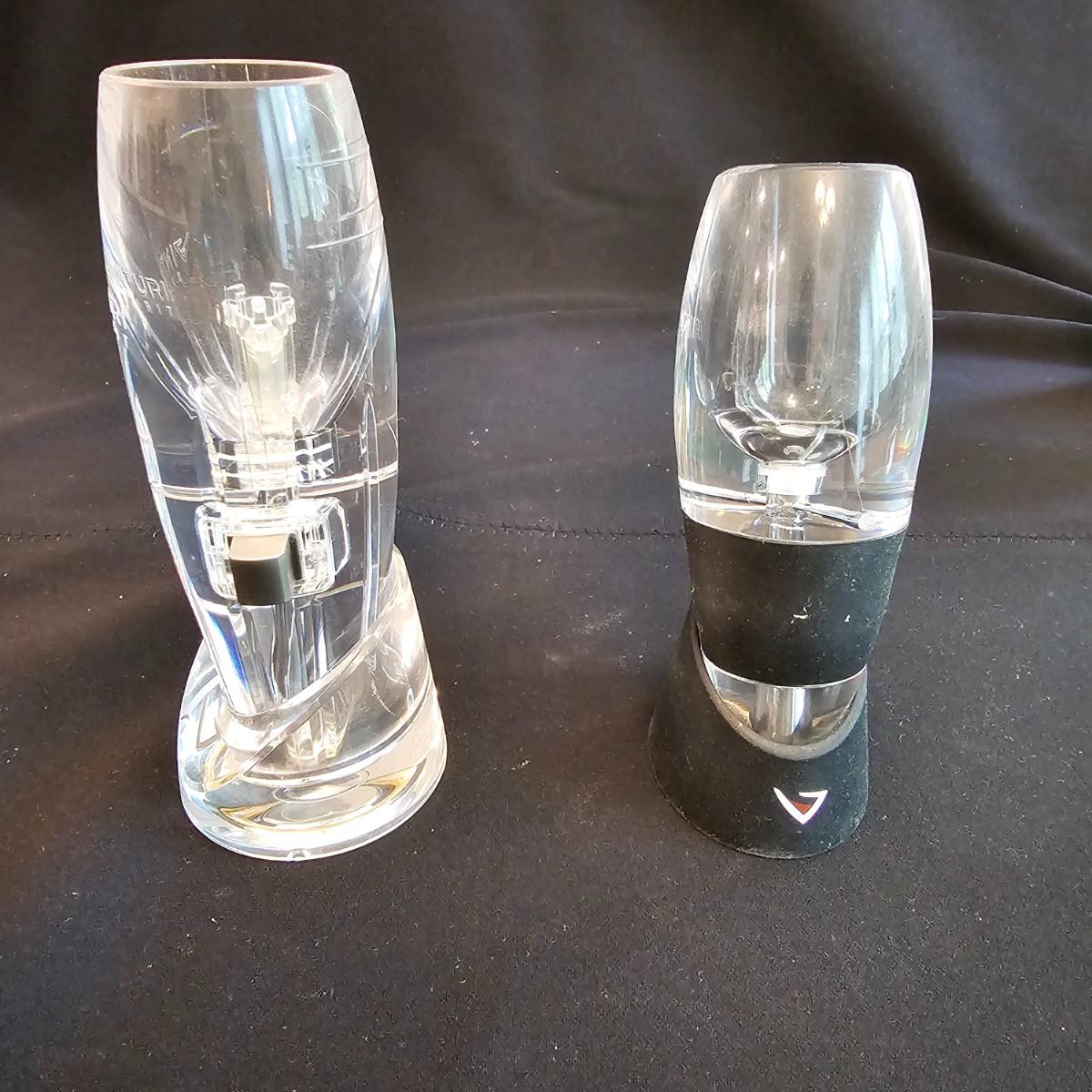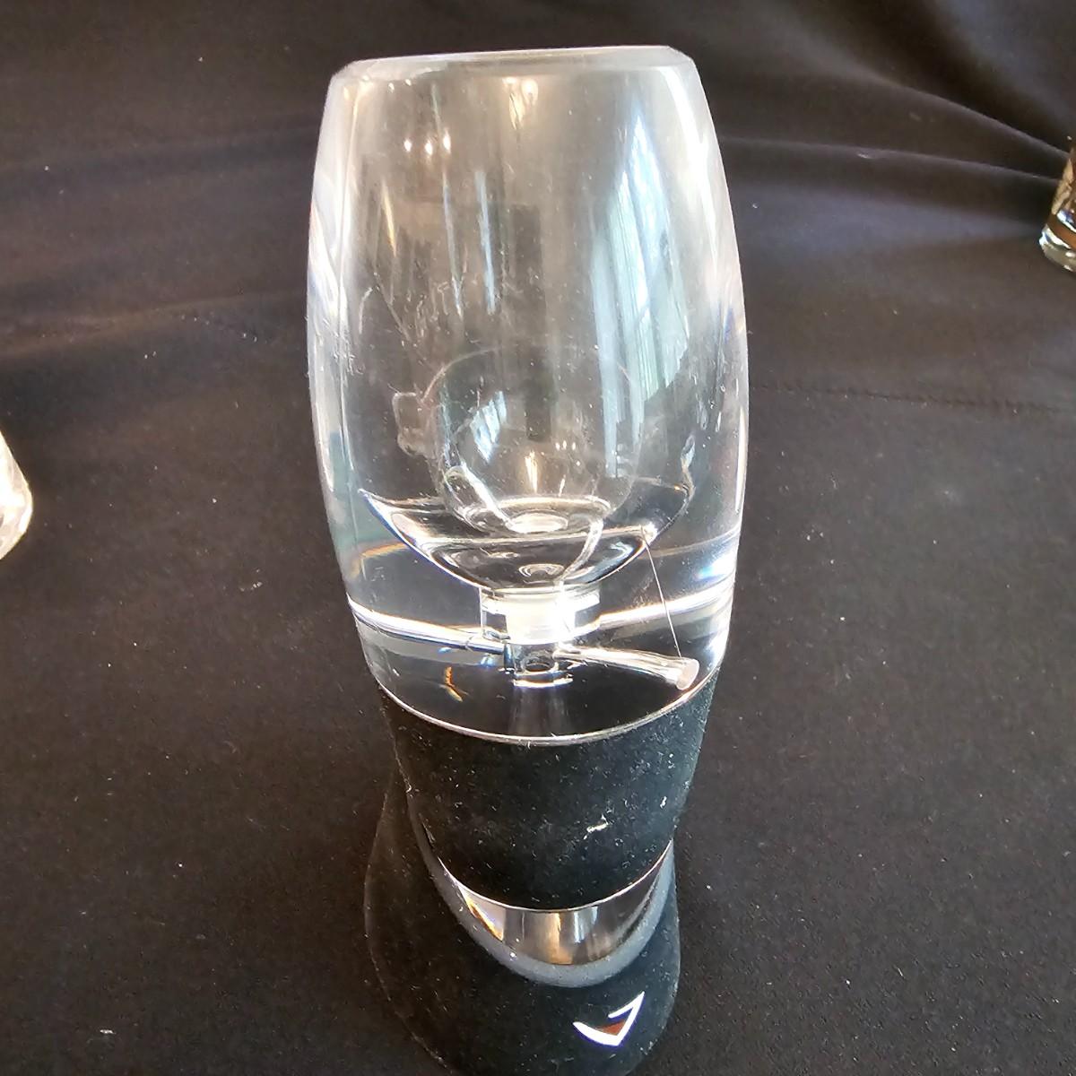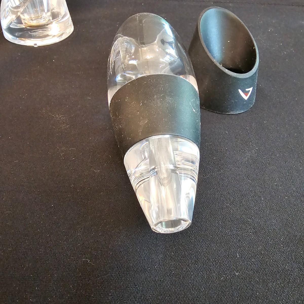 Bar glasses, a decanter and two Vinturi brand pieces for aerating wine. Glass decanter is by Simon Pearce, measures 4.5"D x 10.5"H. Set of six gold colored glasses have world maps on them, measure 3.25" x 4"H. A set of four clear glasses have four different mountain range impressions rising up from the bottom. See photos for details. Shipping available.