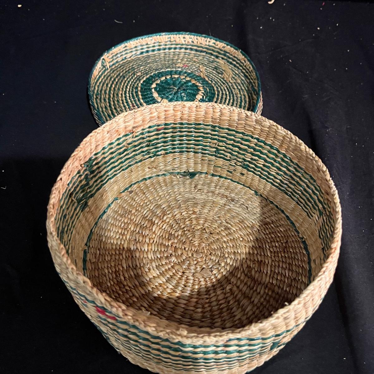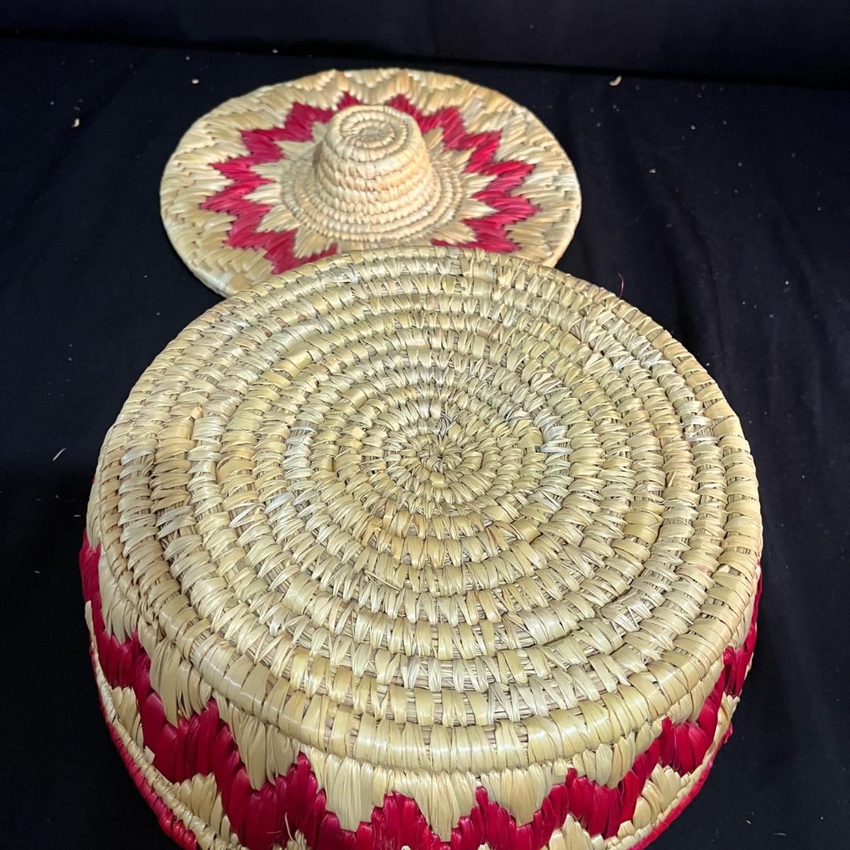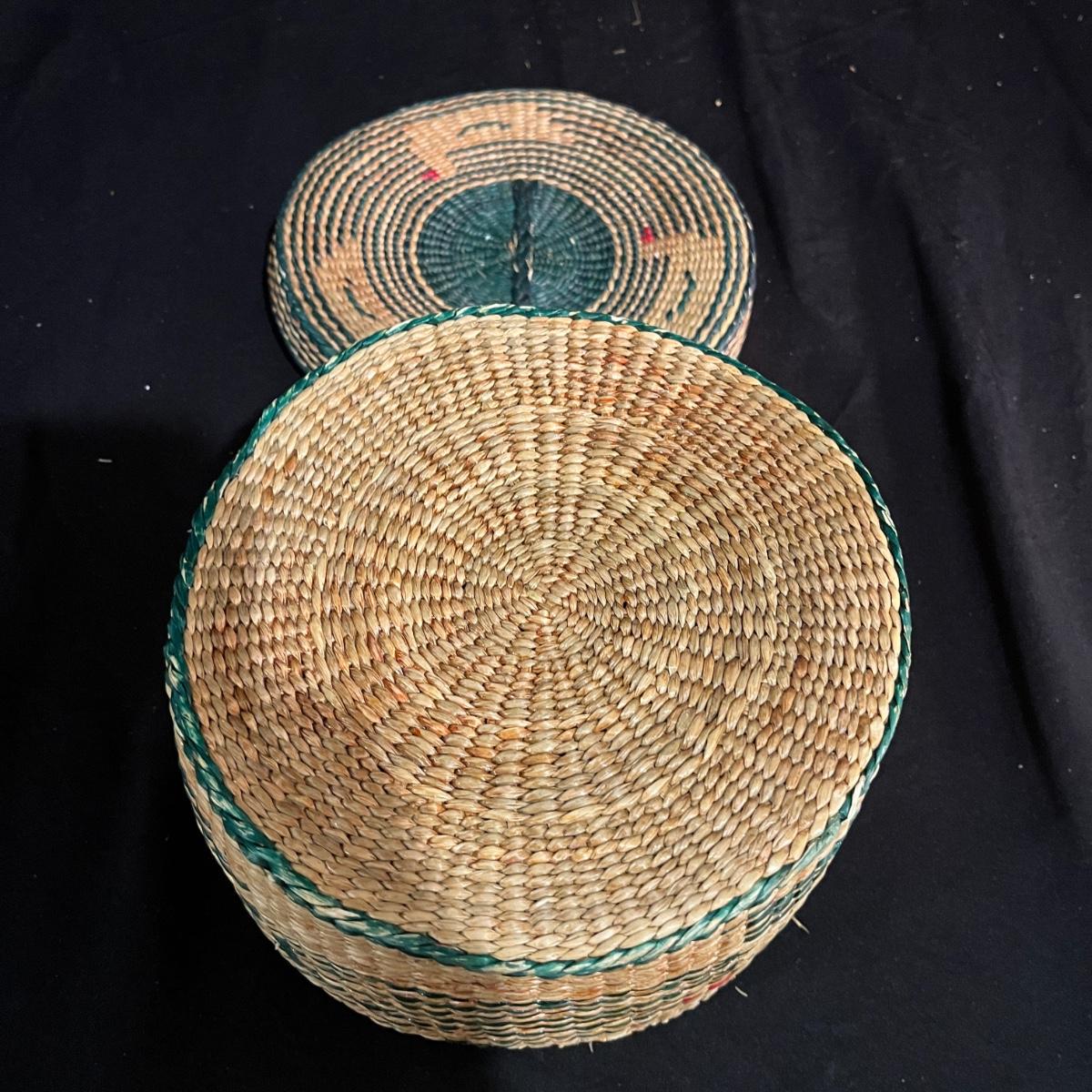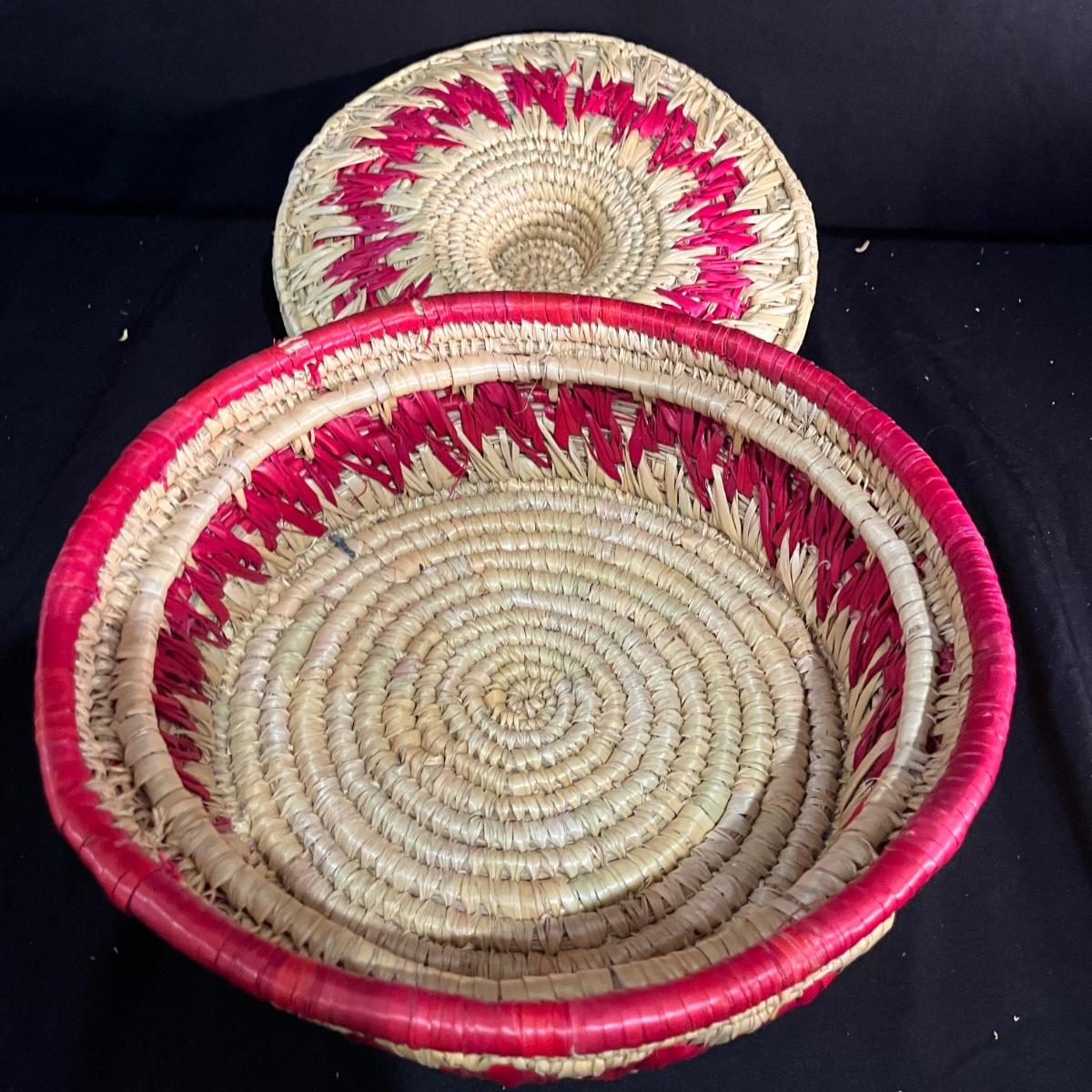 Lot includes a basket with lid, two woven trays, two woven baskets with lids and a tall basket that appears to be a fish catcher. Trays measure 16”D. Trays and basket with red have some fraying, see pictures.