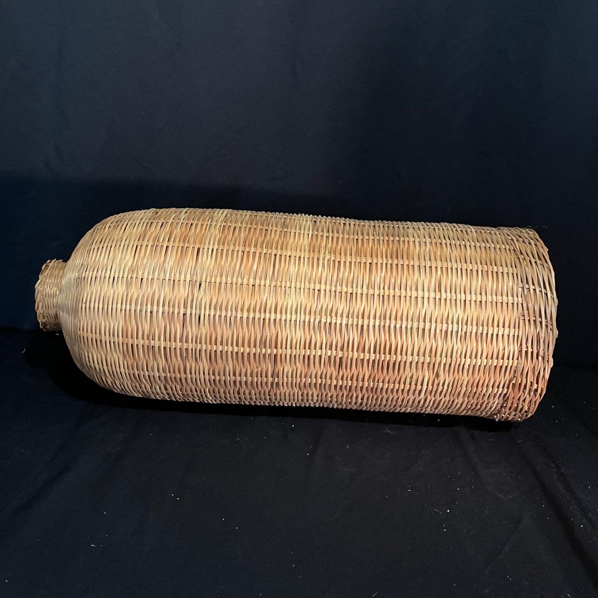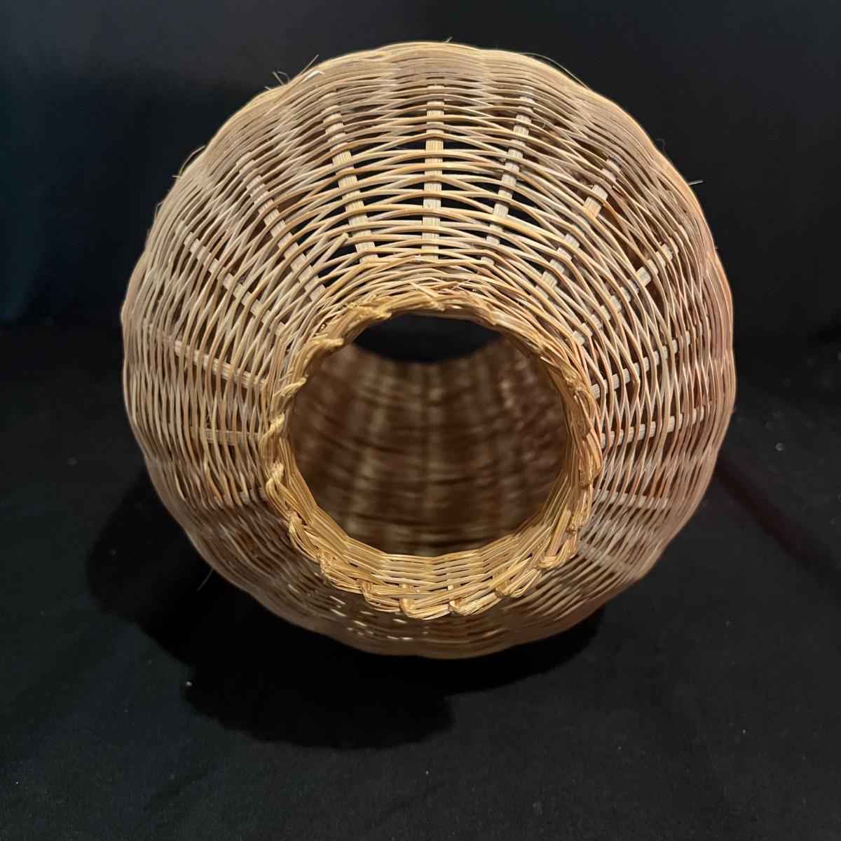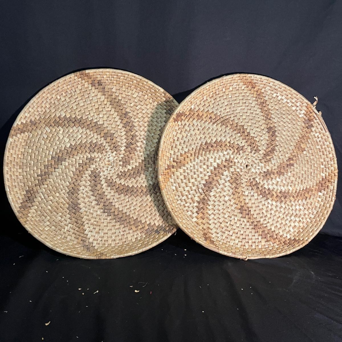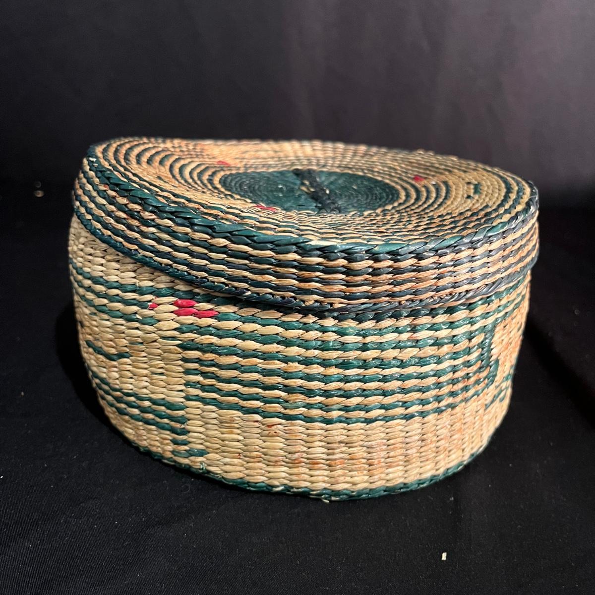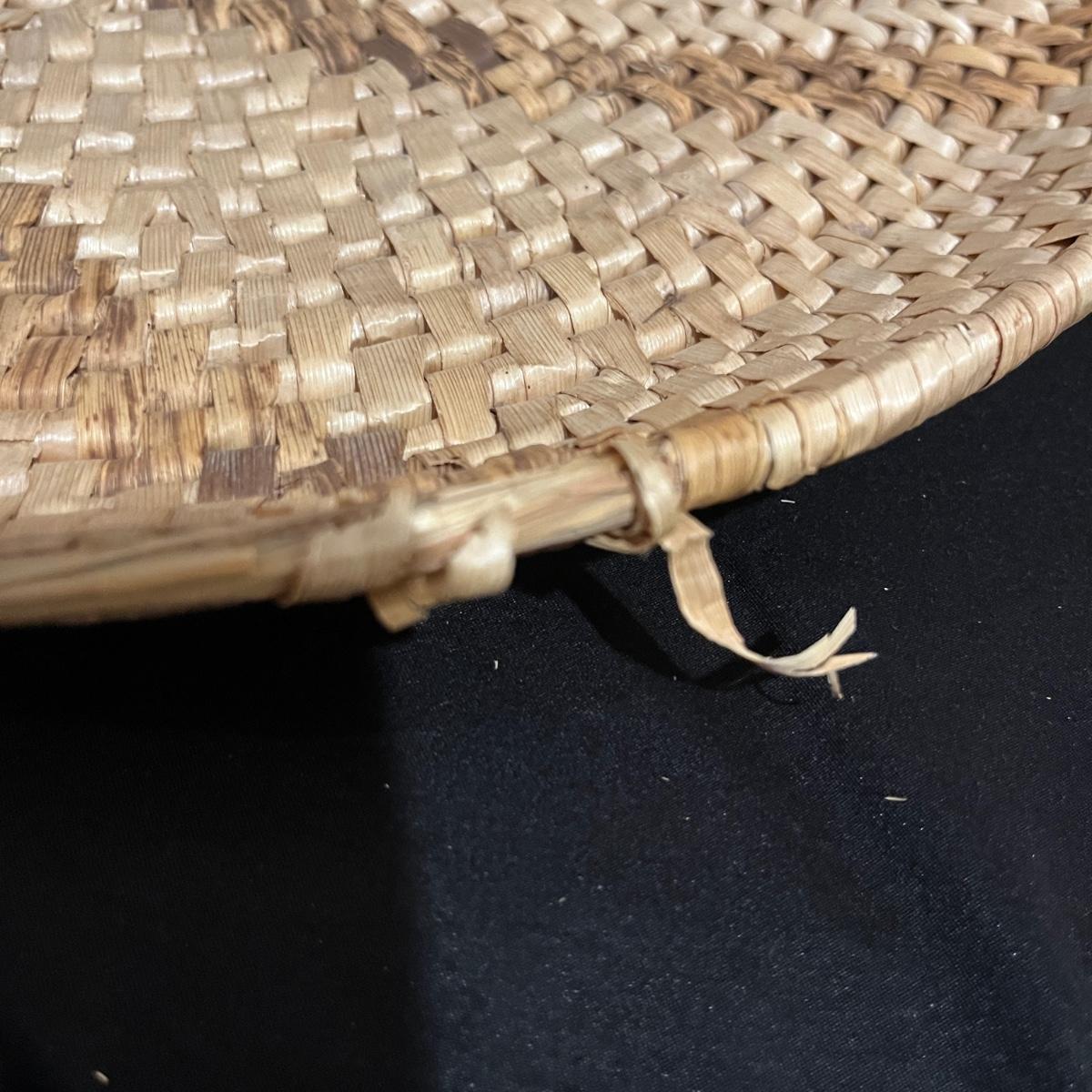 Lot includes a basket with lid, two woven trays, two woven baskets with lids and a tall basket that appears to be a fish catcher. Trays measure 16”D. Trays and basket with red have some fraying, see pictures.