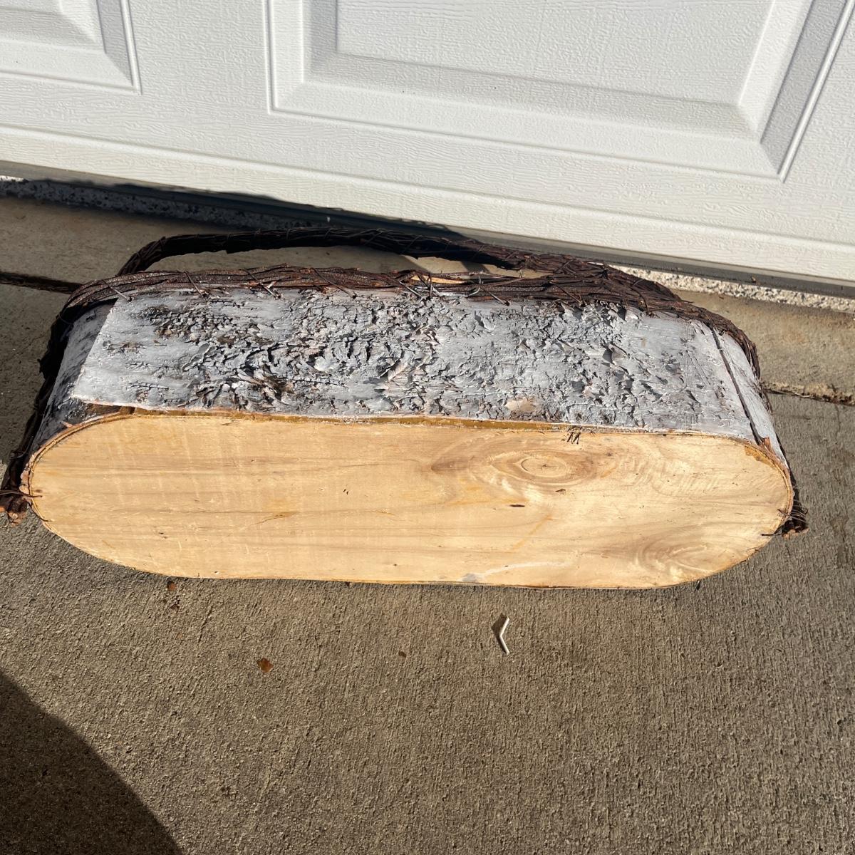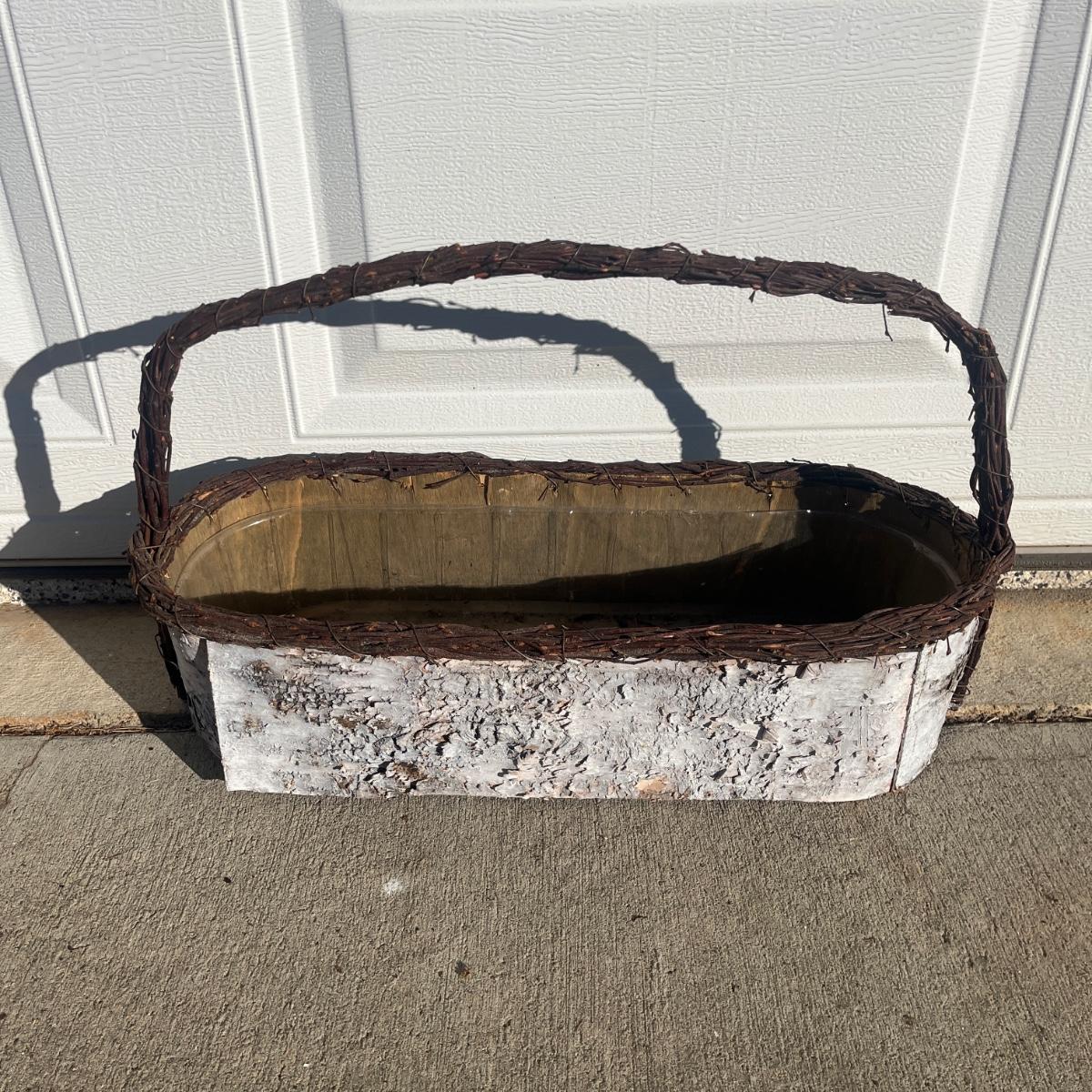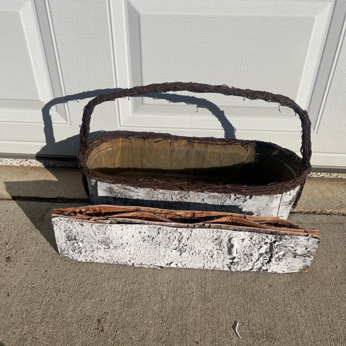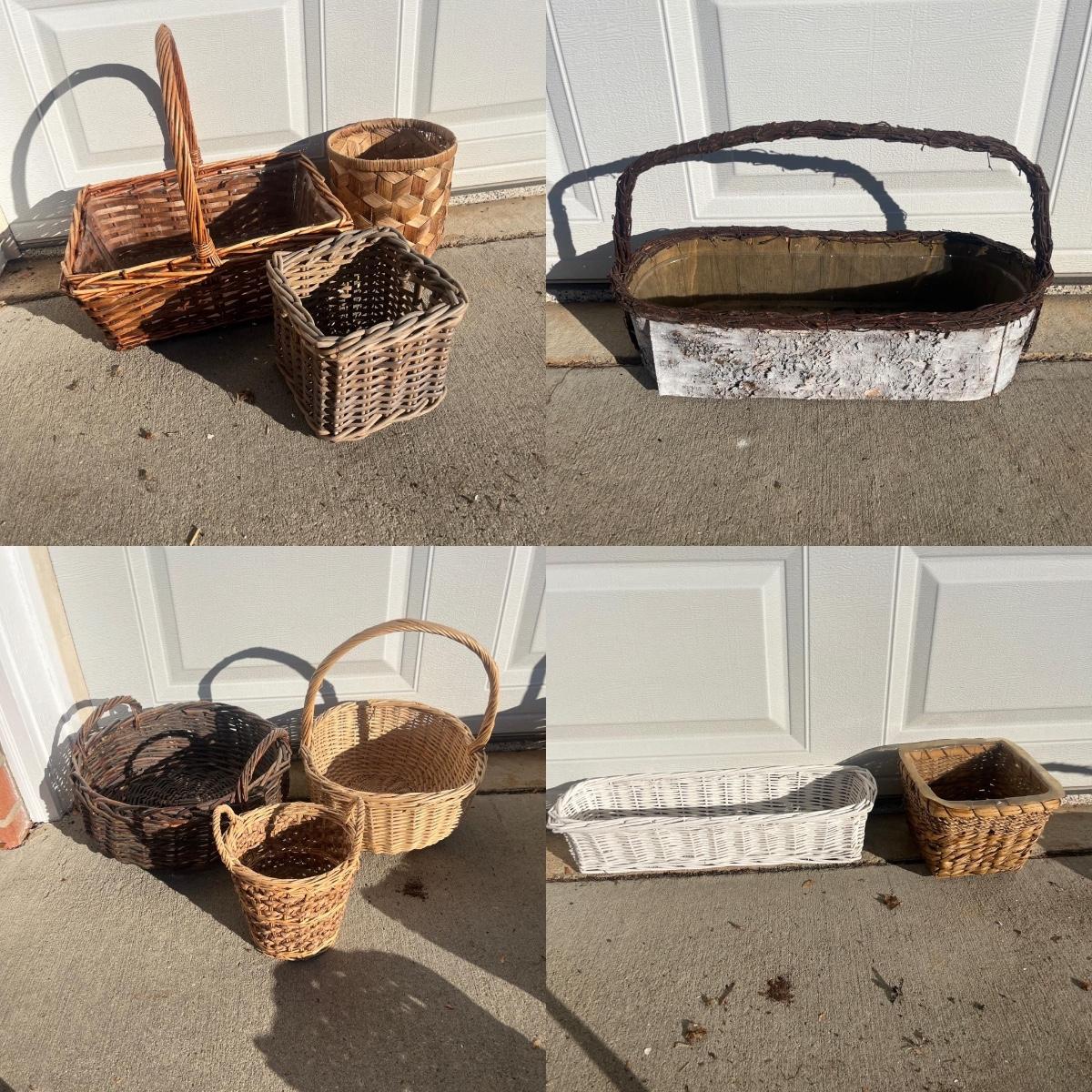 Lot includes a collection of 11 woven baskets in a variety of shapes and sizes. Also includes a basket made from wood and bark with a matching five bud vase. Largest basket measures 14” x 17” x 17”H including handle.