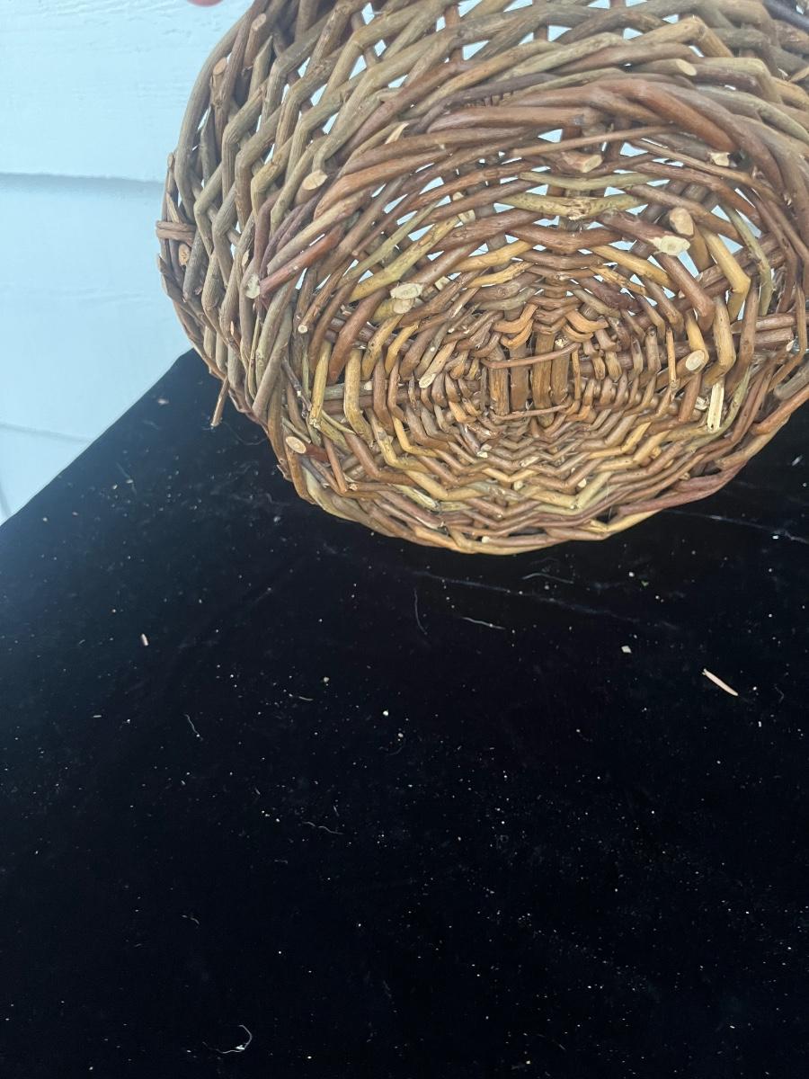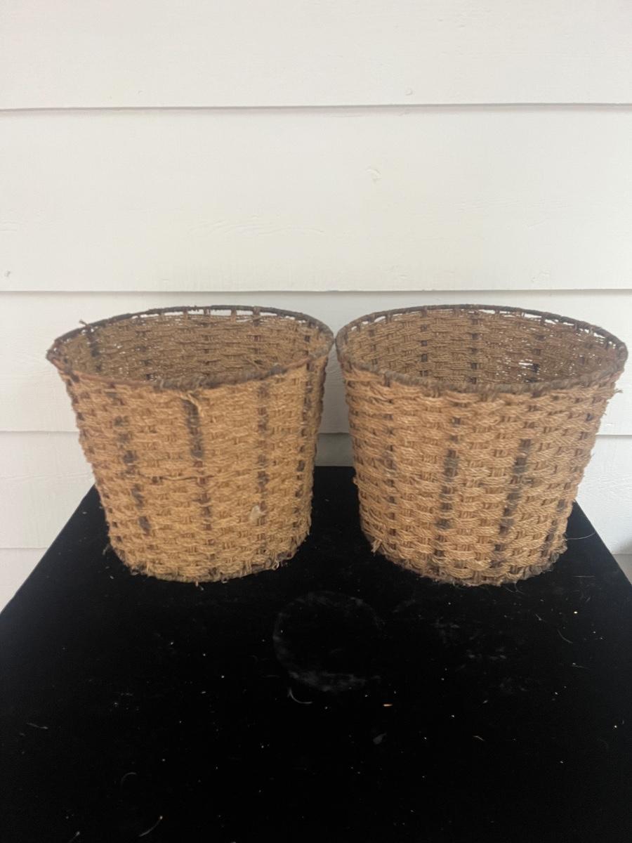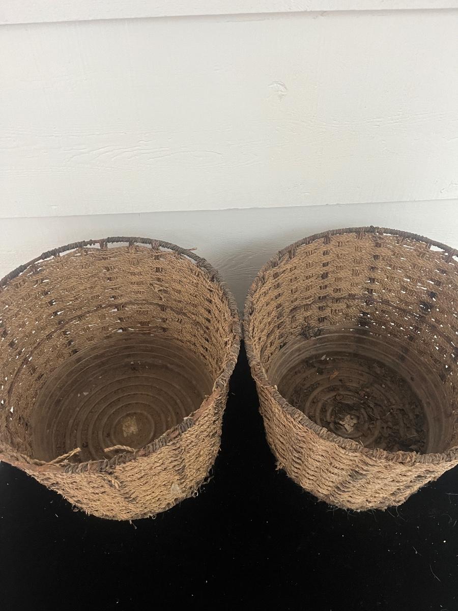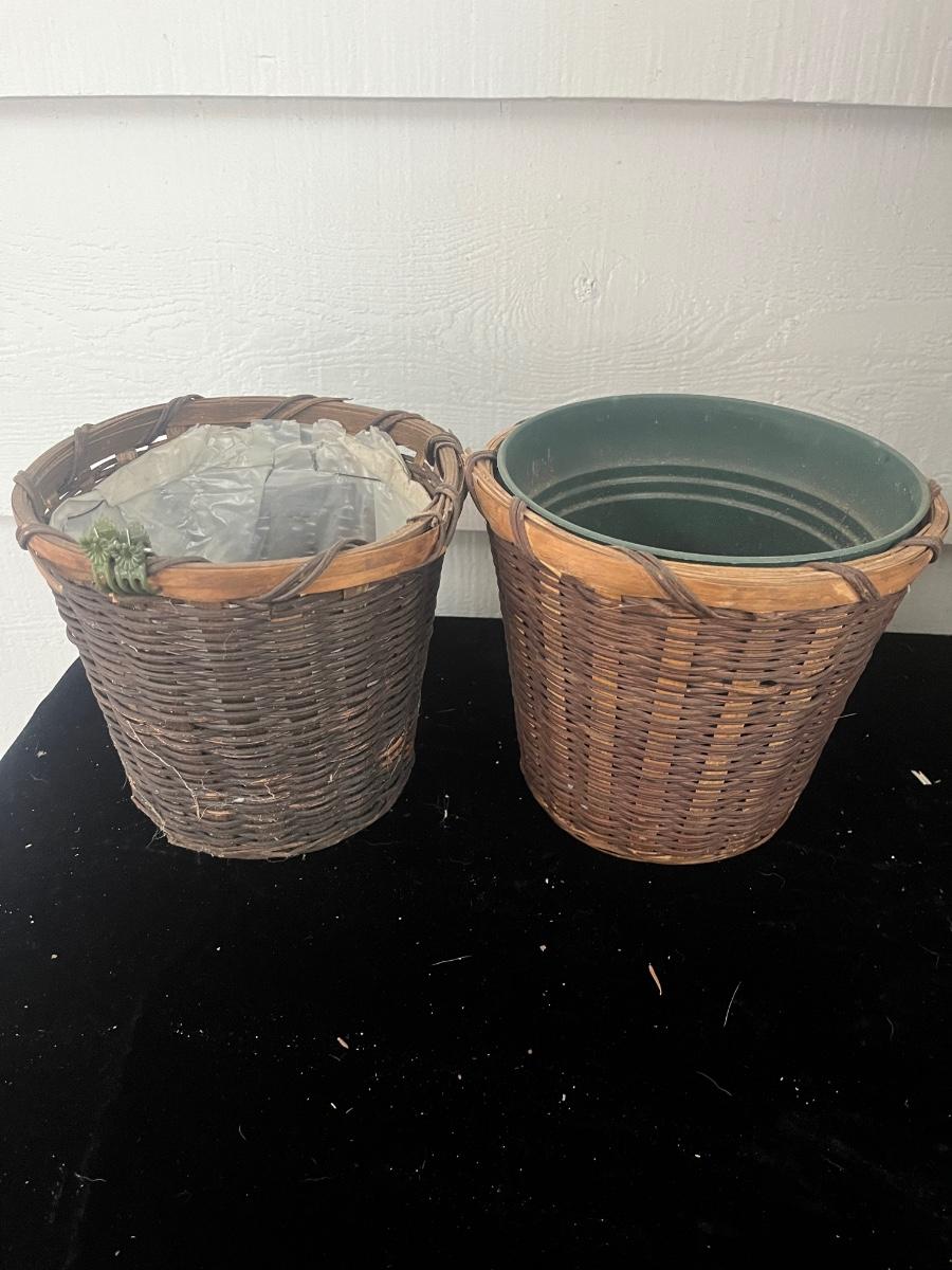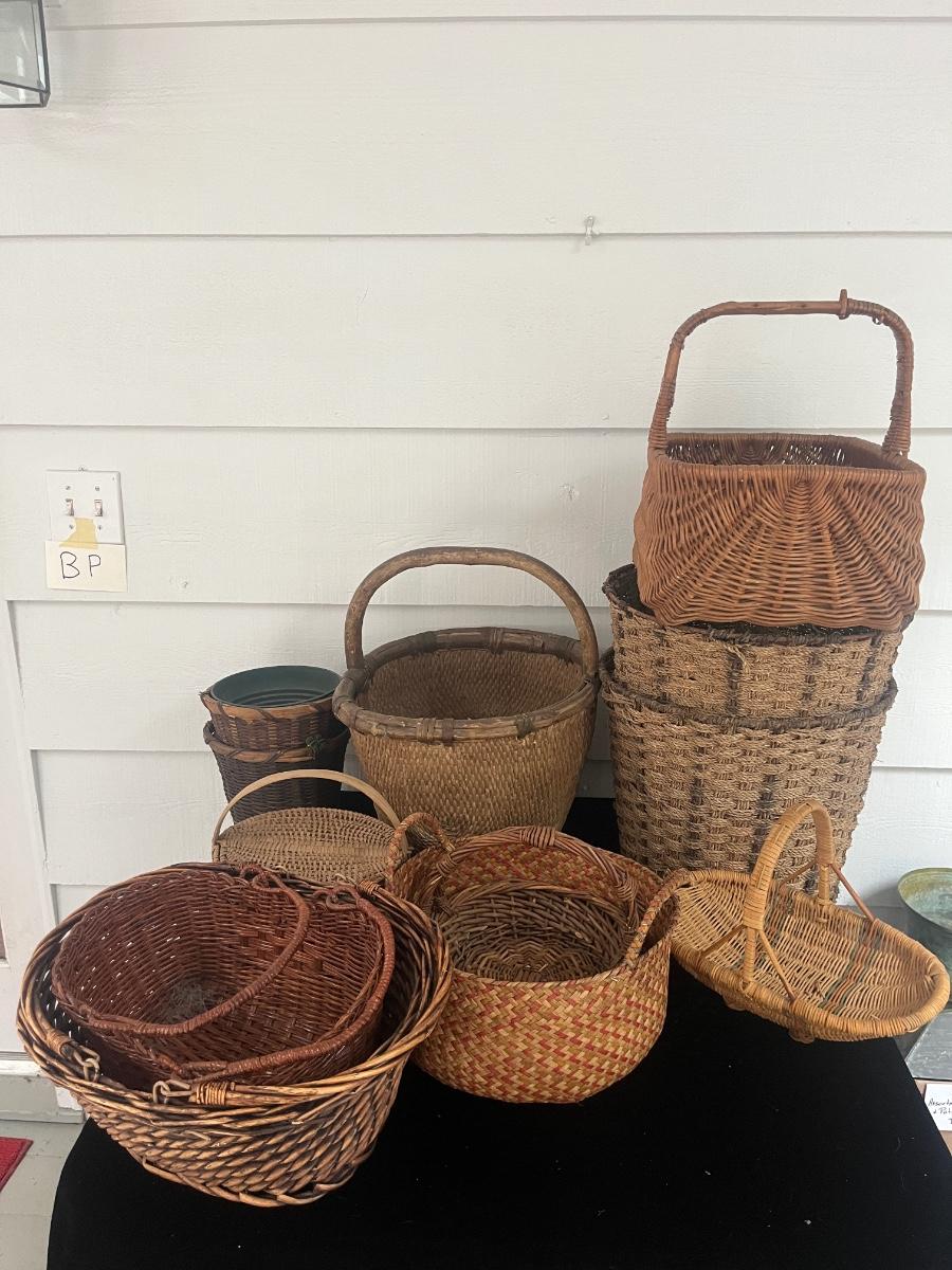 Lot includes two small and two large basket planters and a large assortment of woven baskets in a variety of styles and sizes. One has a wood handle and frame. Several are hand made and many are weathered and faded. Largest plant pot measures 15”D x 12”H. Plant pot has some loose or missing pieces on top, see pictures.