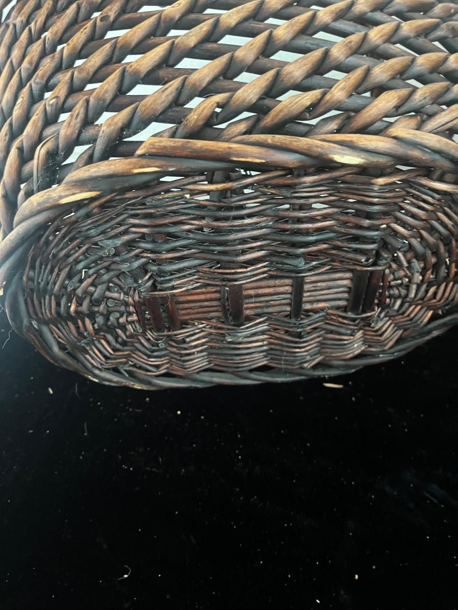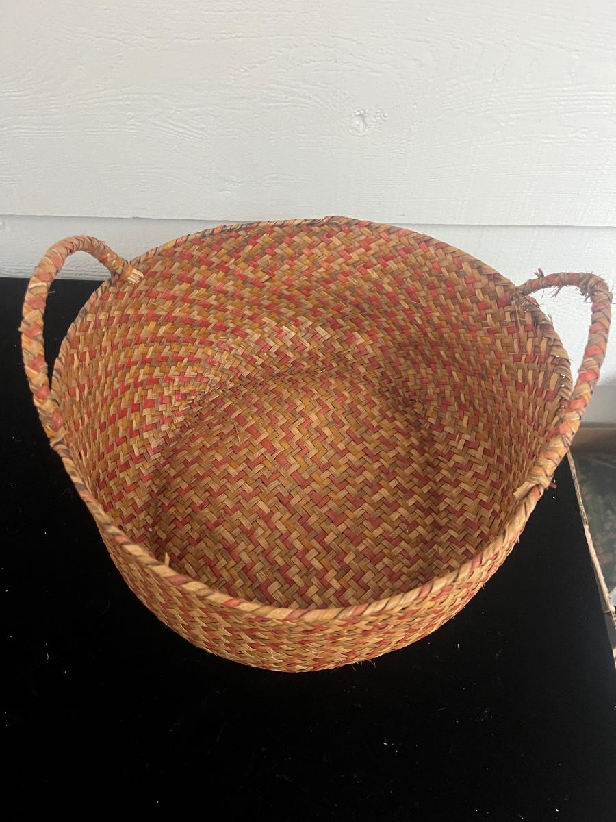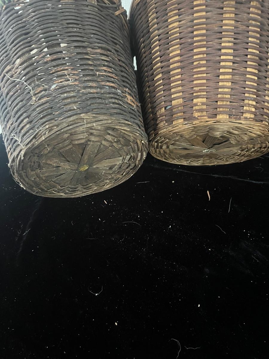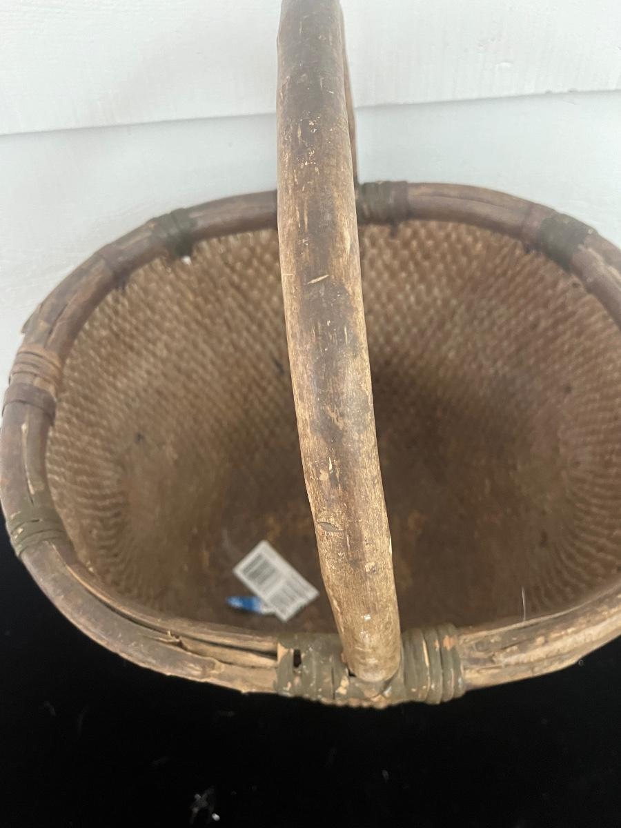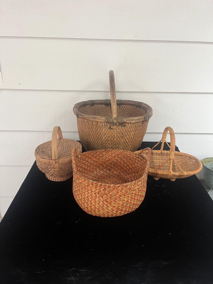 Lot includes two small and two large basket planters and a large assortment of woven baskets in a variety of styles and sizes. One has a wood handle and frame. Several are hand made and many are weathered and faded. Largest plant pot measures 15”D x 12”H. Plant pot has some loose or missing pieces on top, see pictures.
