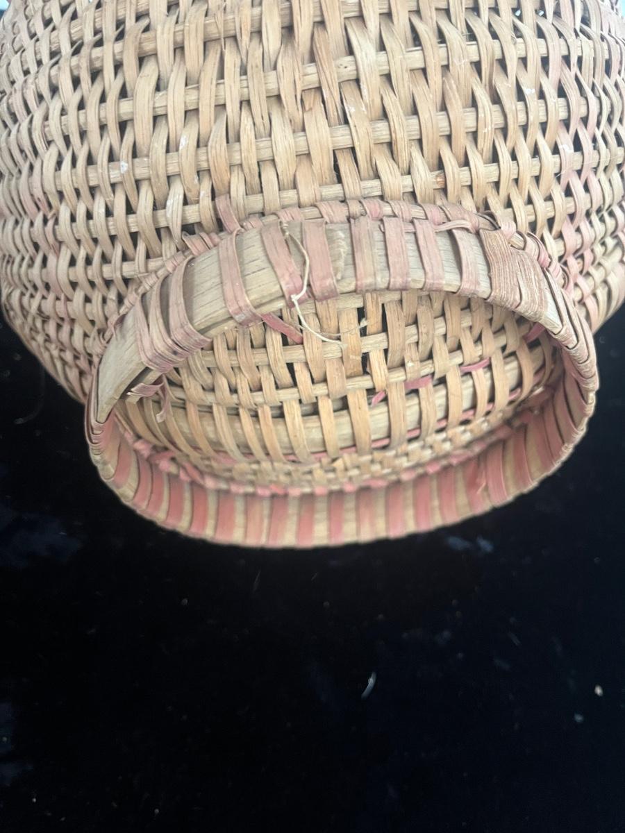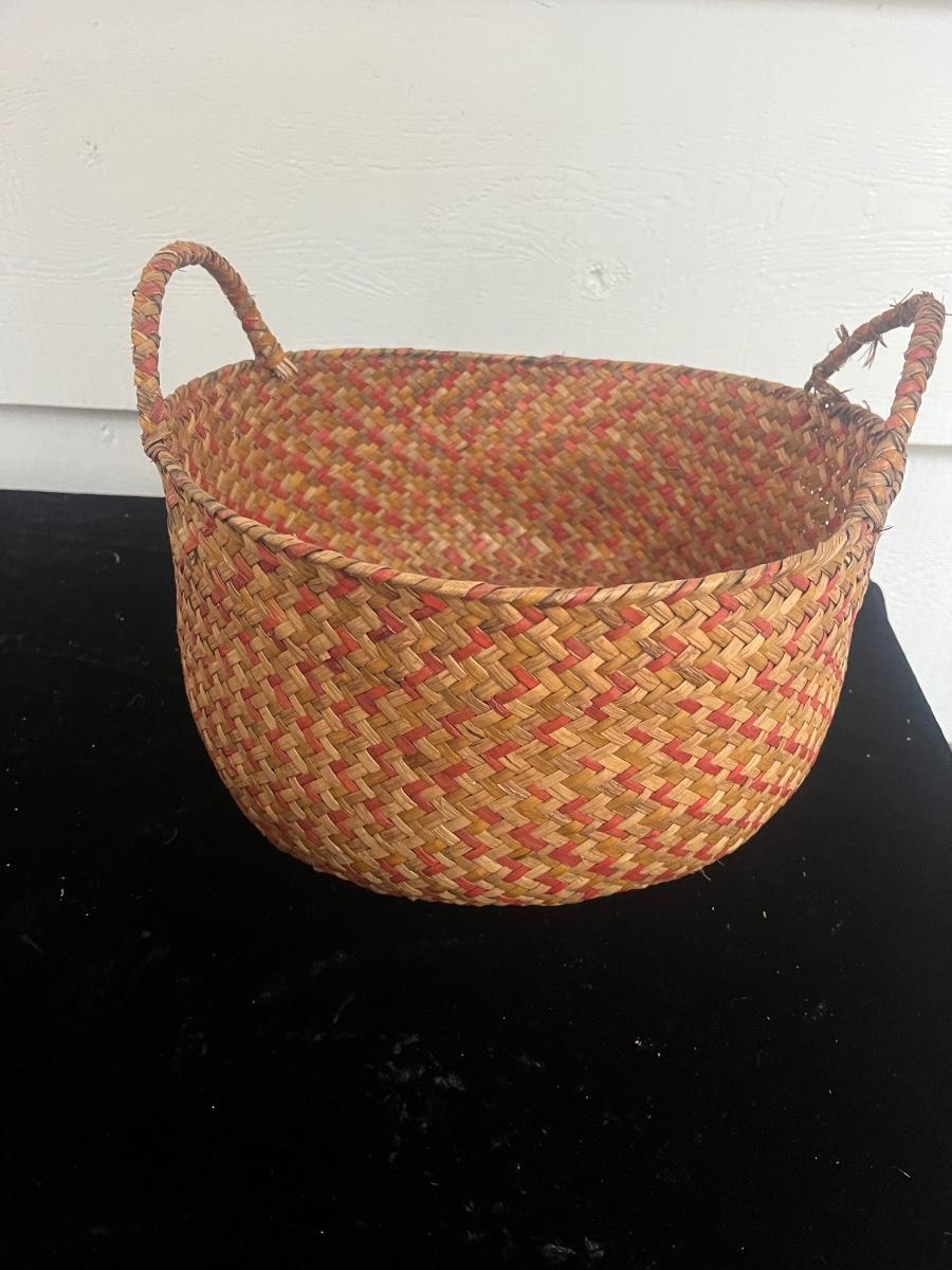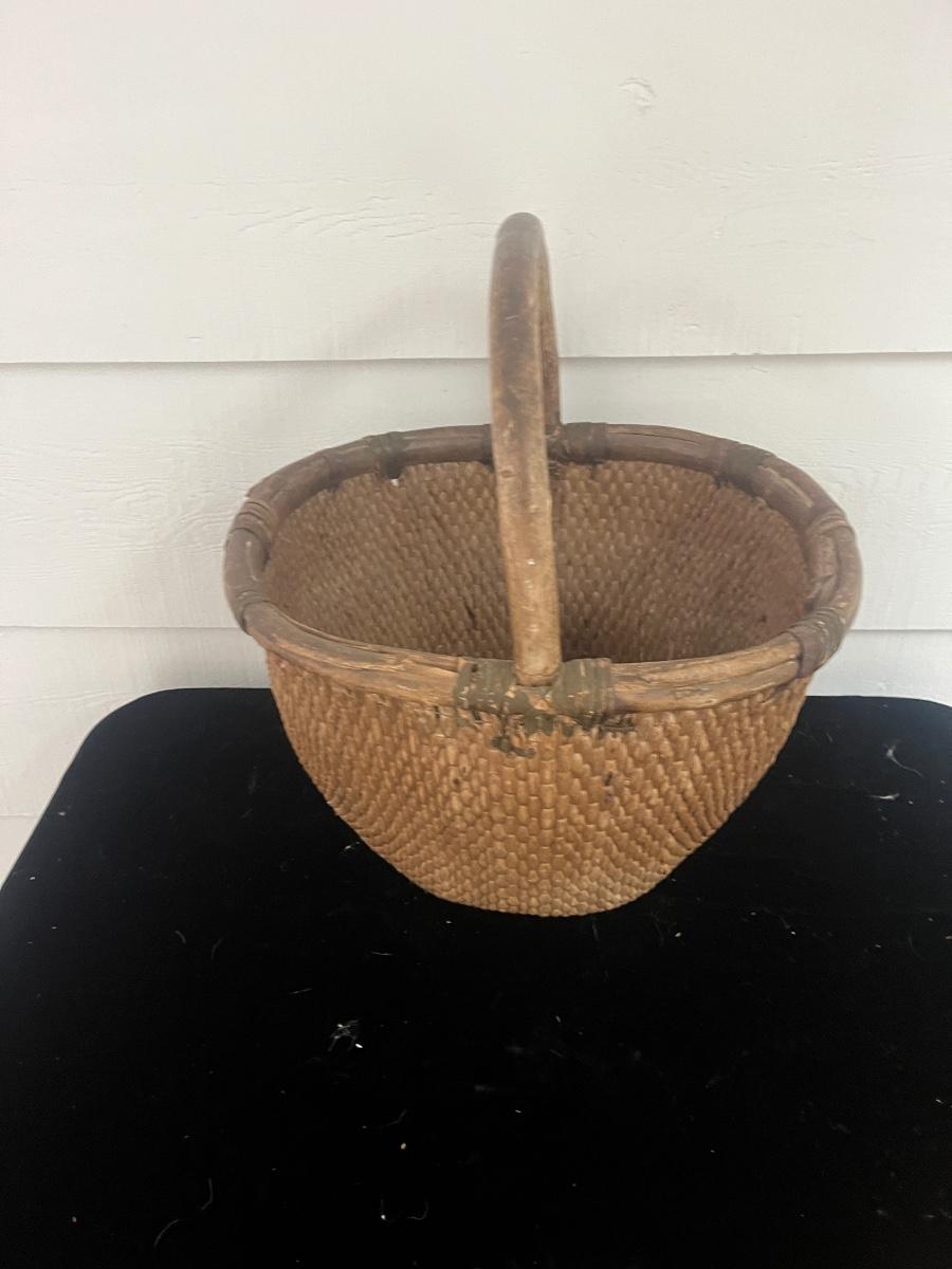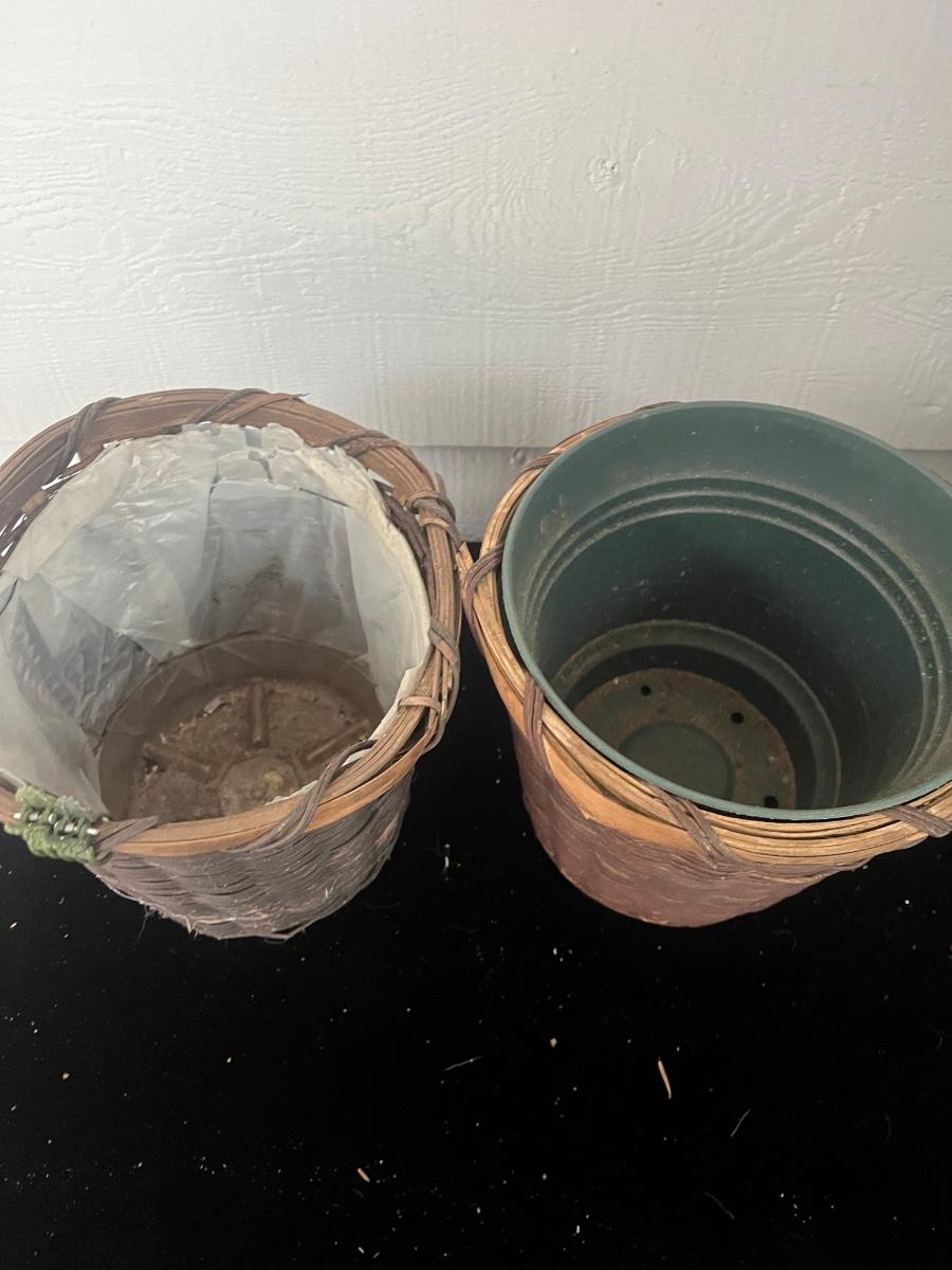 Lot includes two small and two large basket planters and a large assortment of woven baskets in a variety of styles and sizes. One has a wood handle and frame. Several are hand made and many are weathered and faded. Largest plant pot measures 15”D x 12”H. Plant pot has some loose or missing pieces on top, see pictures.