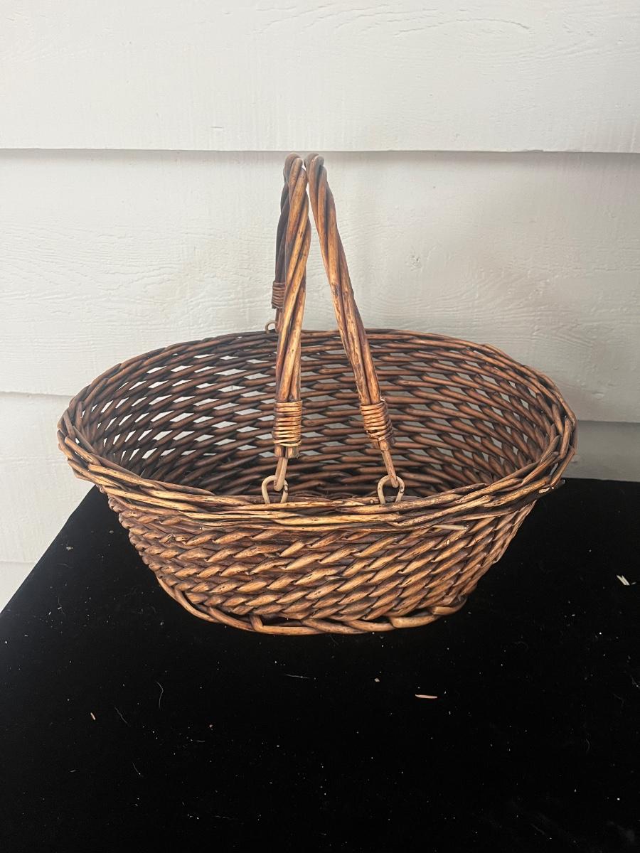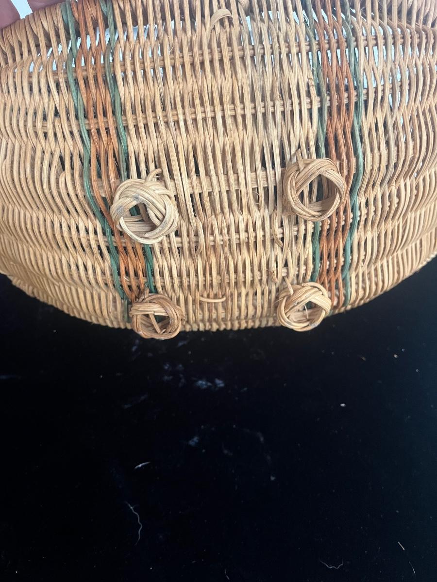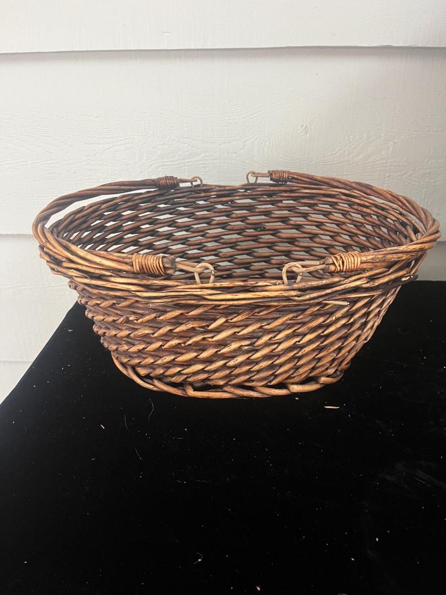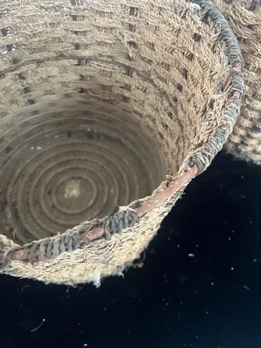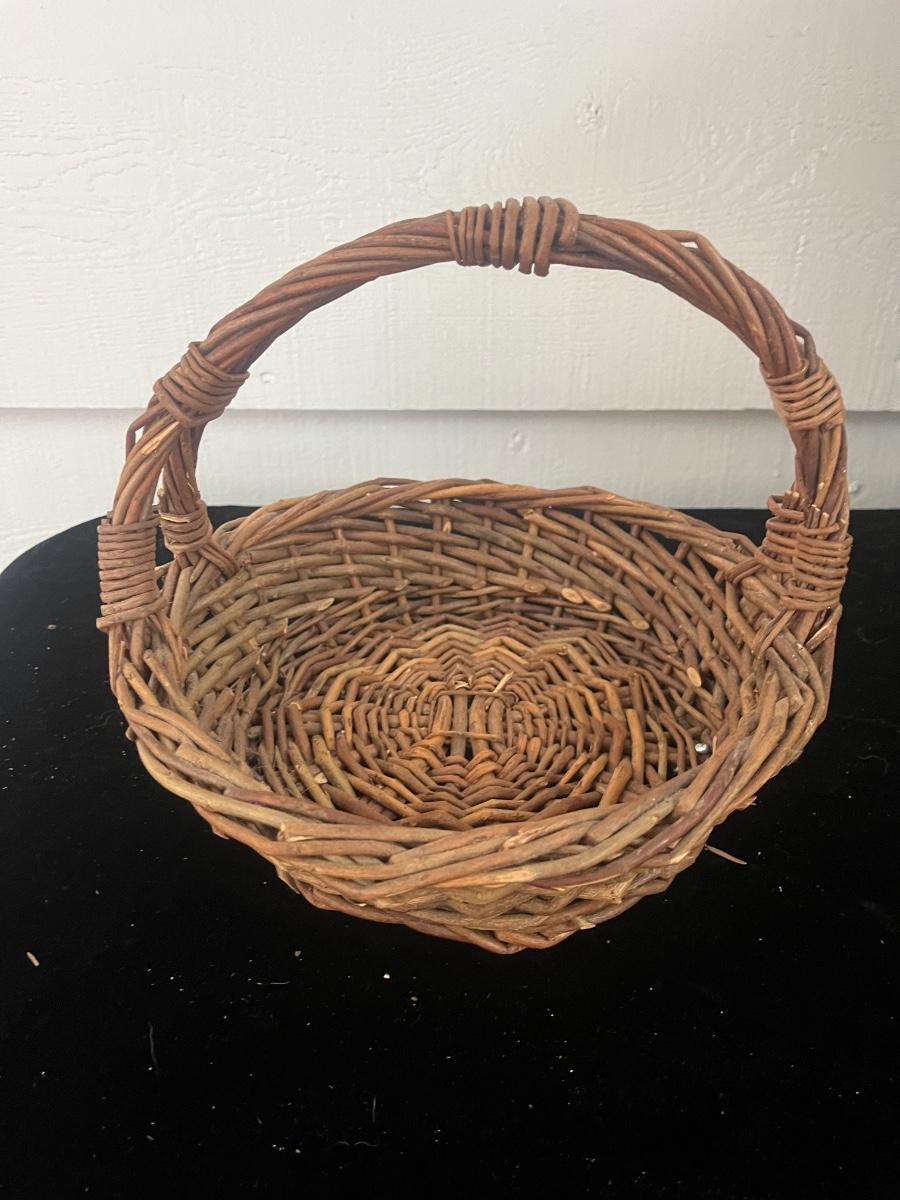 Lot includes two small and two large basket planters and a large assortment of woven baskets in a variety of styles and sizes. One has a wood handle and frame. Several are hand made and many are weathered and faded. Largest plant pot measures 15”D x 12”H. Plant pot has some loose or missing pieces on top, see pictures.