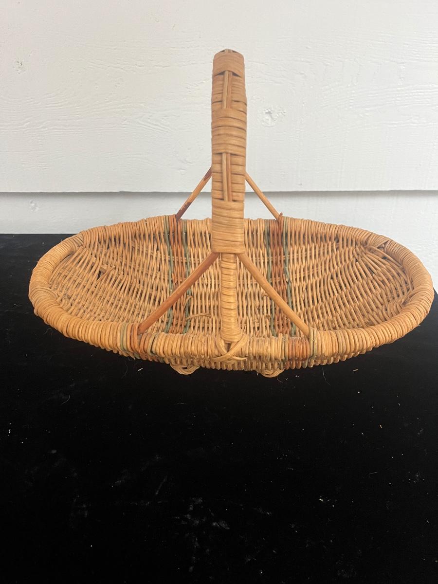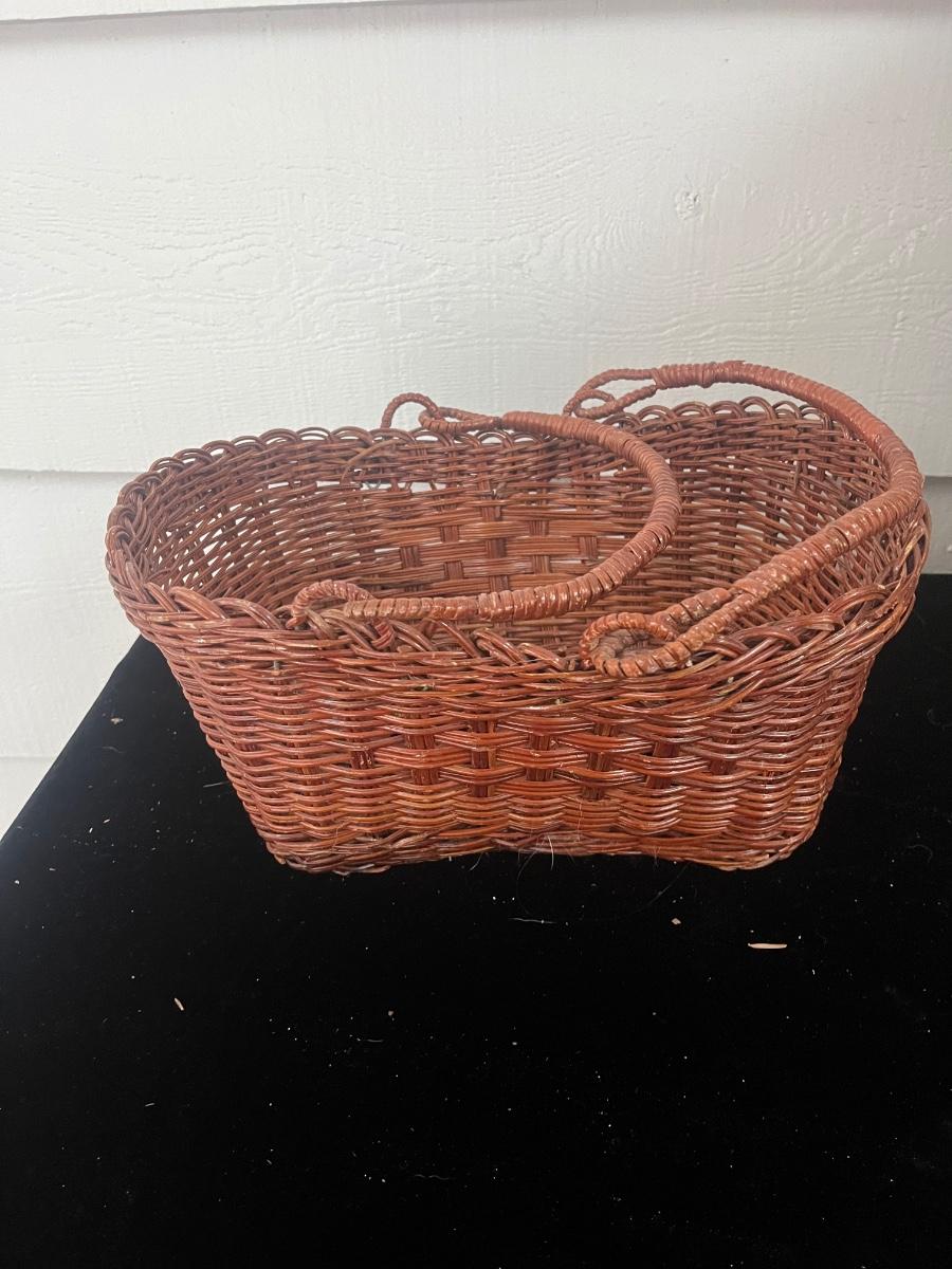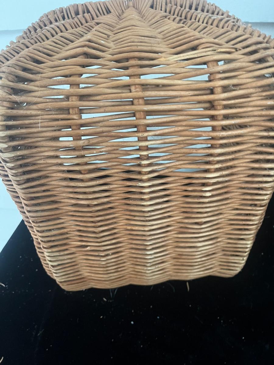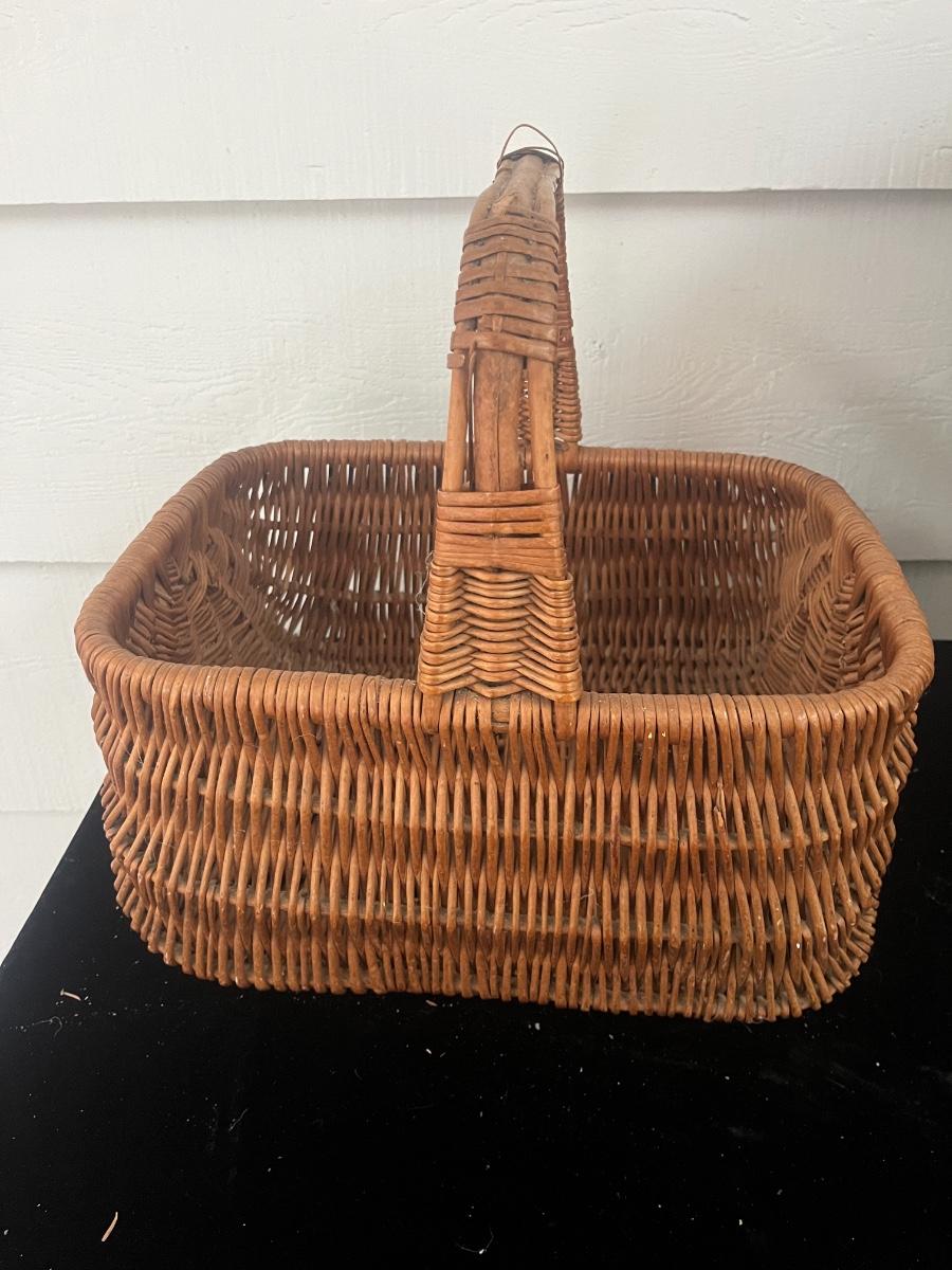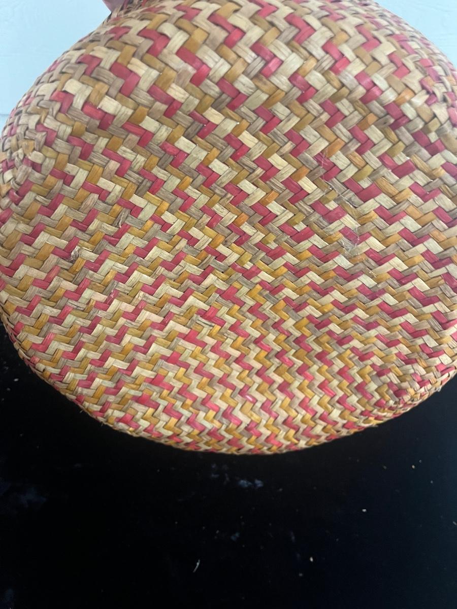 Lot includes two small and two large basket planters and a large assortment of woven baskets in a variety of styles and sizes. One has a wood handle and frame. Several are hand made and many are weathered and faded. Largest plant pot measures 15”D x 12”H. Plant pot has some loose or missing pieces on top, see pictures.