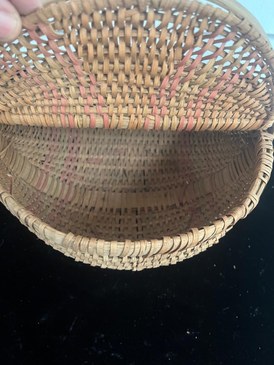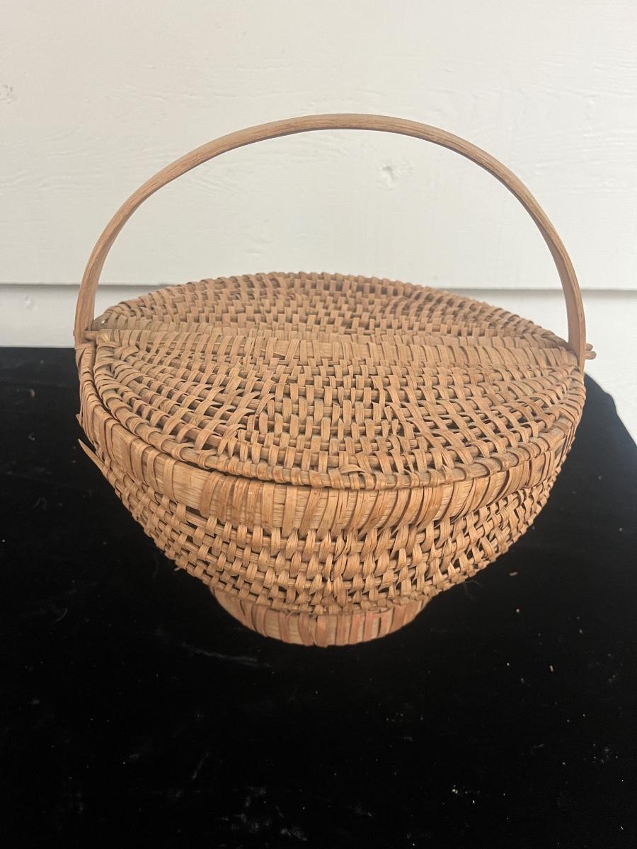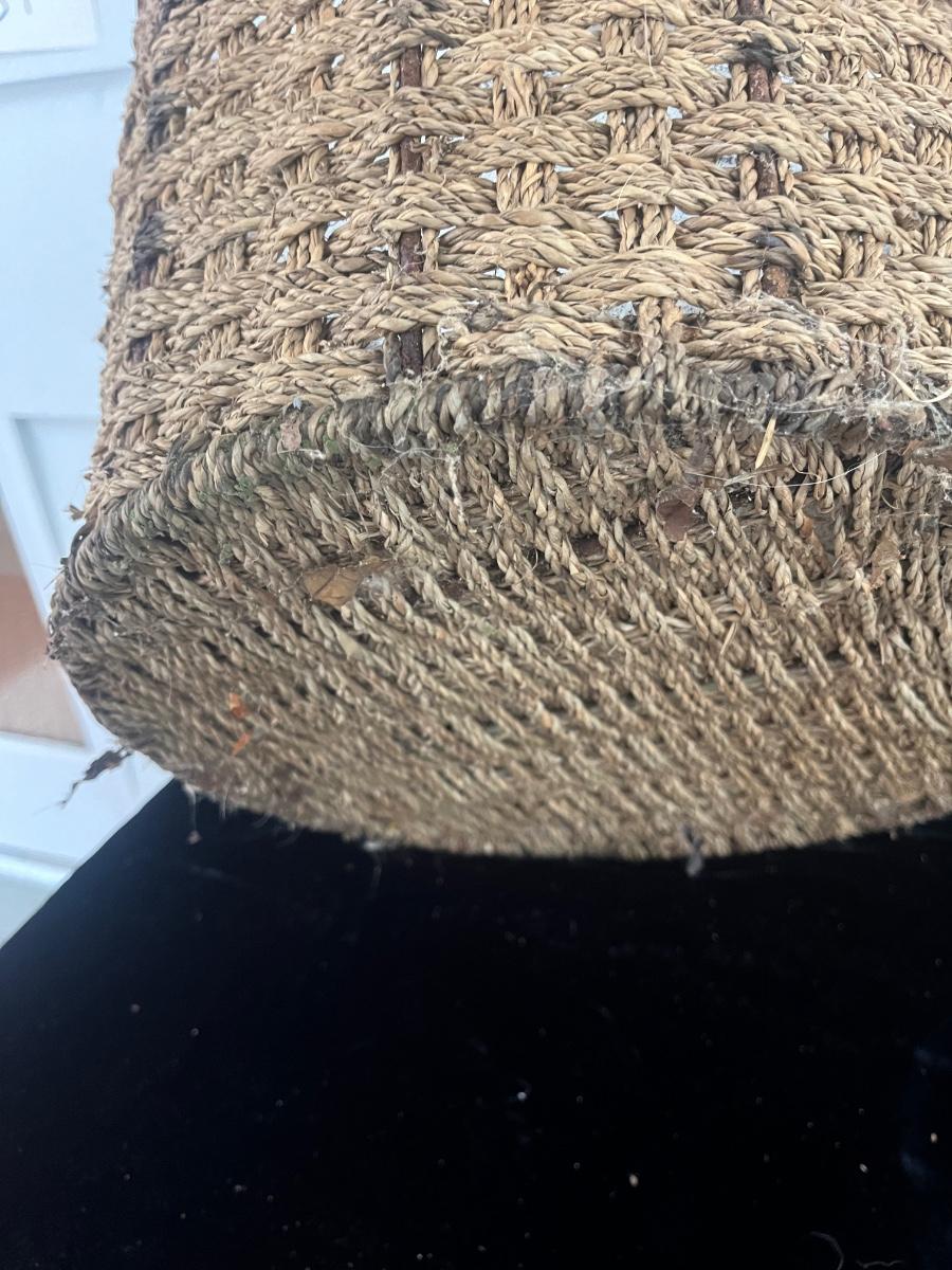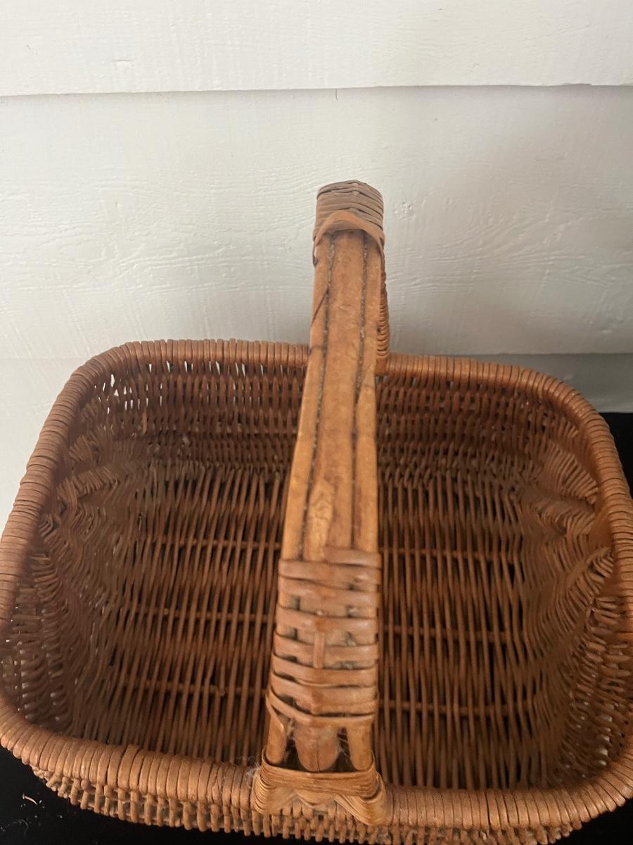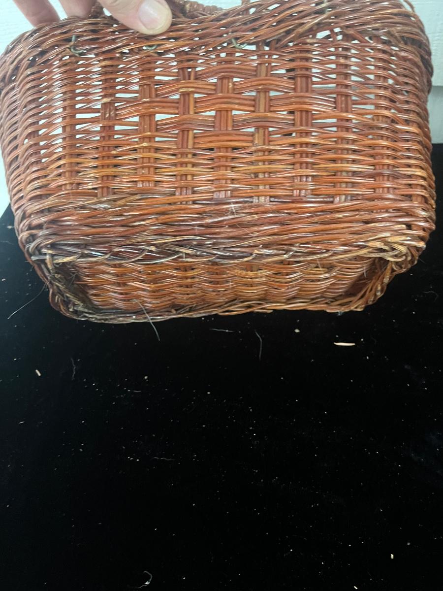 Lot includes two small and two large basket planters and a large assortment of woven baskets in a variety of styles and sizes. One has a wood handle and frame. Several are hand made and many are weathered and faded. Largest plant pot measures 15”D x 12”H. Plant pot has some loose or missing pieces on top, see pictures.