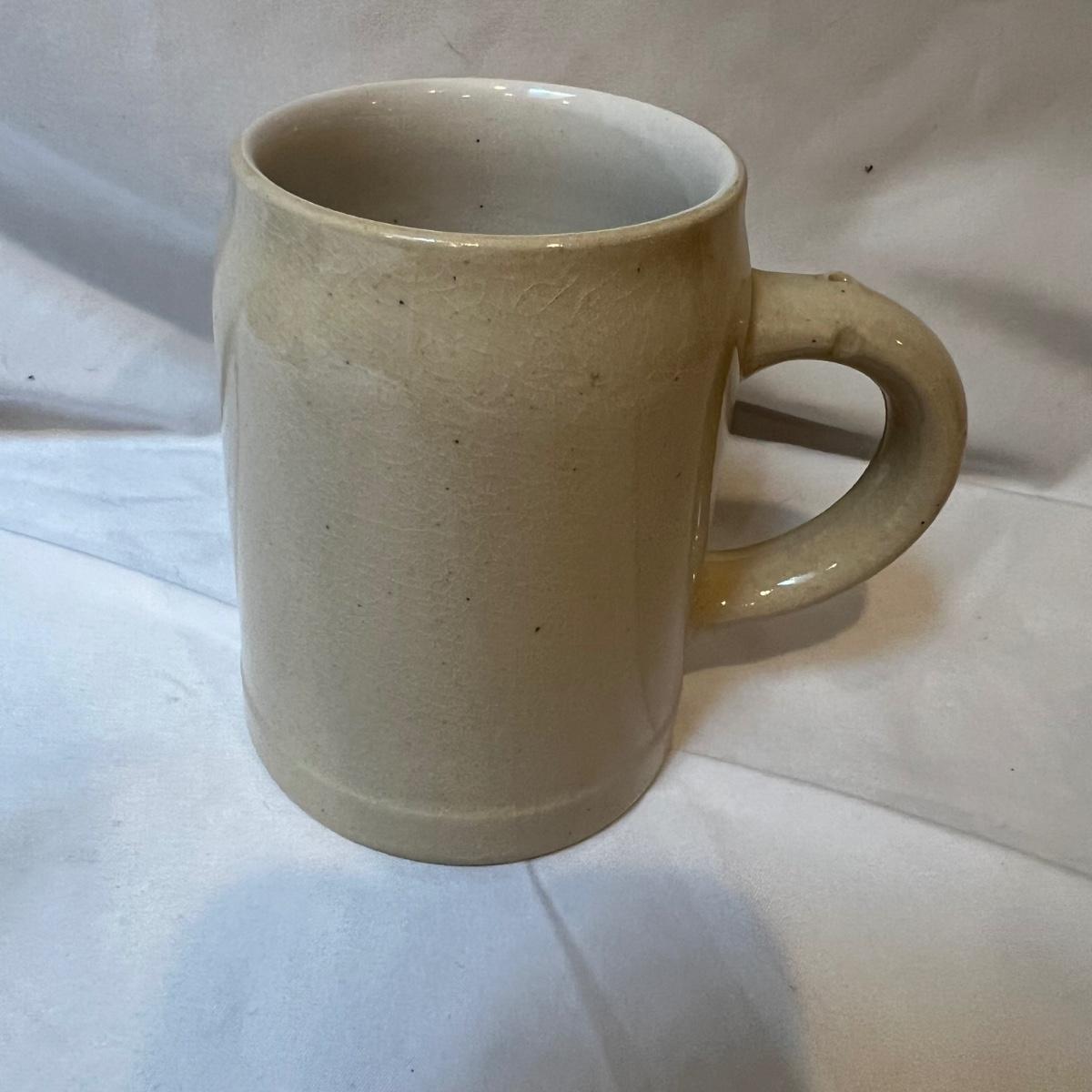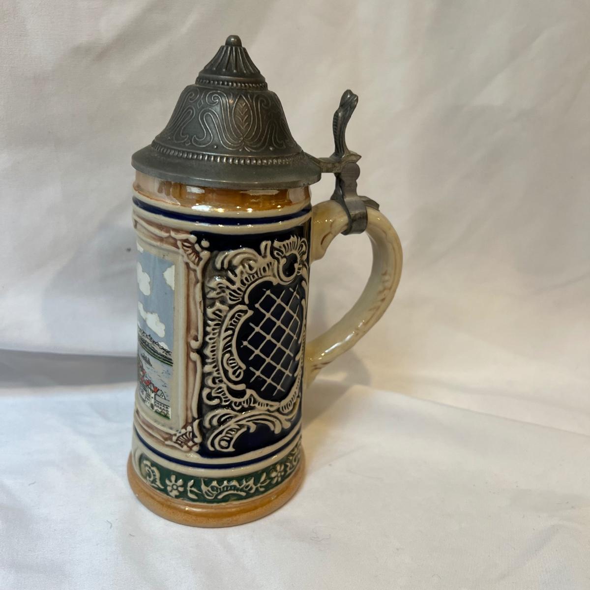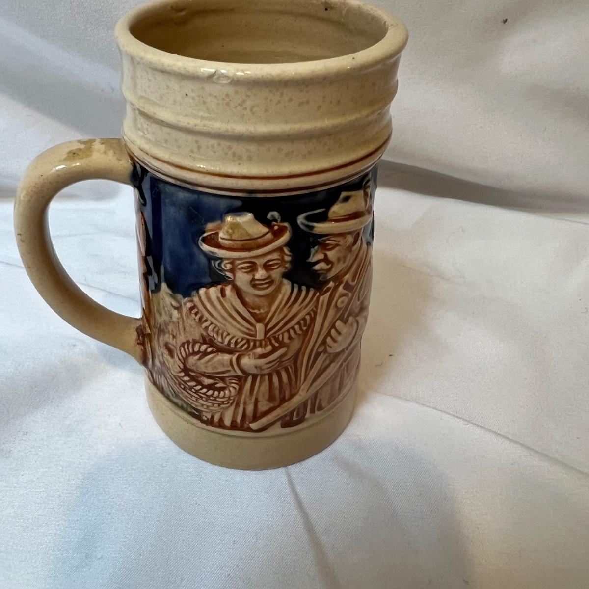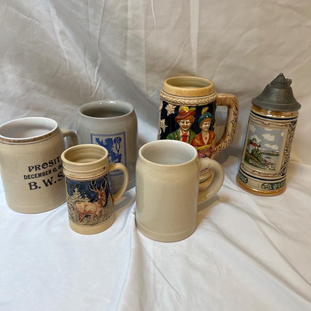 A collection of six ceramic beer steins. The largest measuring 3”D x 7”H and the smallest 2”D x 4”H.