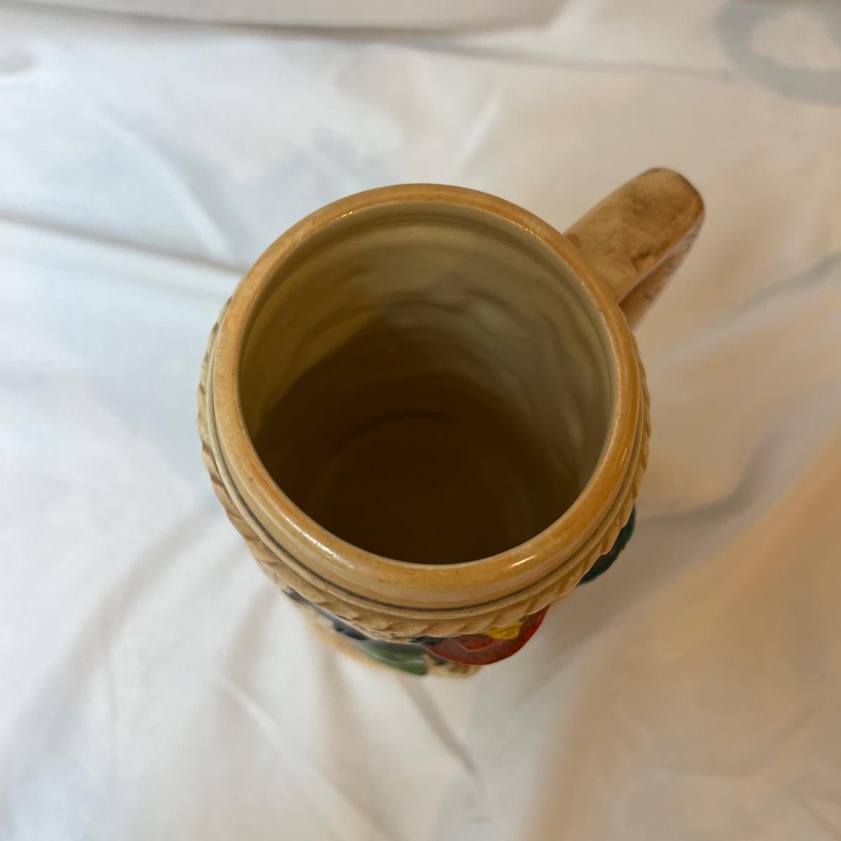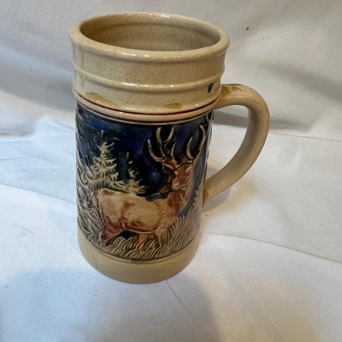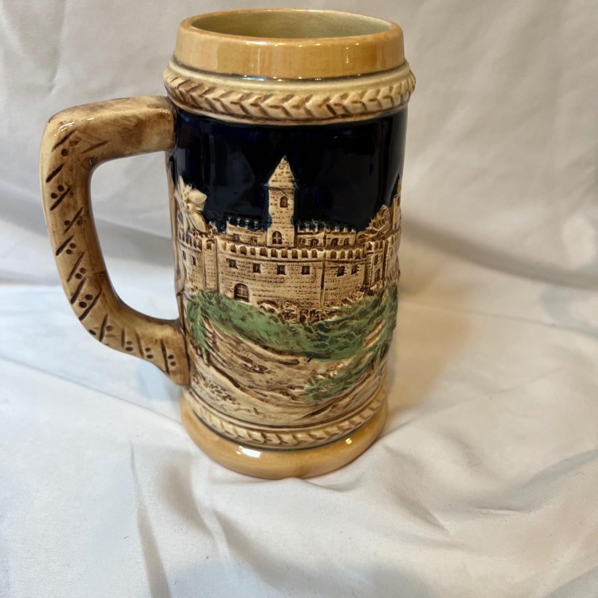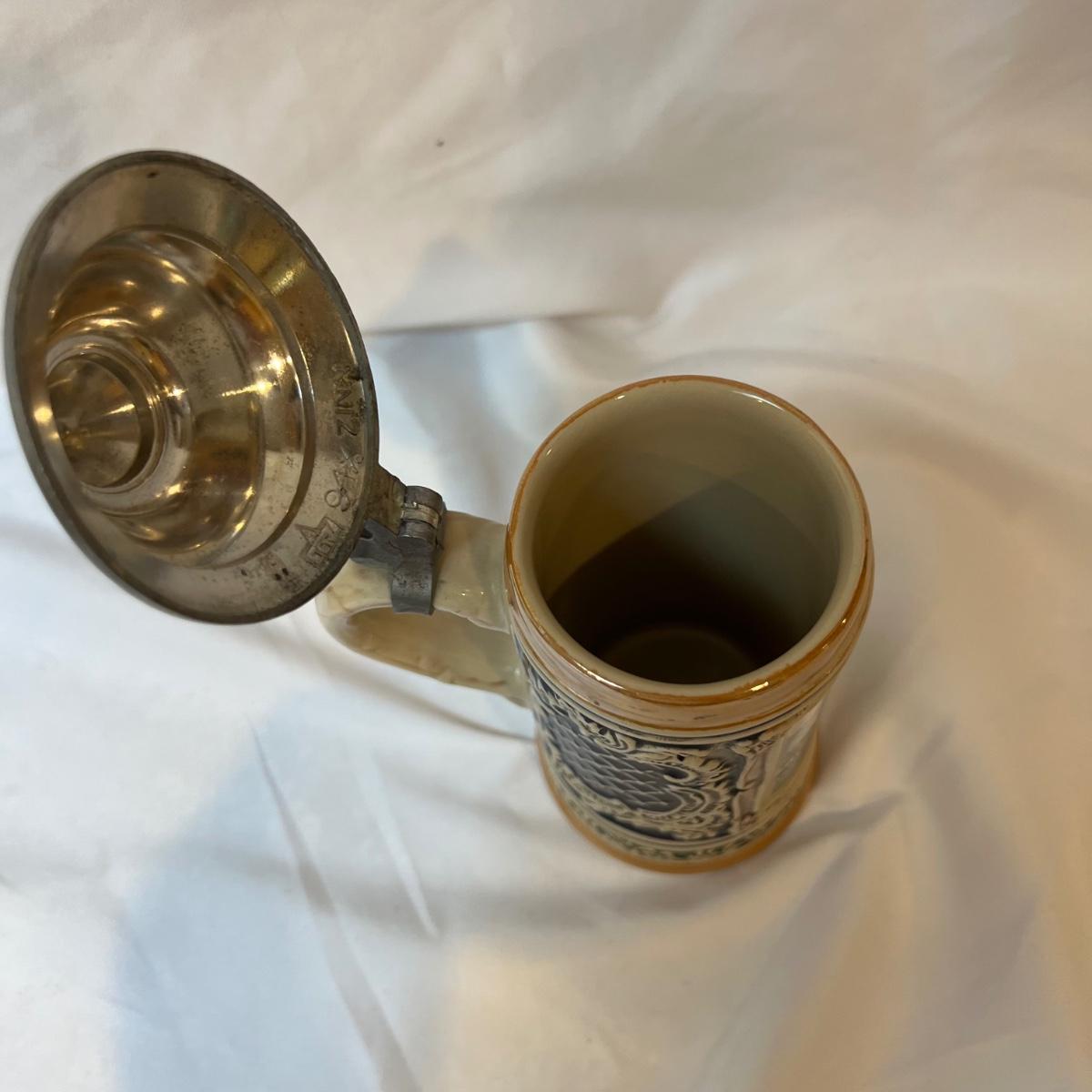 A collection of six ceramic beer steins. The largest measuring 3”D x 7”H and the smallest 2”D x 4”H.