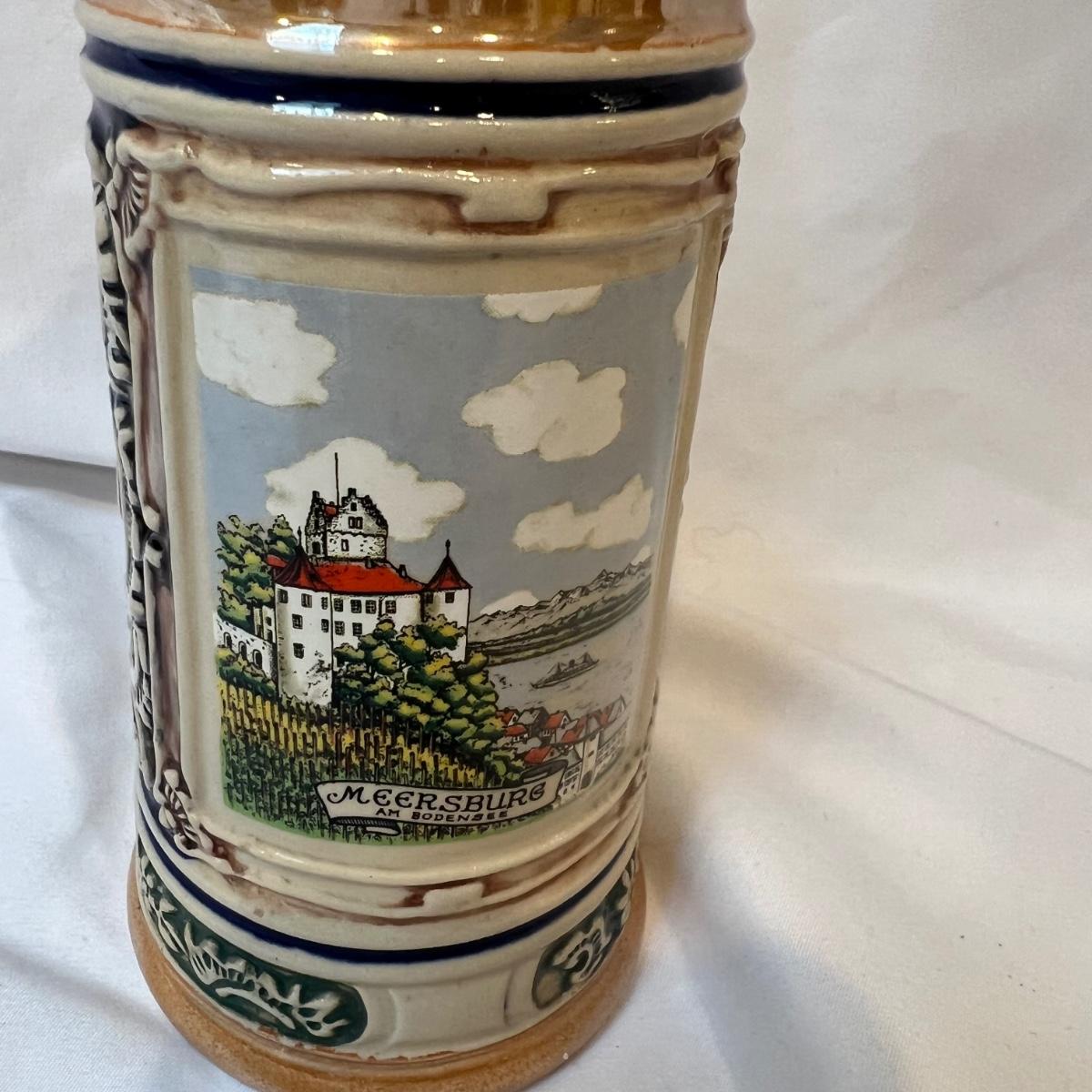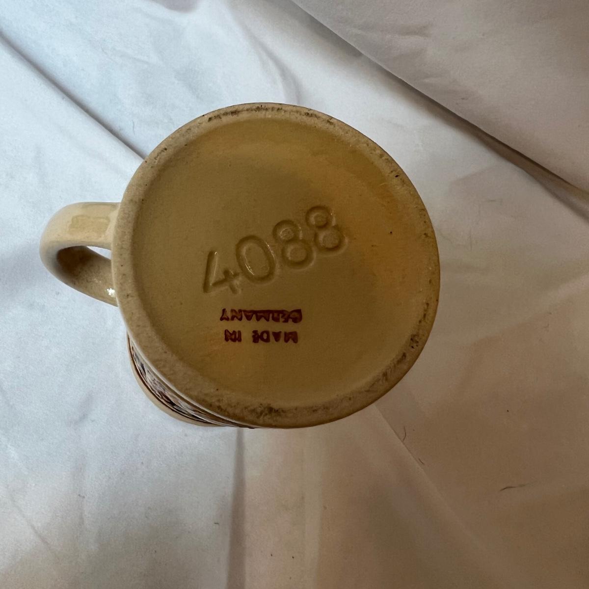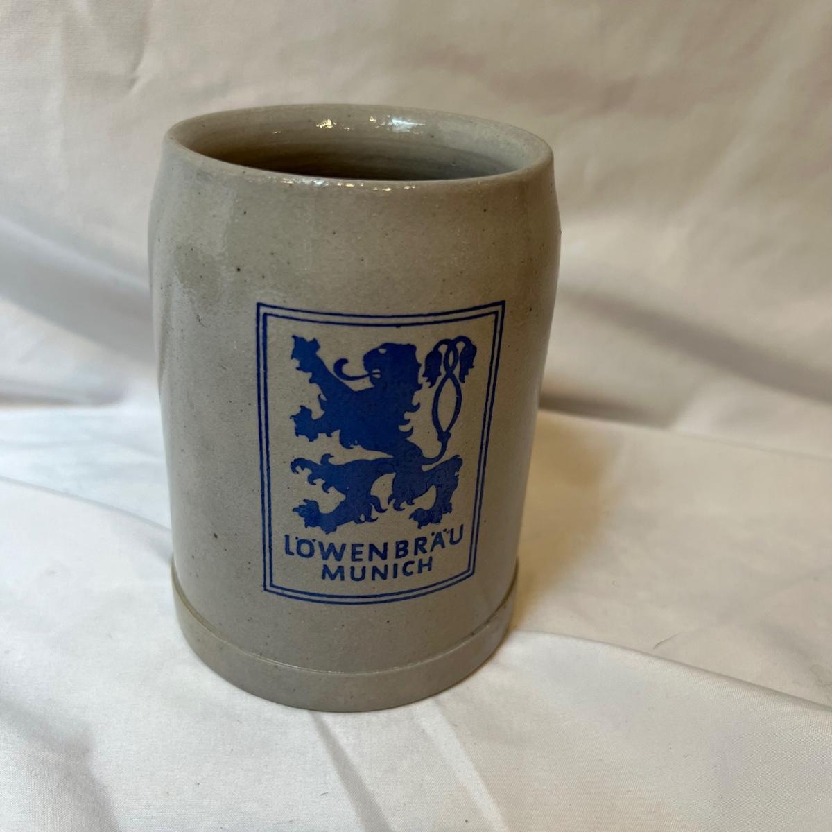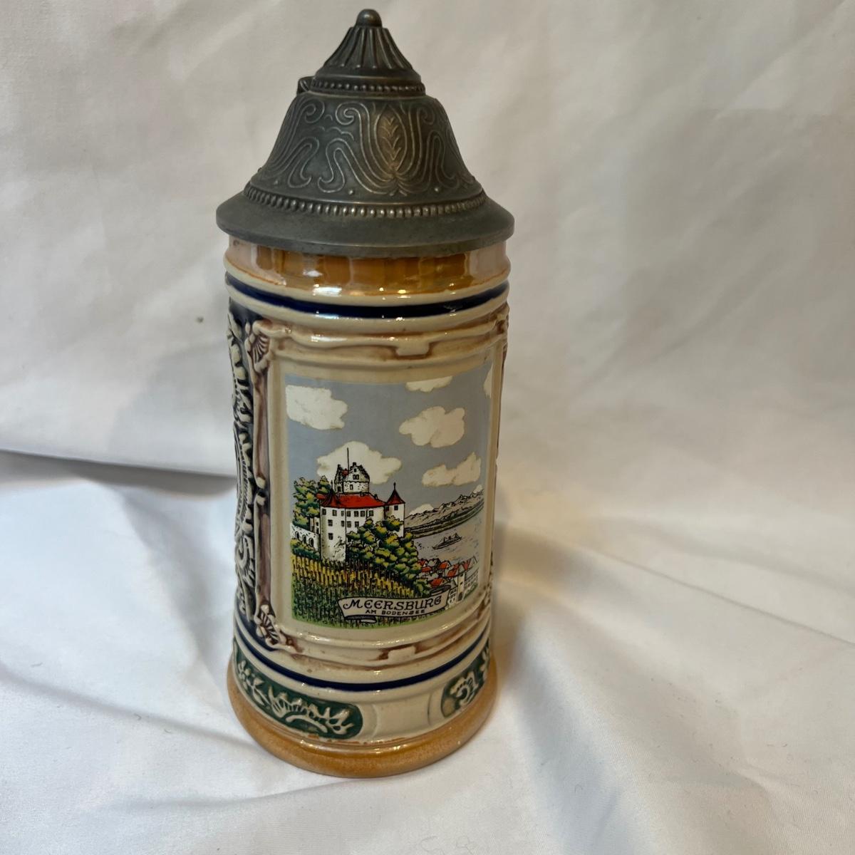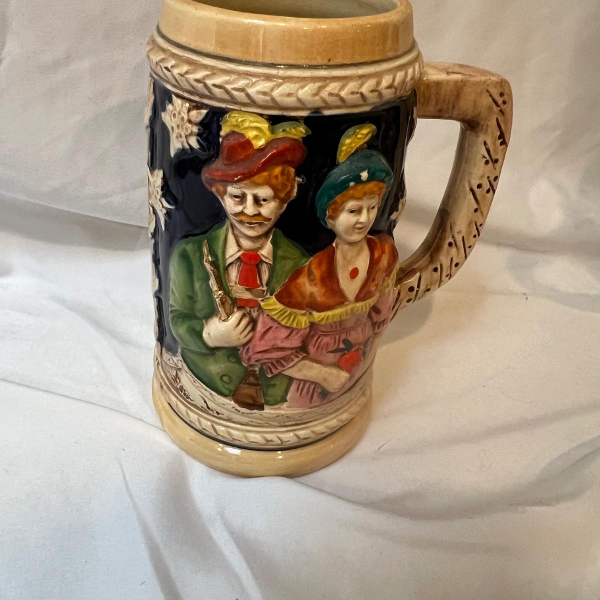 A collection of six ceramic beer steins. The largest measuring 3”D x 7”H and the smallest 2”D x 4”H.
