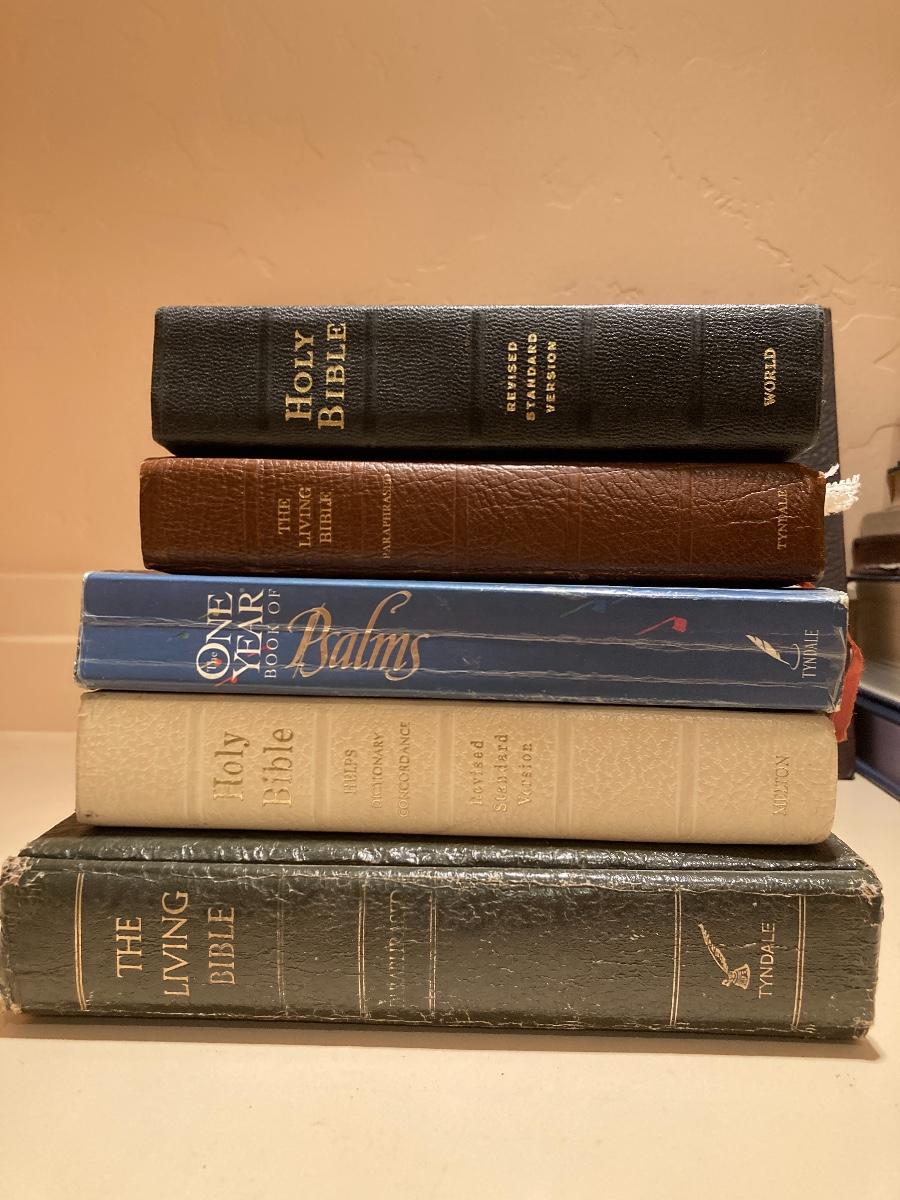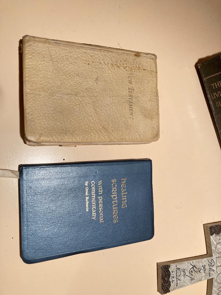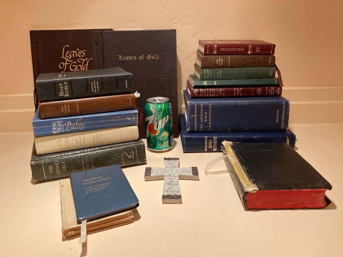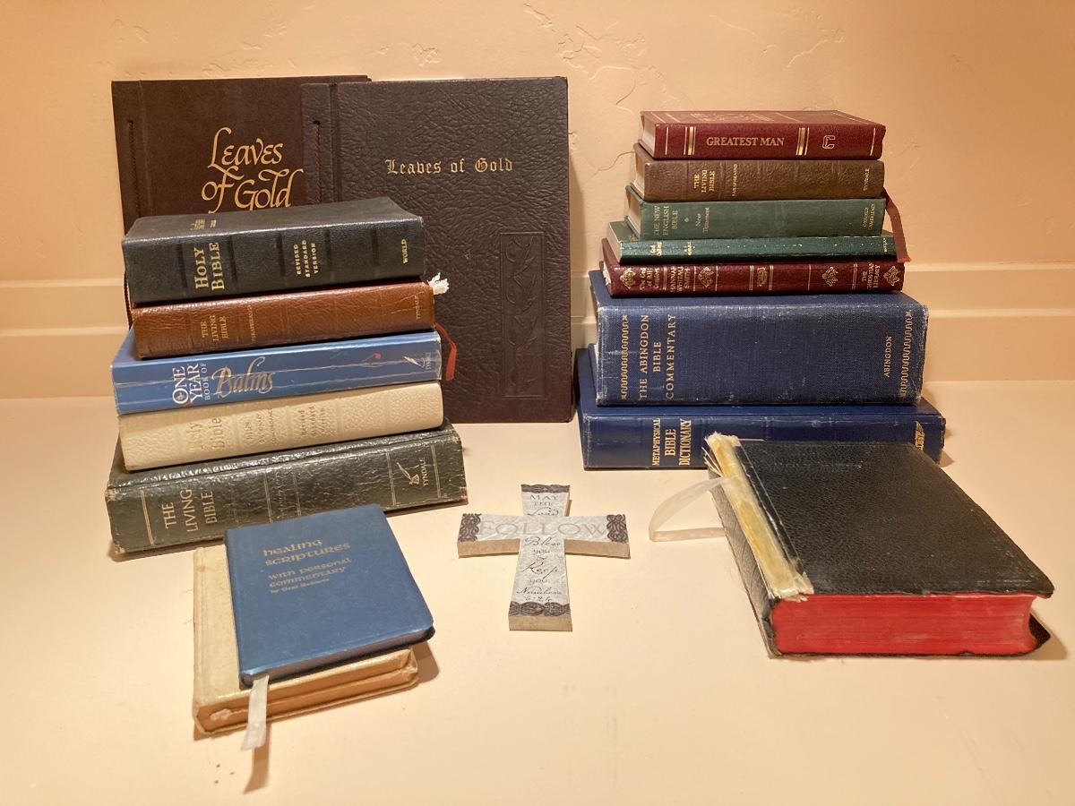 #366 Collection of Bibles and Other Spiritual Books, Cross with Scripture Wall Hanging Lot of 23