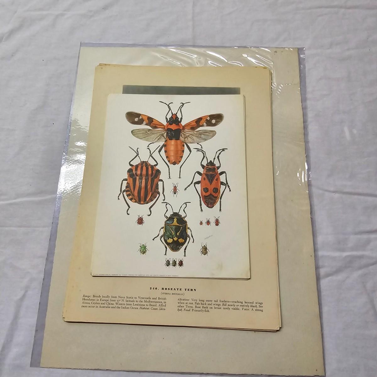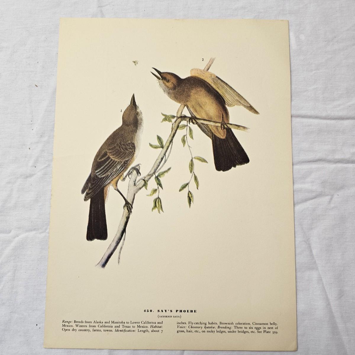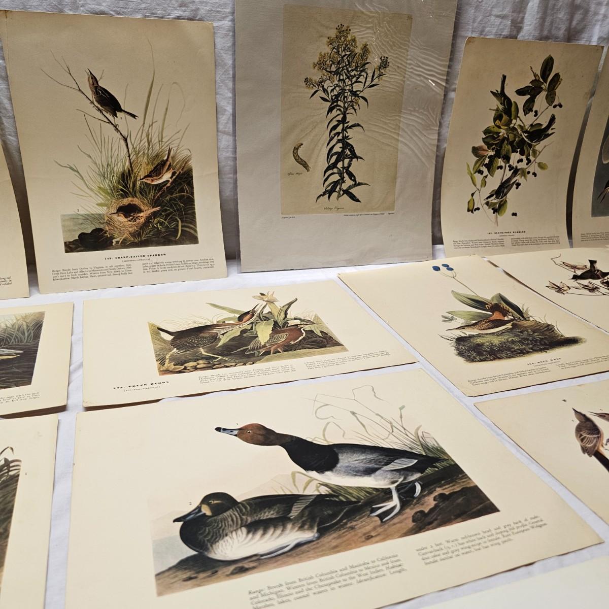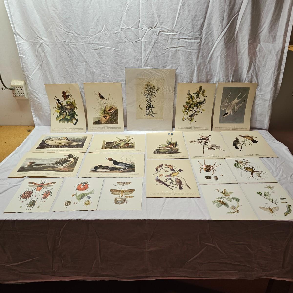 Twenty individual prints of various birds and insects. All items are unmounted, printed on heavy stock. Small insect plates measure 7" x 9". Vertical and horizontal bird images are 9" x 12.75". Large flower print is 11.75" x 15.5". Most all pieces have some discoloration on edges and backs. One piece has crease running across bottom. See photos for details. Shipping available.