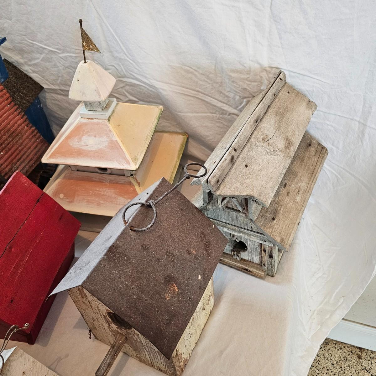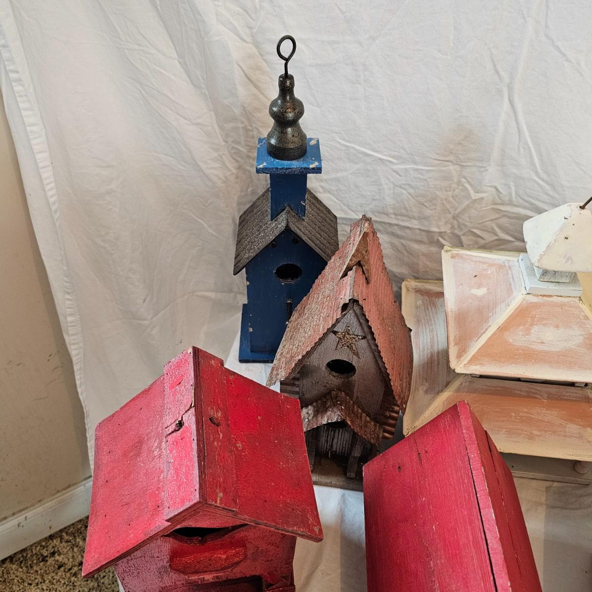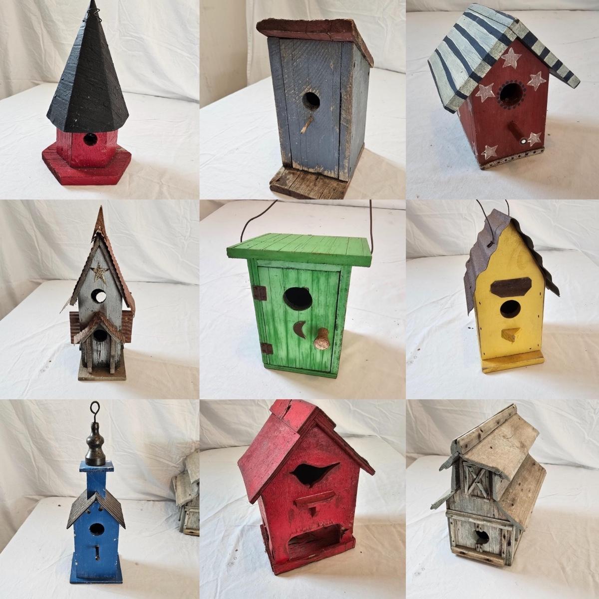 All different sizes and shapes, over 15 total. Wood, metal, plain and decorated. Large white square unit is 11" x 11" x 18"H. Tall blue is 5" x 6.5" x 19"H. Grey barn is 8" x 13" x 12" H and small striped item is 4" x 4" x 5"H. All items have seen use. See photos for details. Local pickup only.