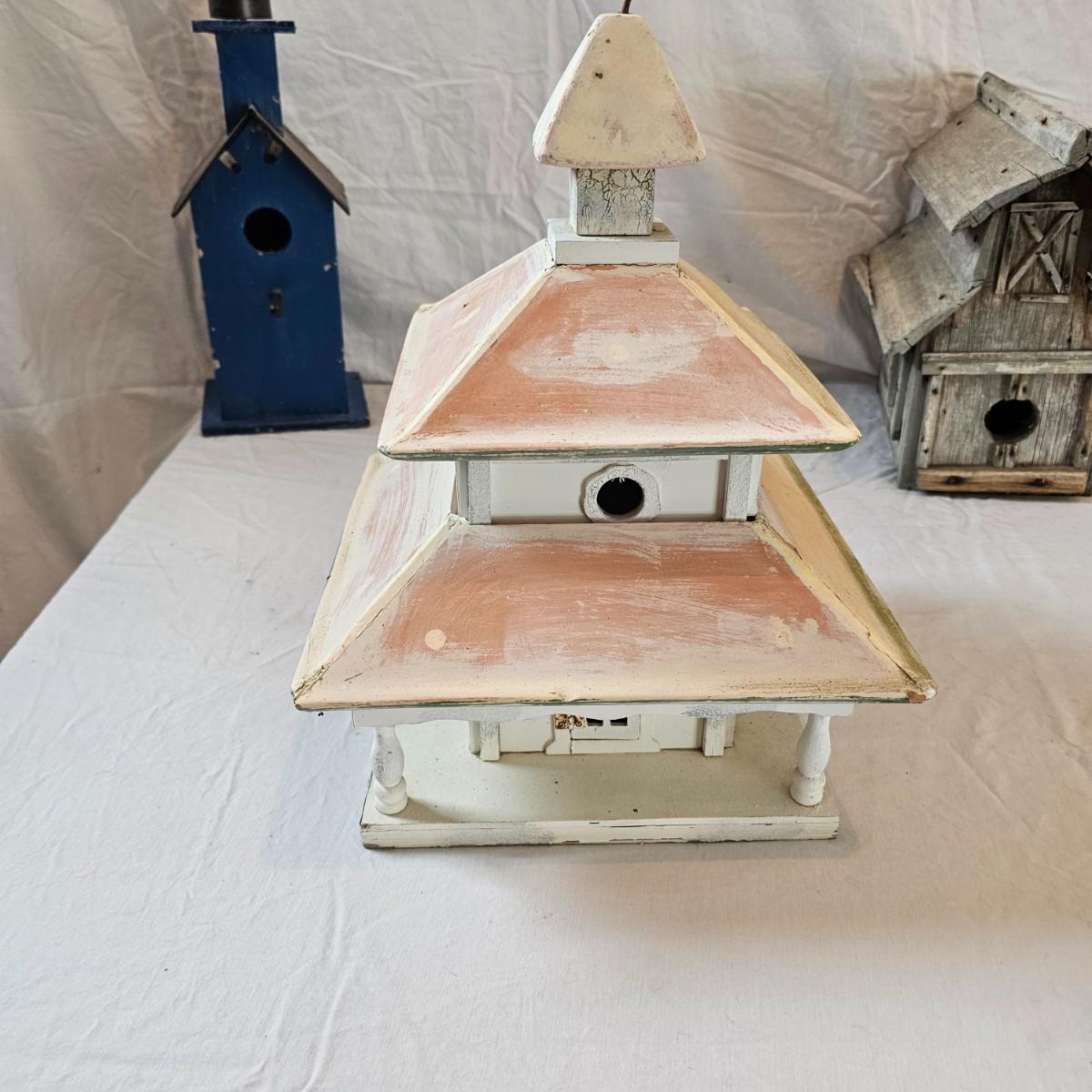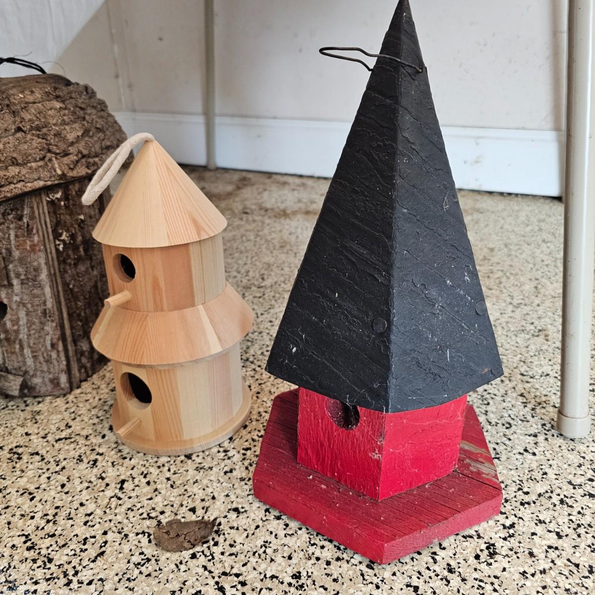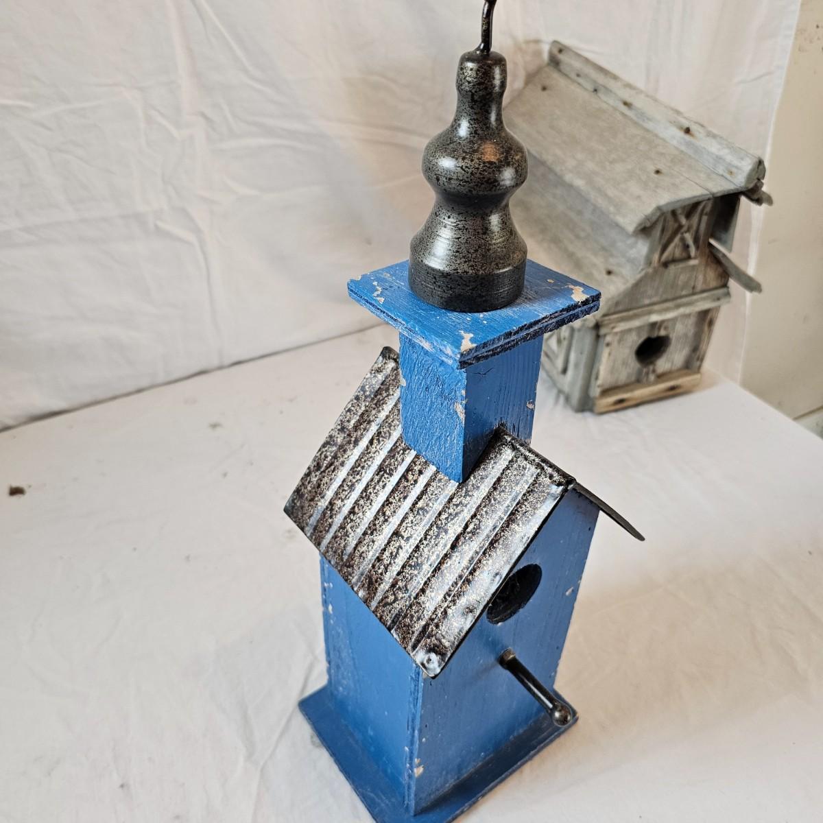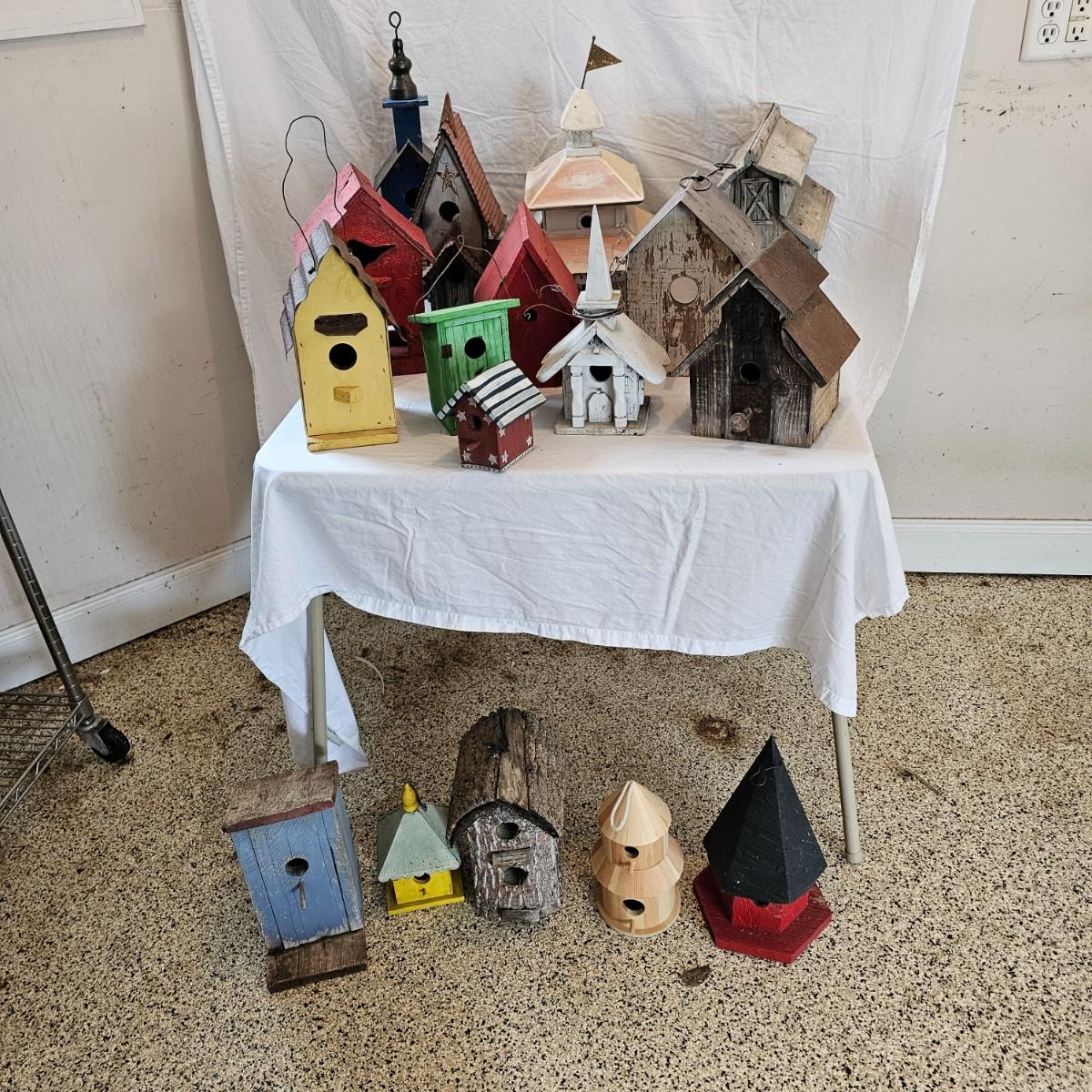 All different sizes and shapes, over 15 total. Wood, metal, plain and decorated. Large white square unit is 11" x 11" x 18"H. Tall blue is 5" x 6.5" x 19"H. Grey barn is 8" x 13" x 12" H and small striped item is 4" x 4" x 5"H. All items have seen use. See photos for details. Local pickup only.