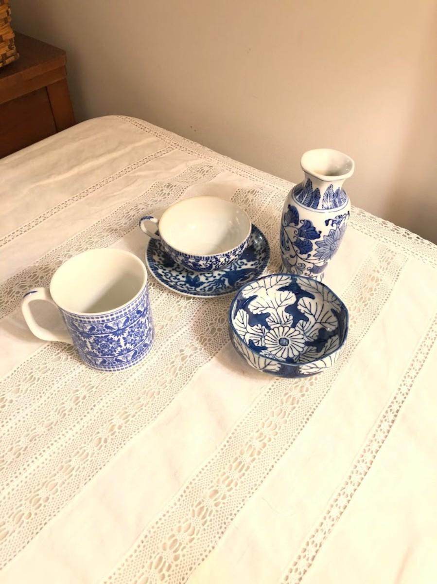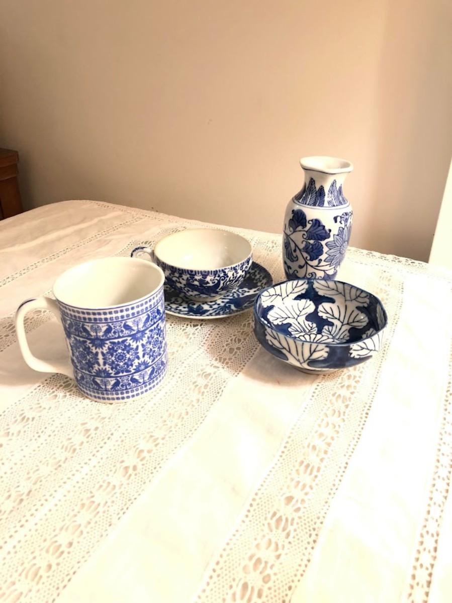 5 piece collection of blue and white - cup and saucer, vase (5.5" h), mug, and small bowl.