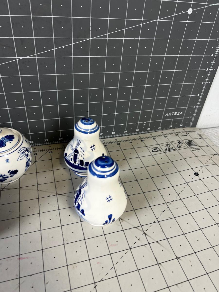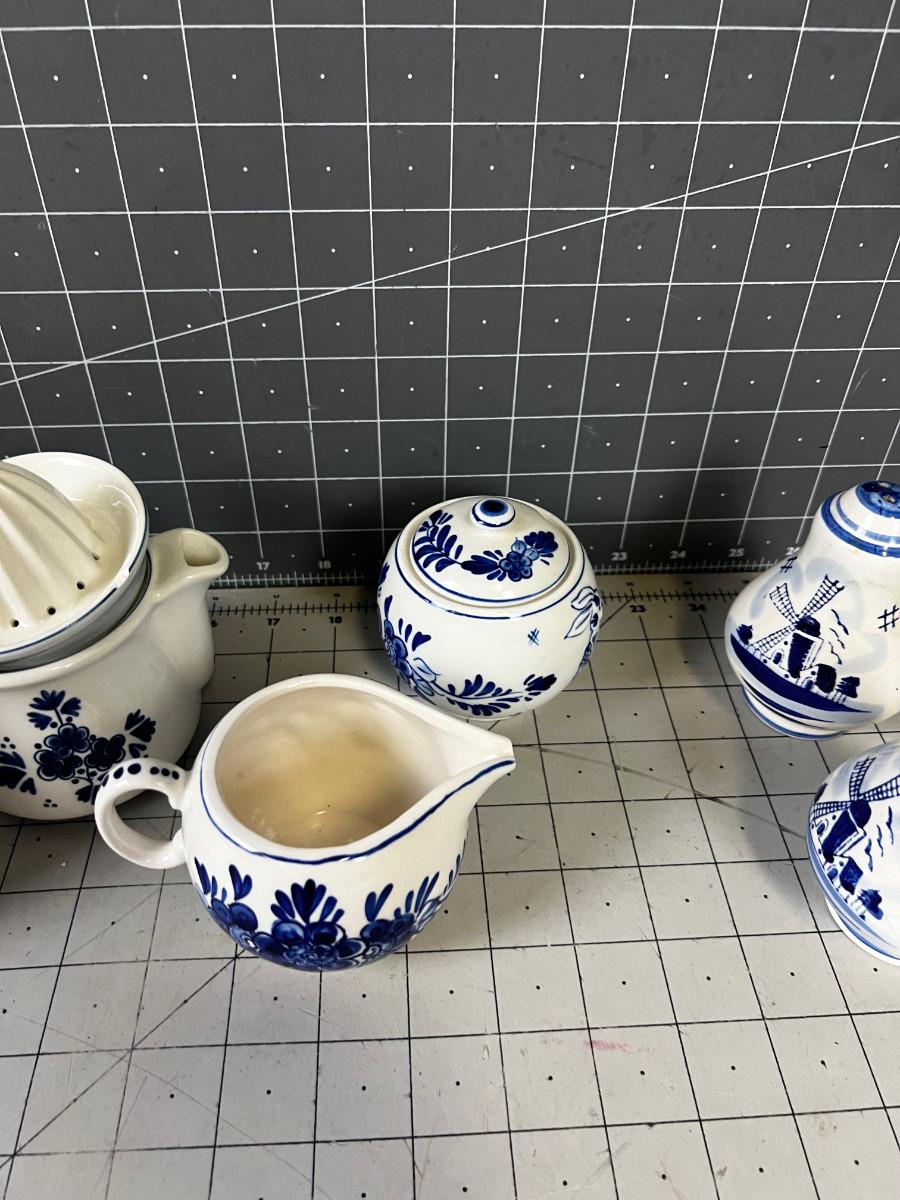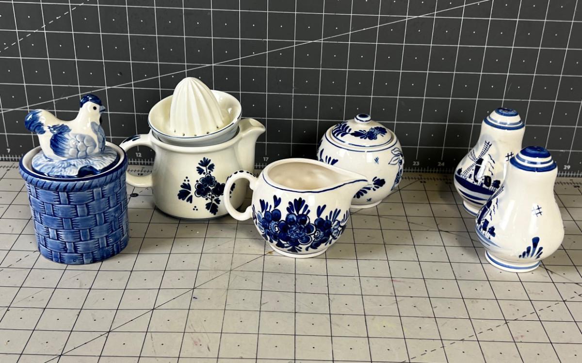 Collection of Blue Delf: Juicer, Cream and Sugar, S & P