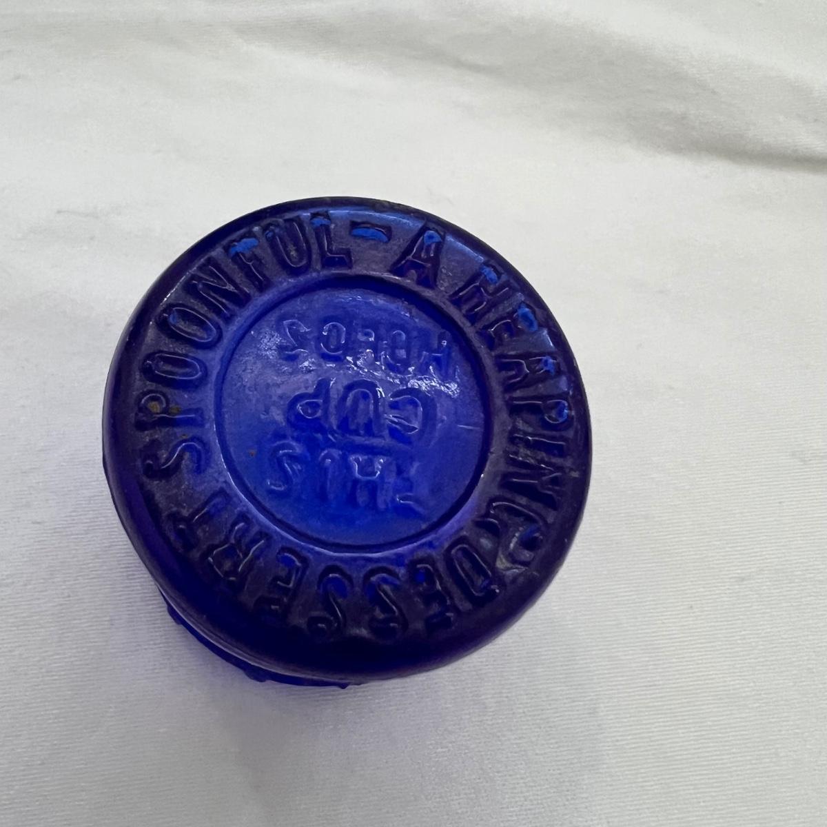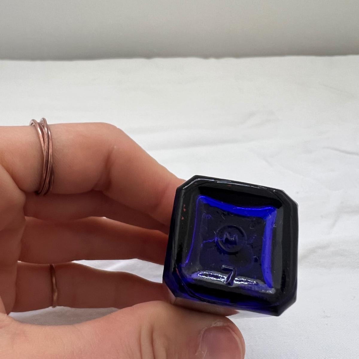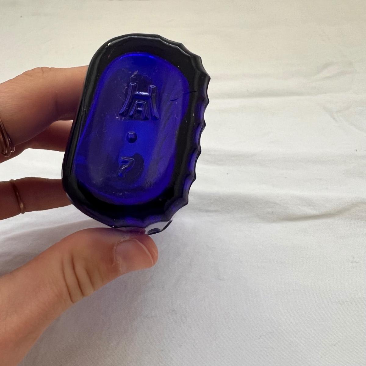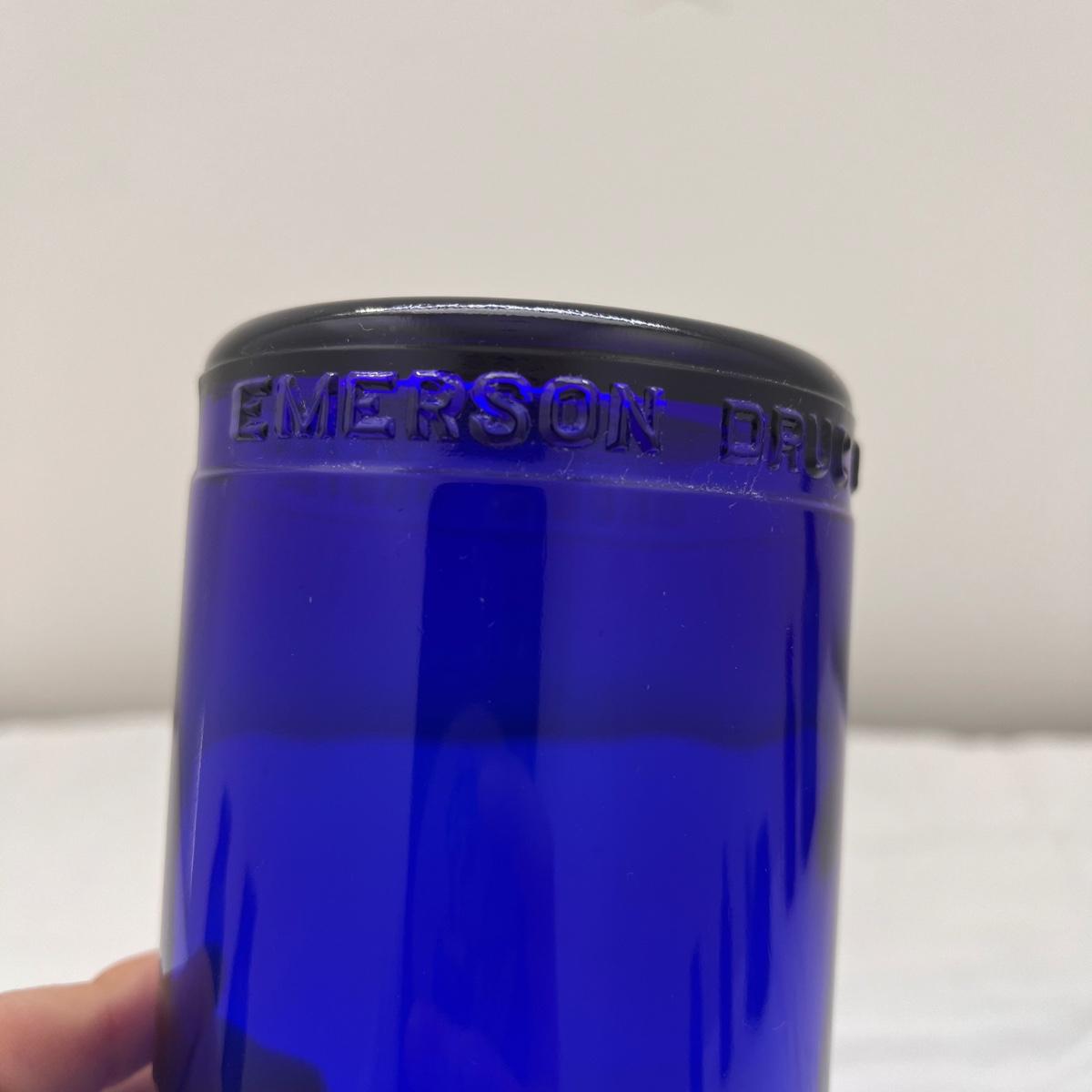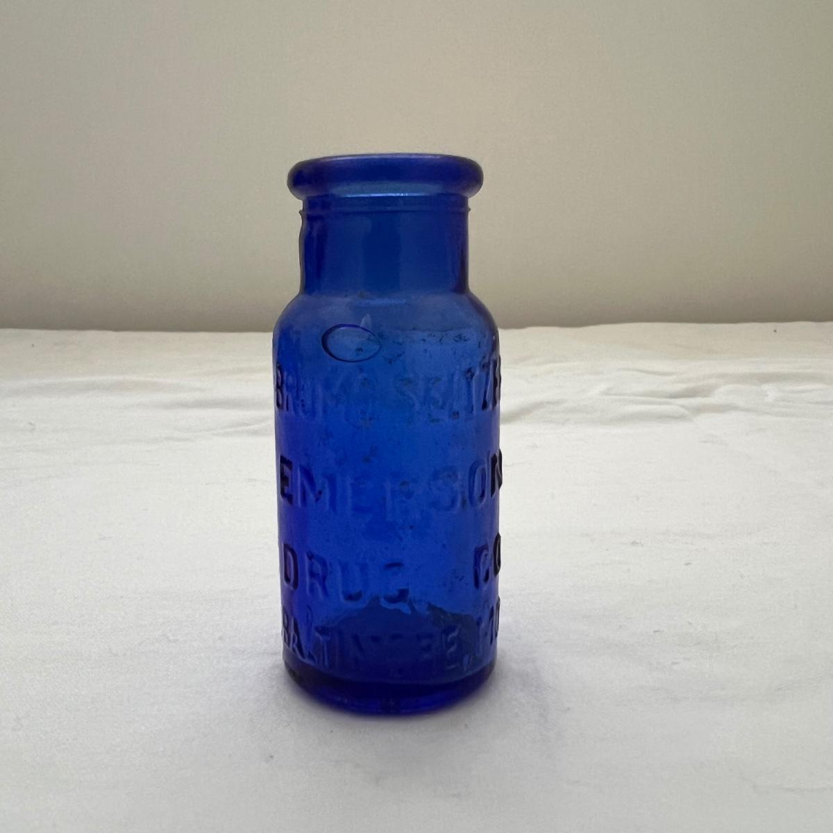 This lot includes a collection of nine blue glass bottles in various sizes. The largest bottle measures 3" x 7.75"H. The smallest bottle measures 1" x 2.75"H. Shipping available.