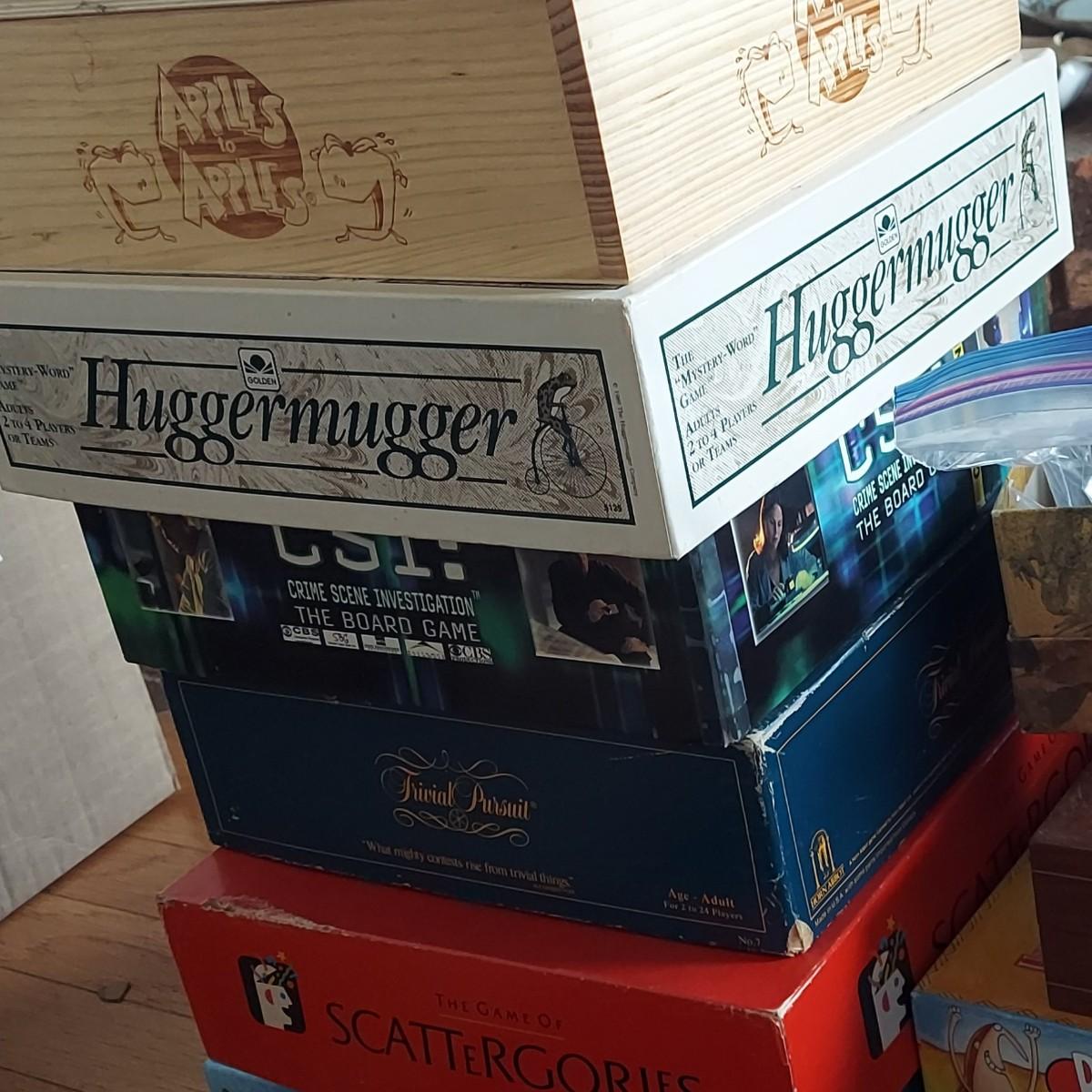 Lot includes several board games such as Scattergories, Battle of the Sexes, Trivial Pursuit, Risk, Apples to Apples, Scrabble and more. Plus a chess board and poker chips.the chess board shows some wear. We cannot guarantee each game is complete. Local Pickup Only
