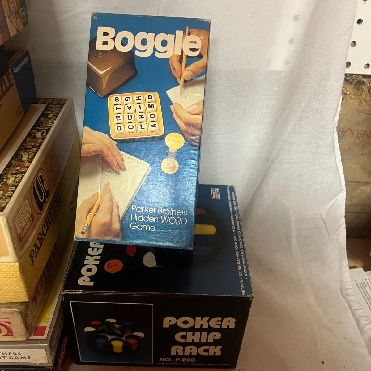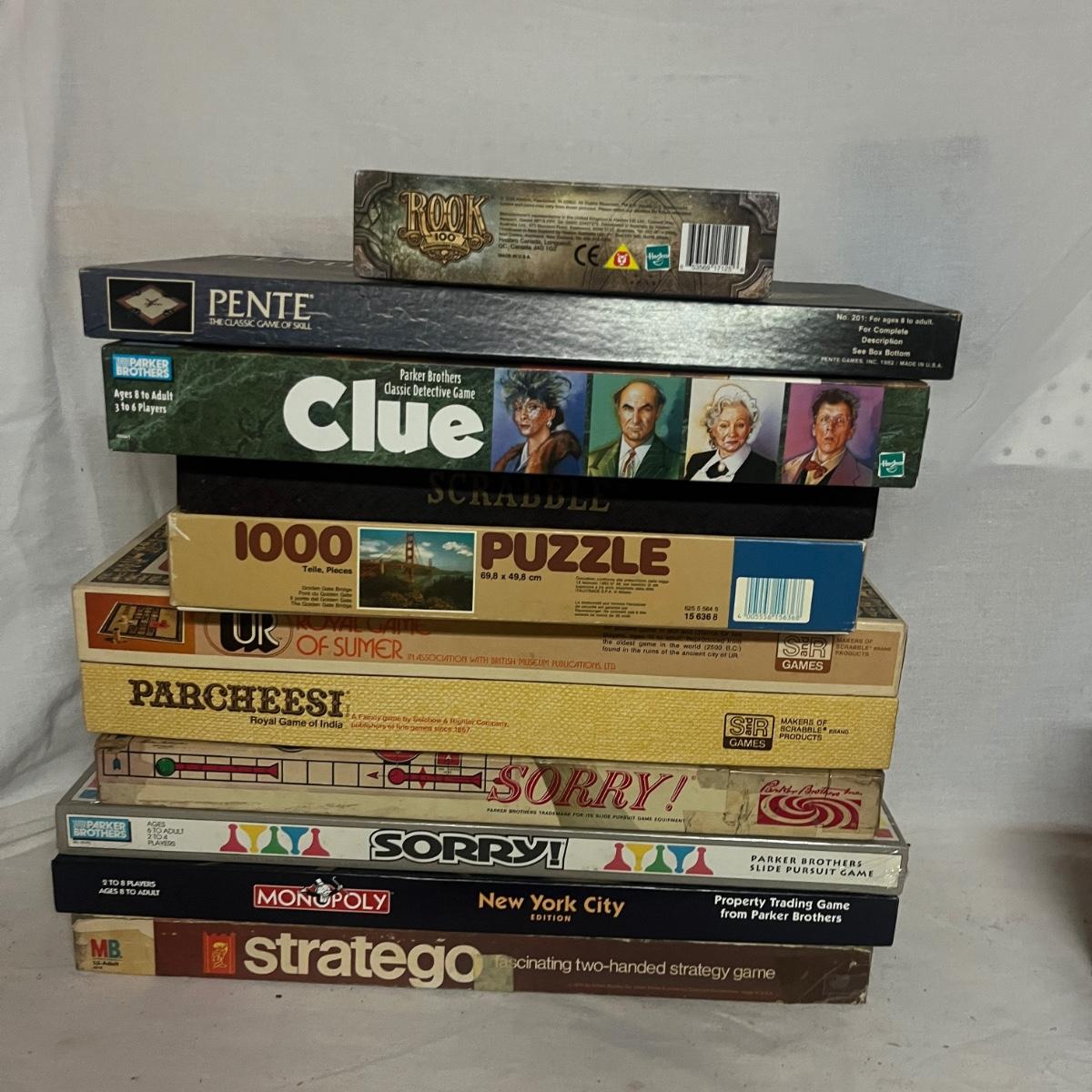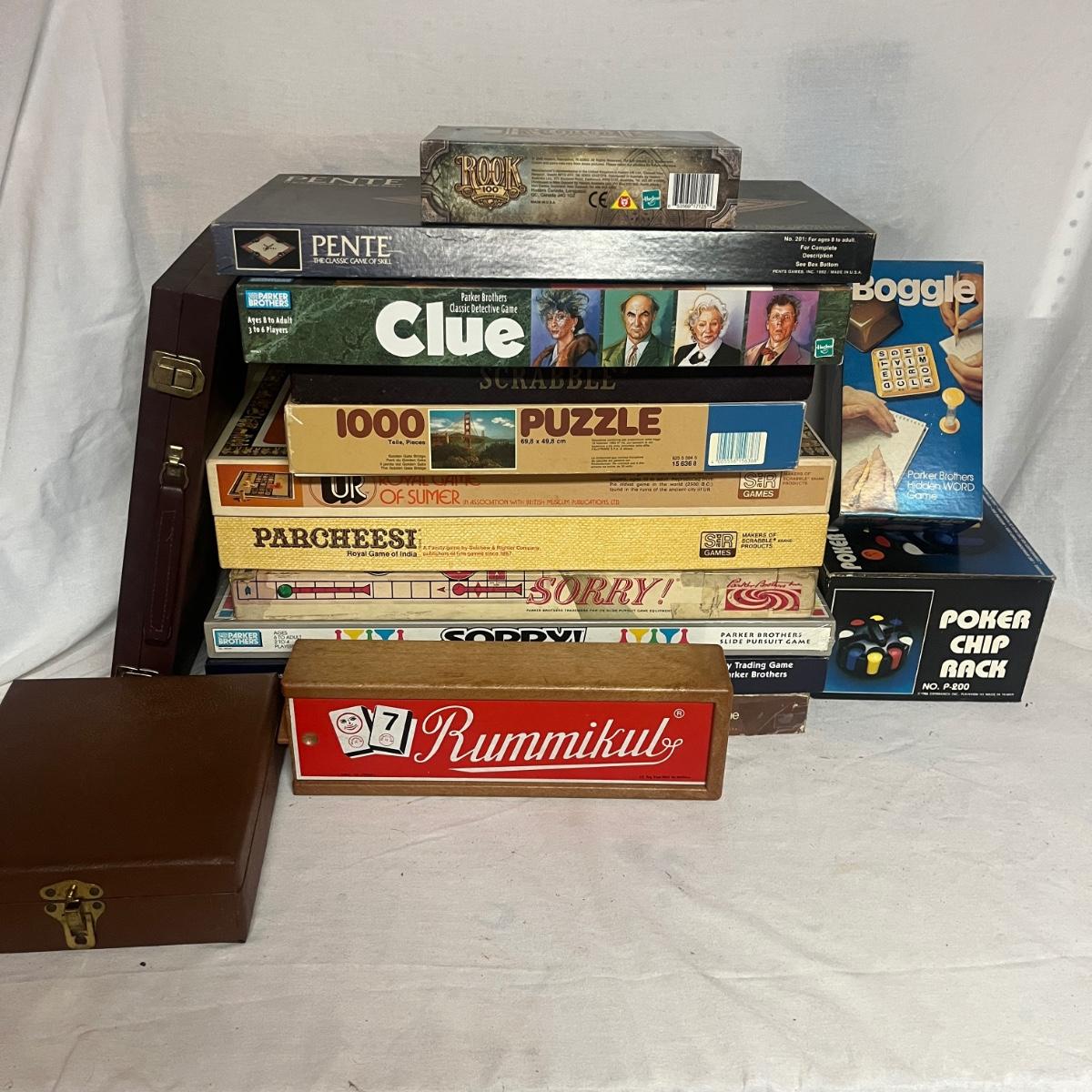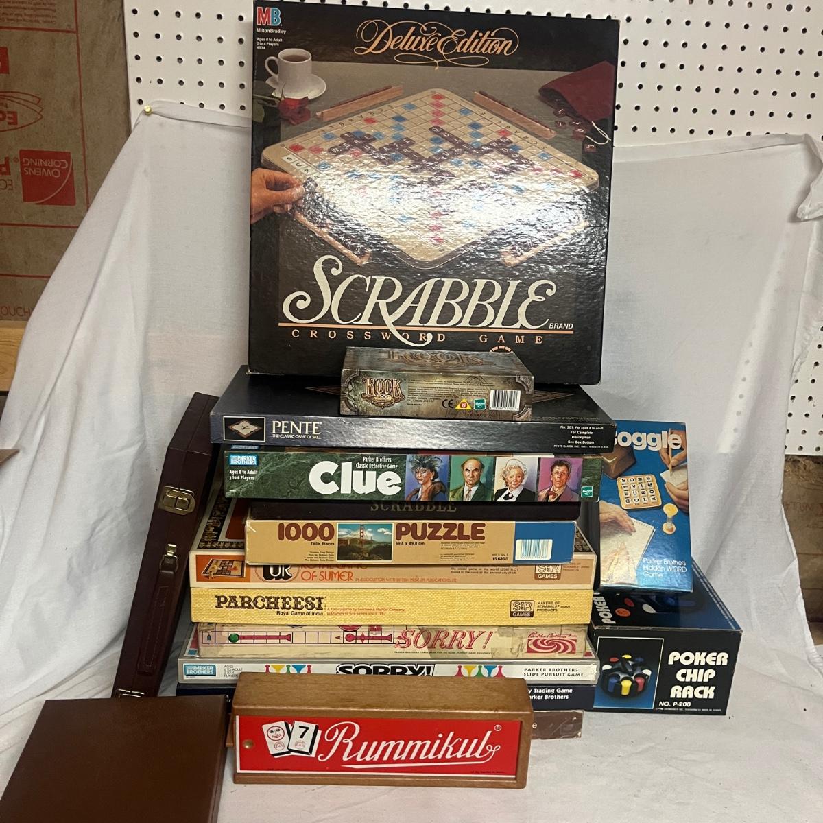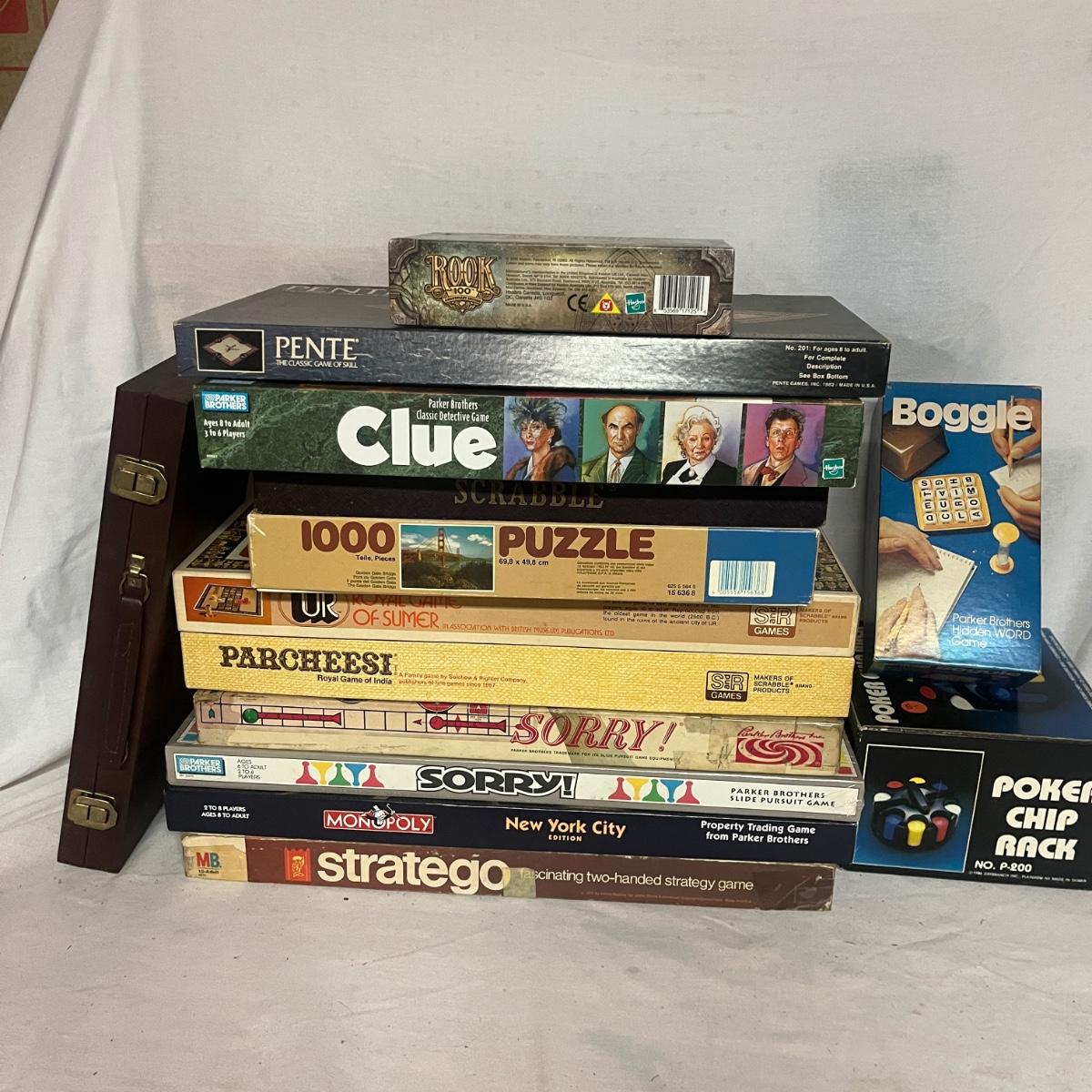 Lot contains a collection of classic boardgames including Scrabble, Monopoly New York Edition, Sorry, Clue, Poker chips and more.