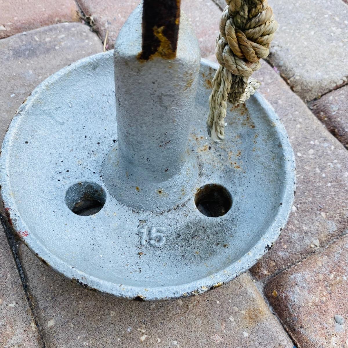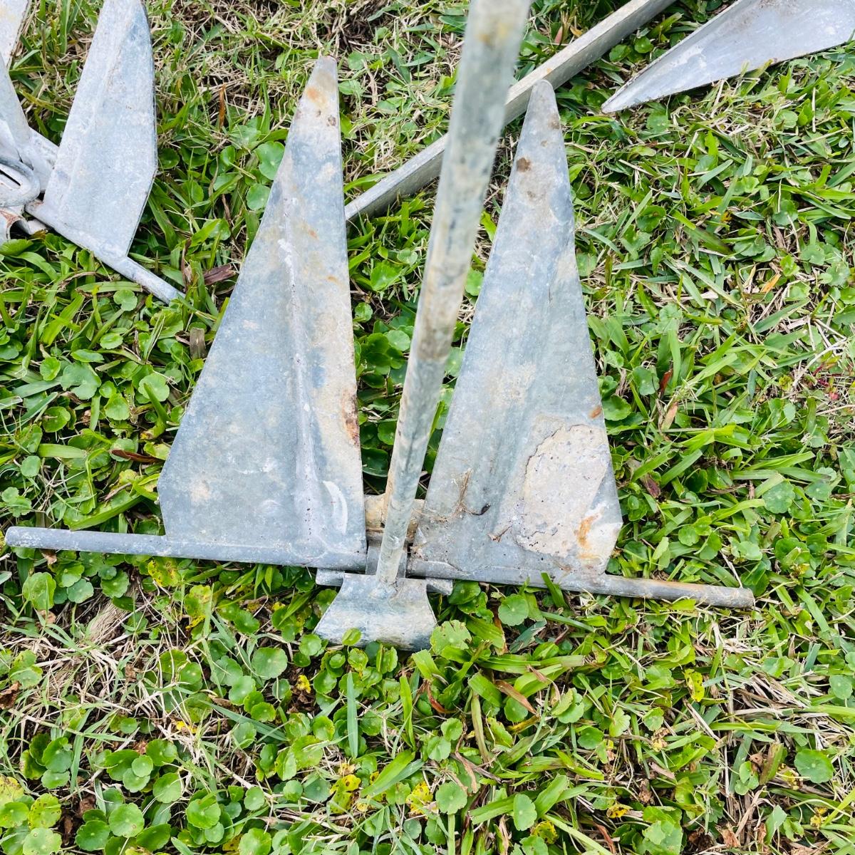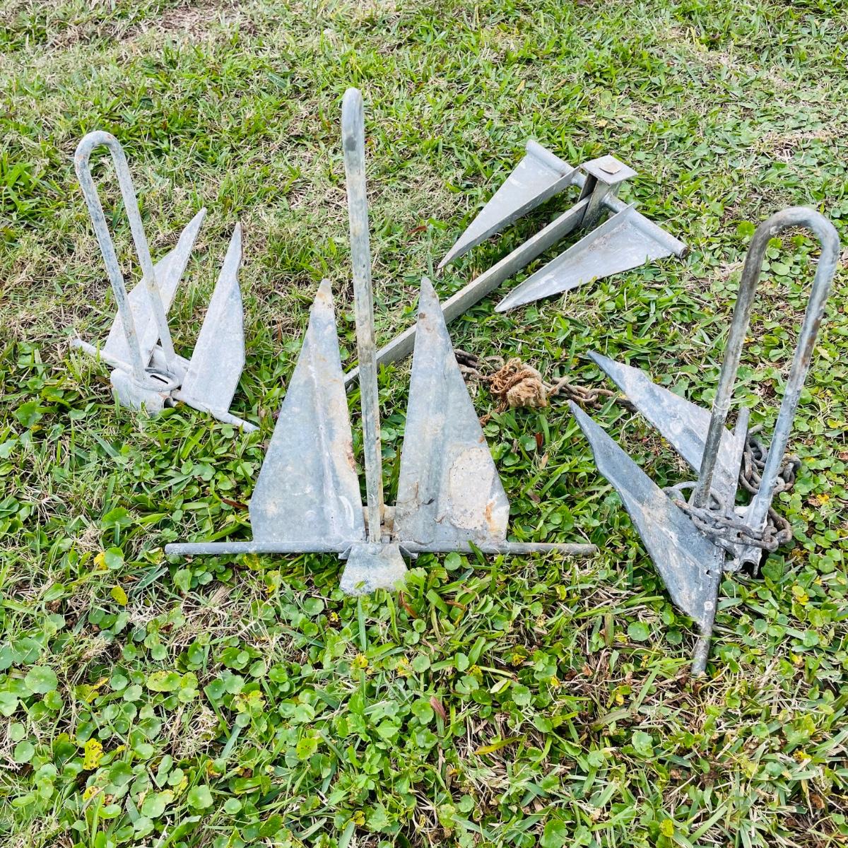 A collection of 10 galvanized boat anchors in various sizes largest one measures 29” in length. Mushroom anchor also included - 8”D and marked 15.