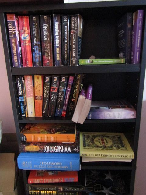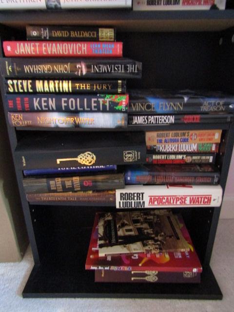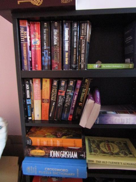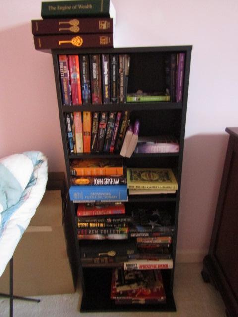 Collection of Books and Shelf. Various subjects, both hard and soft cover.
