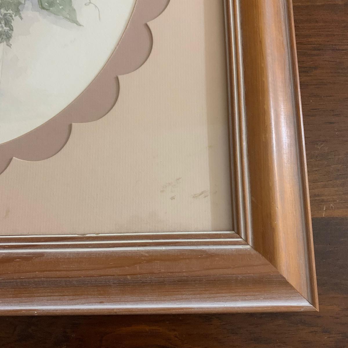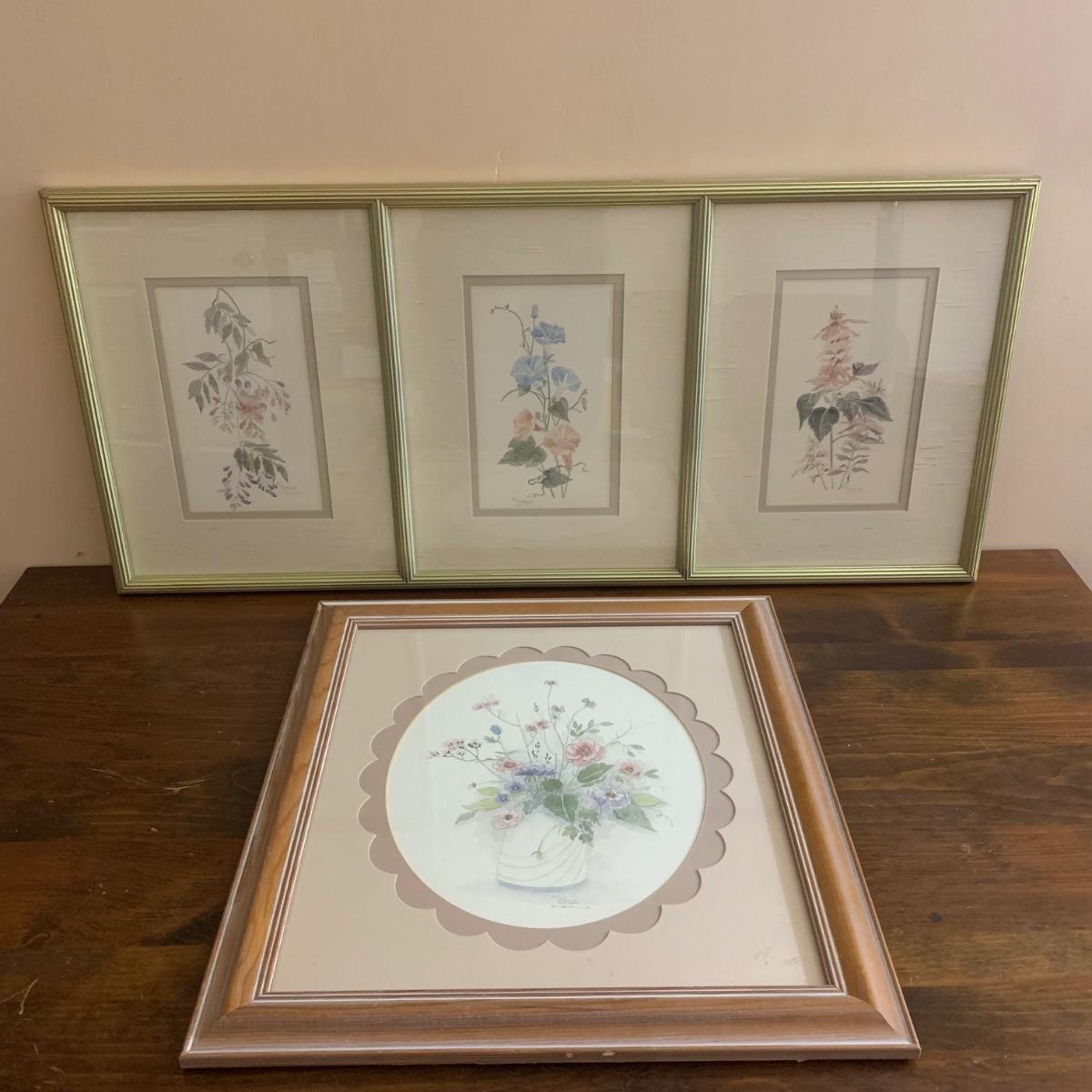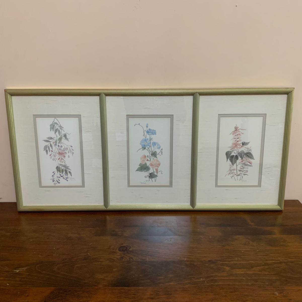 Two piece collection of botanical watercolor prints behind glass. First item is a three-piece floral print in a gold frame. Frame measures, 38”L x 17”W. And while it has a few scratches it is in good condition otherwise. See photos for more details. Second piece is a spring flower bouquet in a wooden frame. The frame measures, 19.5”L x 21.5”W. The wood frame could use a little polish but is in good condition. Lovely collection!