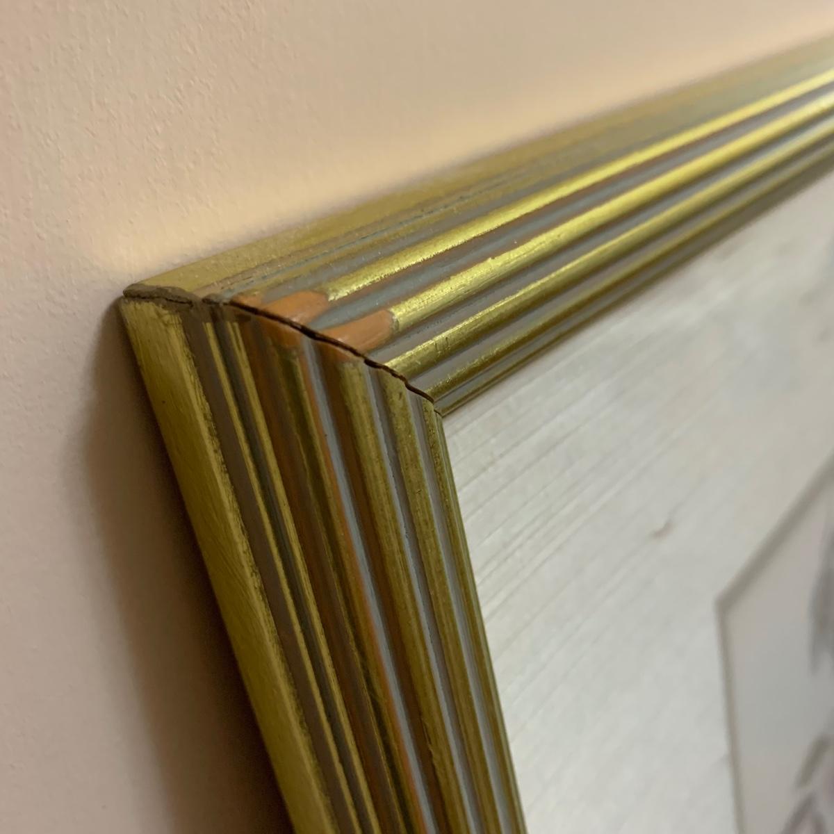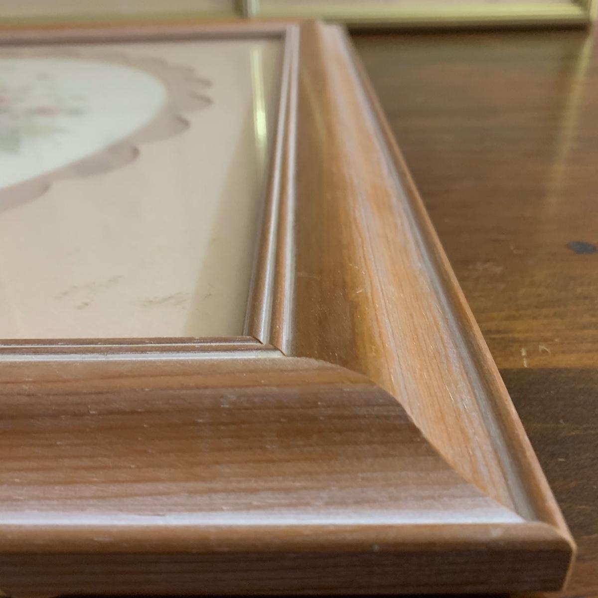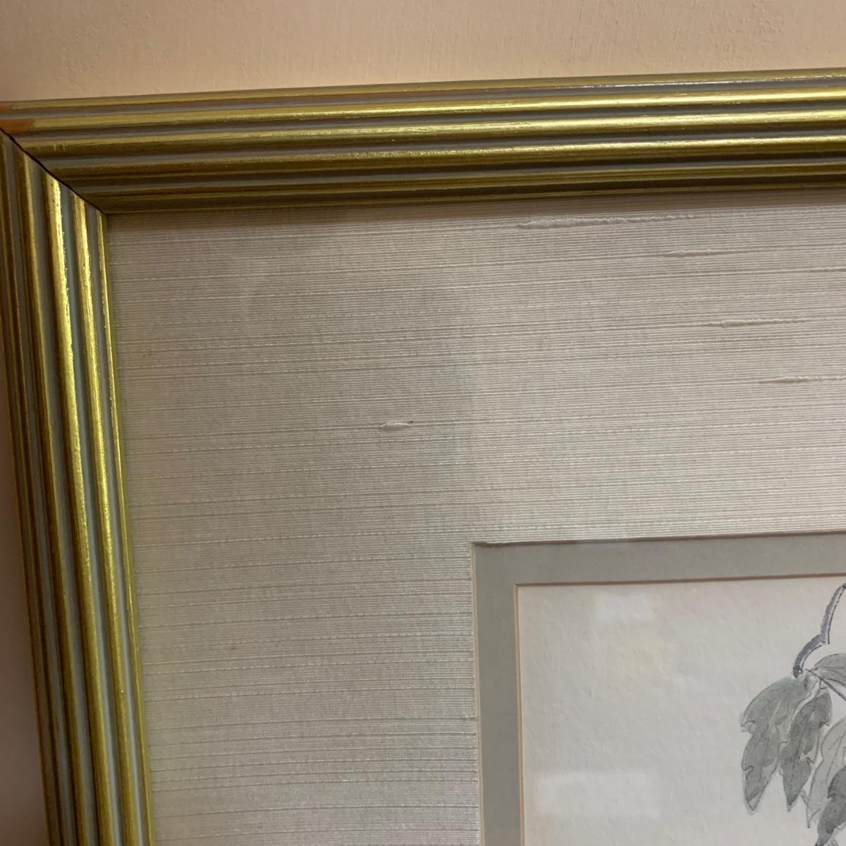 Two piece collection of botanical watercolor prints behind glass. First item is a three-piece floral print in a gold frame. Frame measures, 38”L x 17”W. And while it has a few scratches it is in good condition otherwise. See photos for more details. Second piece is a spring flower bouquet in a wooden frame. The frame measures, 19.5”L x 21.5”W. The wood frame could use a little polish but is in good condition. Lovely collection!