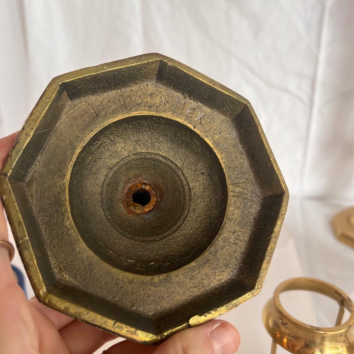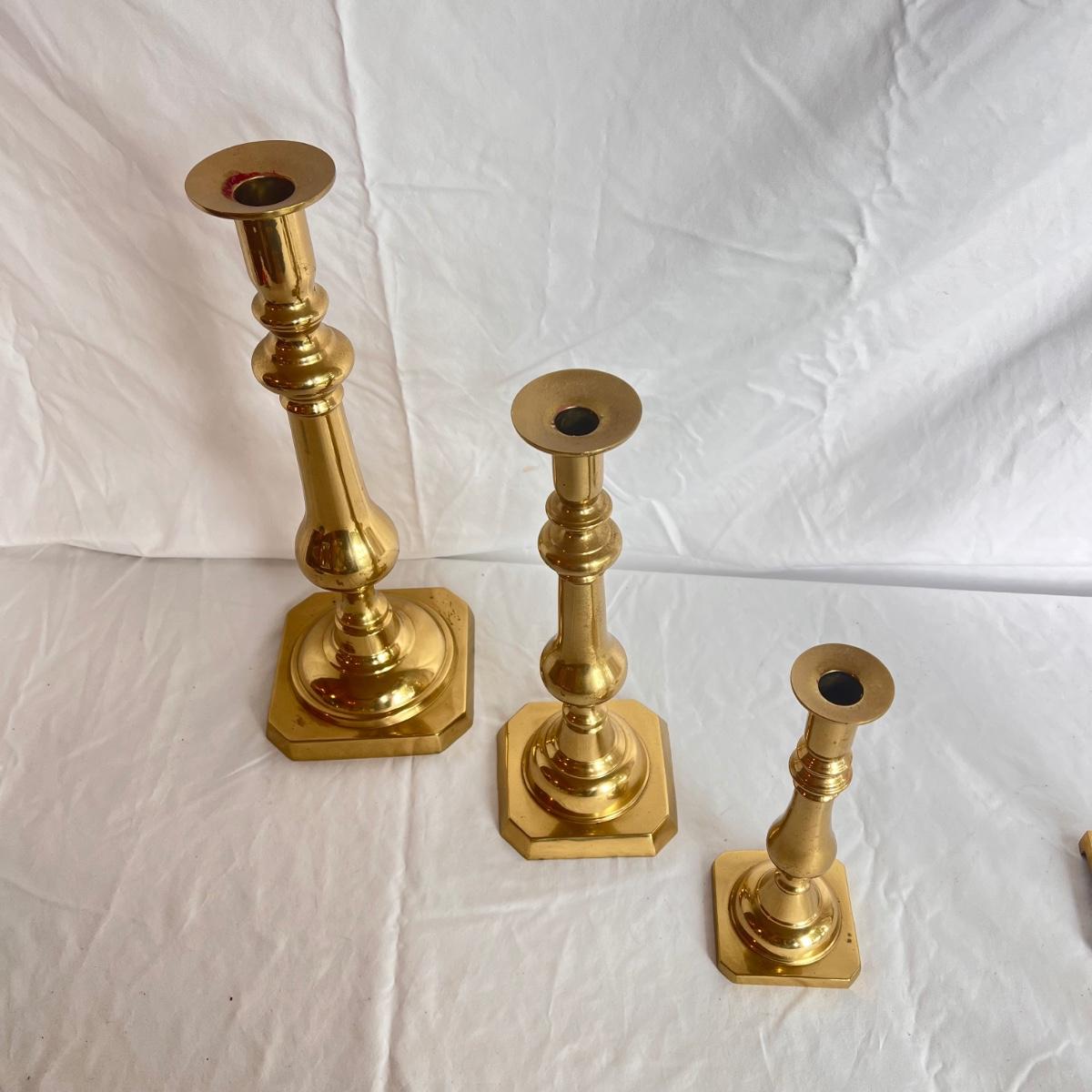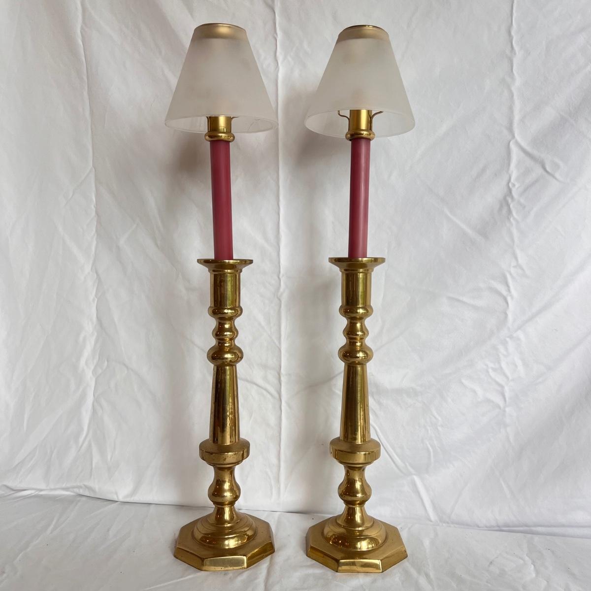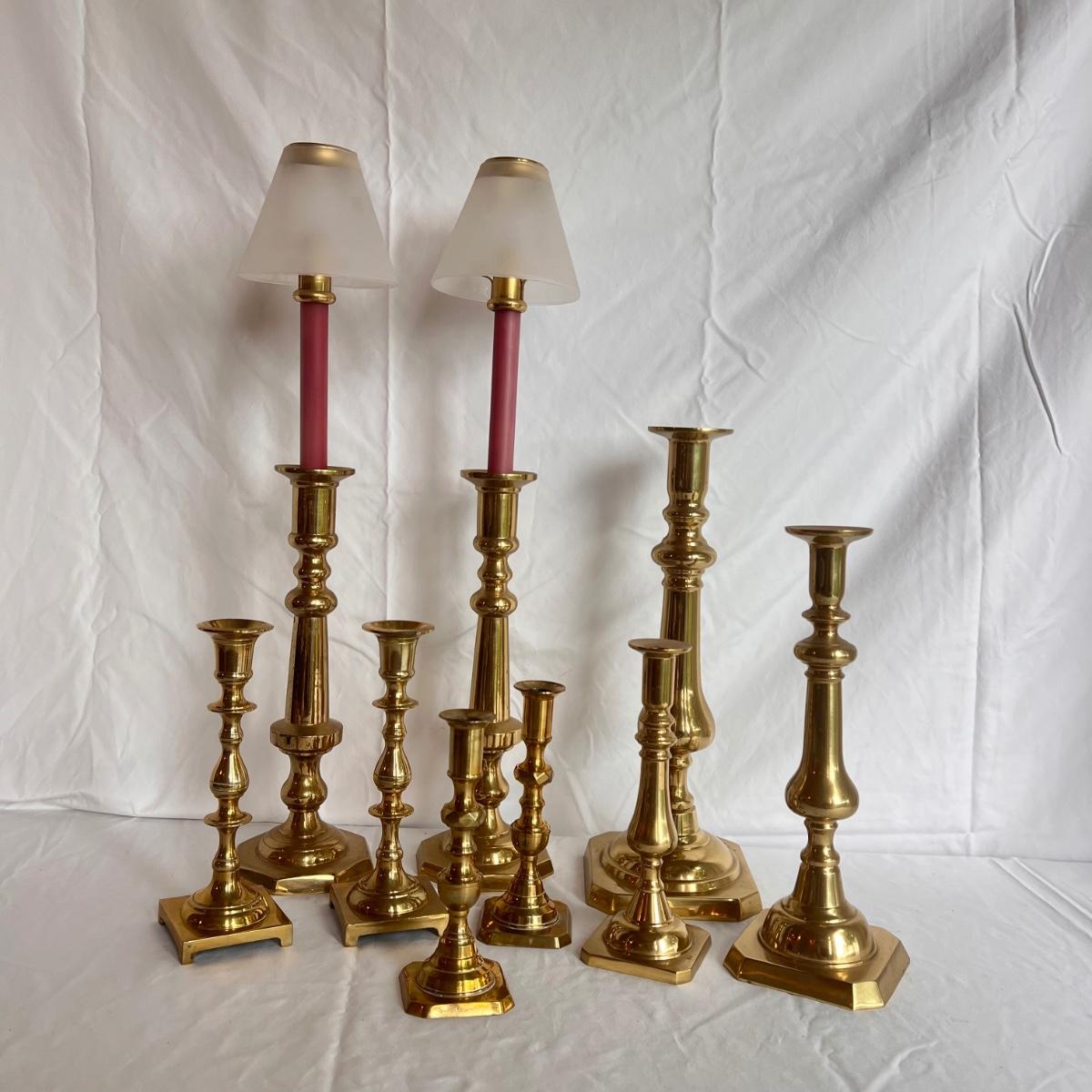 This lot includes eight brass candleholders in various sizes. Two of the candlestick holders have frosted glass lampshades with a brass base. One of the lampshades has a crack in it - see picture included. Some of the candlestick holders are stamped with “Harvin.” The other stamped brass holders are stamped, but not legible. The largest candlestick holders are the ones with their lampshades that measure 5” x 5” x 23”H. Shipping available.