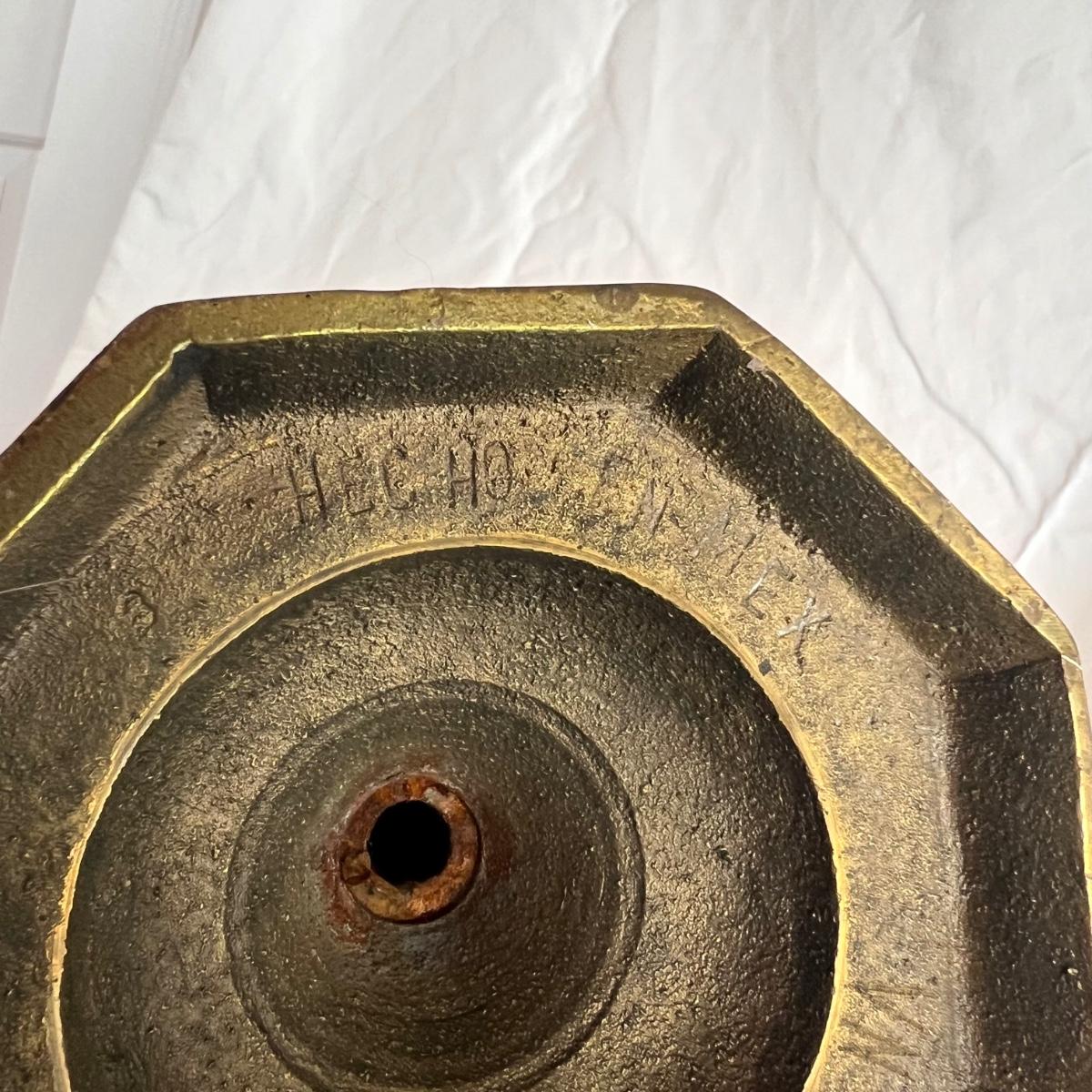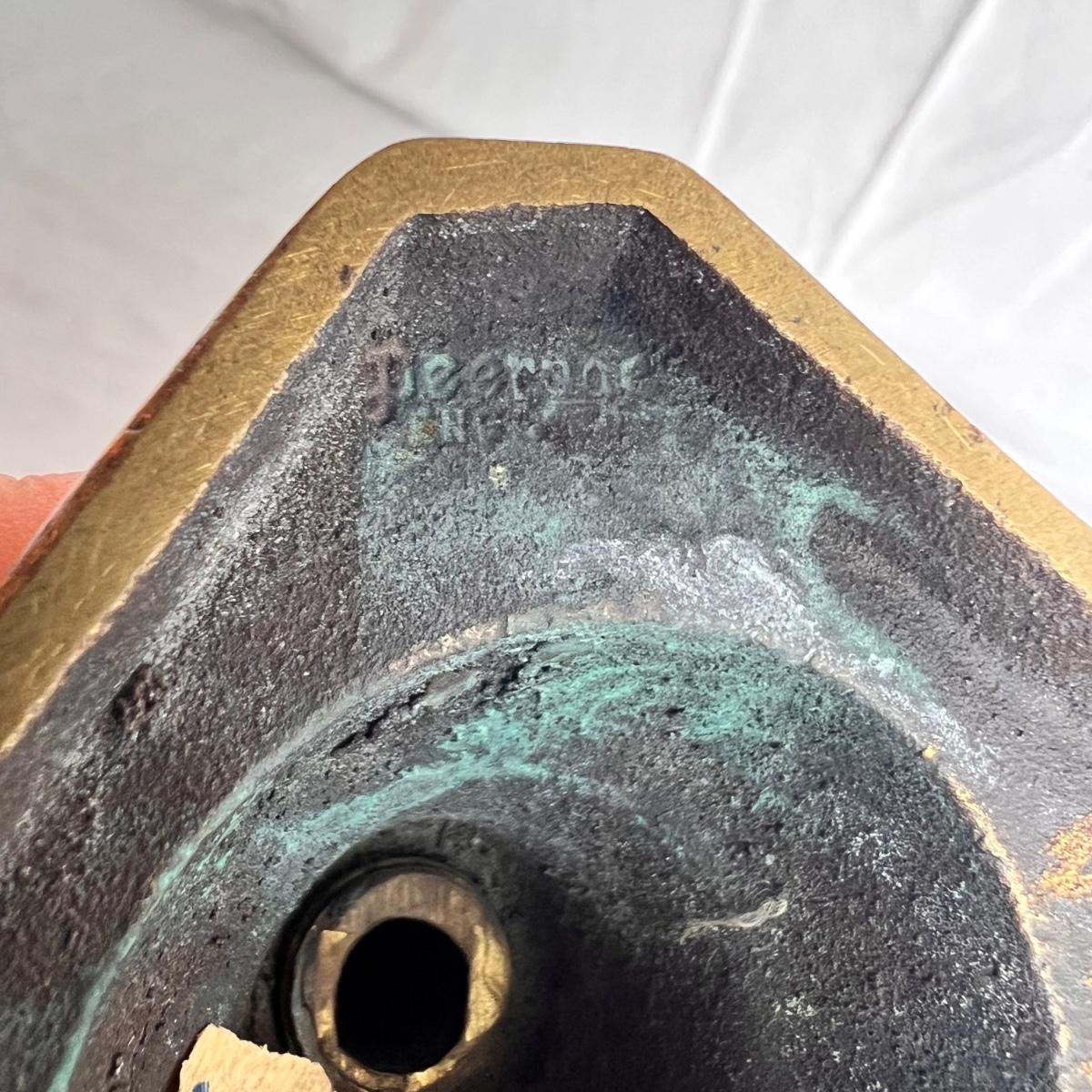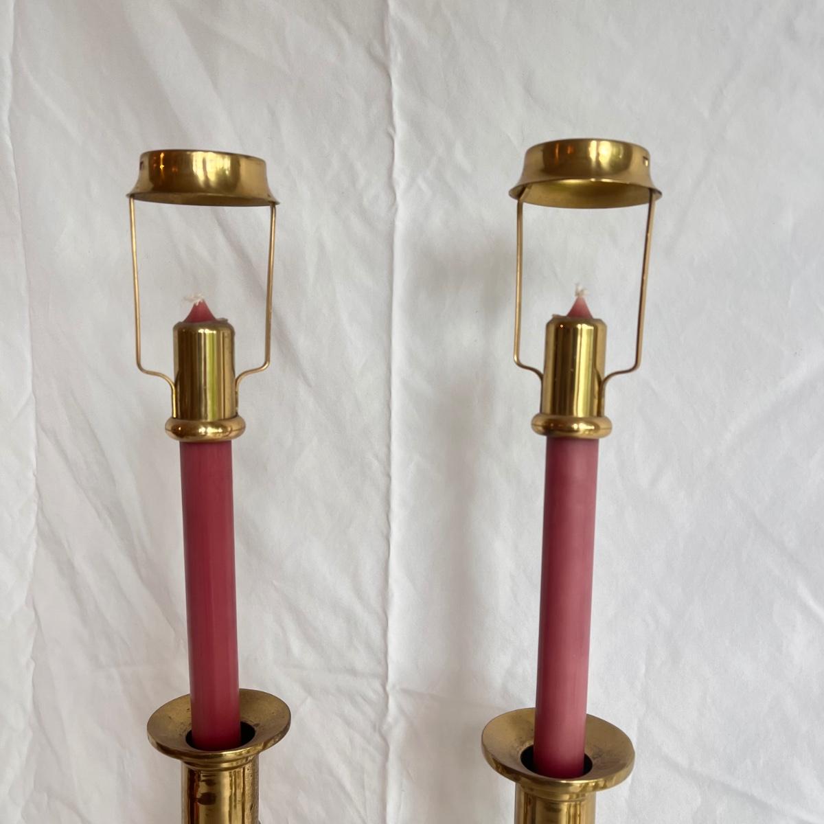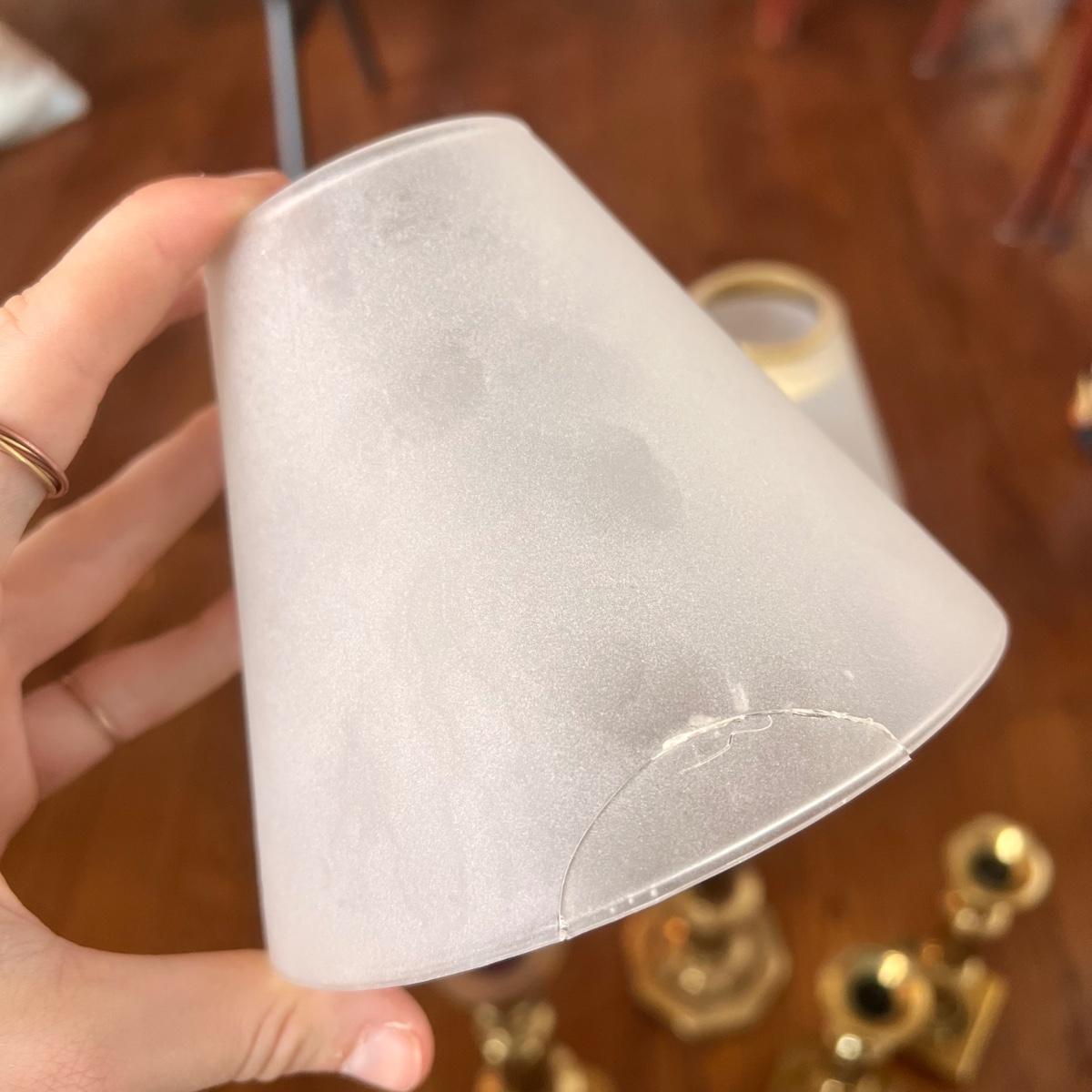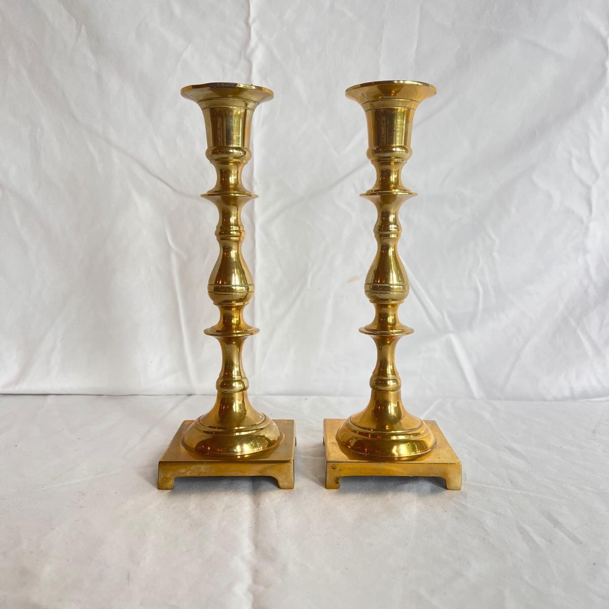 This lot includes eight brass candleholders in various sizes. Two of the candlestick holders have frosted glass lampshades with a brass base. One of the lampshades has a crack in it - see picture included. Some of the candlestick holders are stamped with “Harvin.” The other stamped brass holders are stamped, but not legible. The largest candlestick holders are the ones with their lampshades that measure 5” x 5” x 23”H. Shipping available.