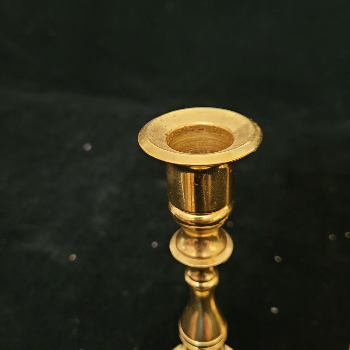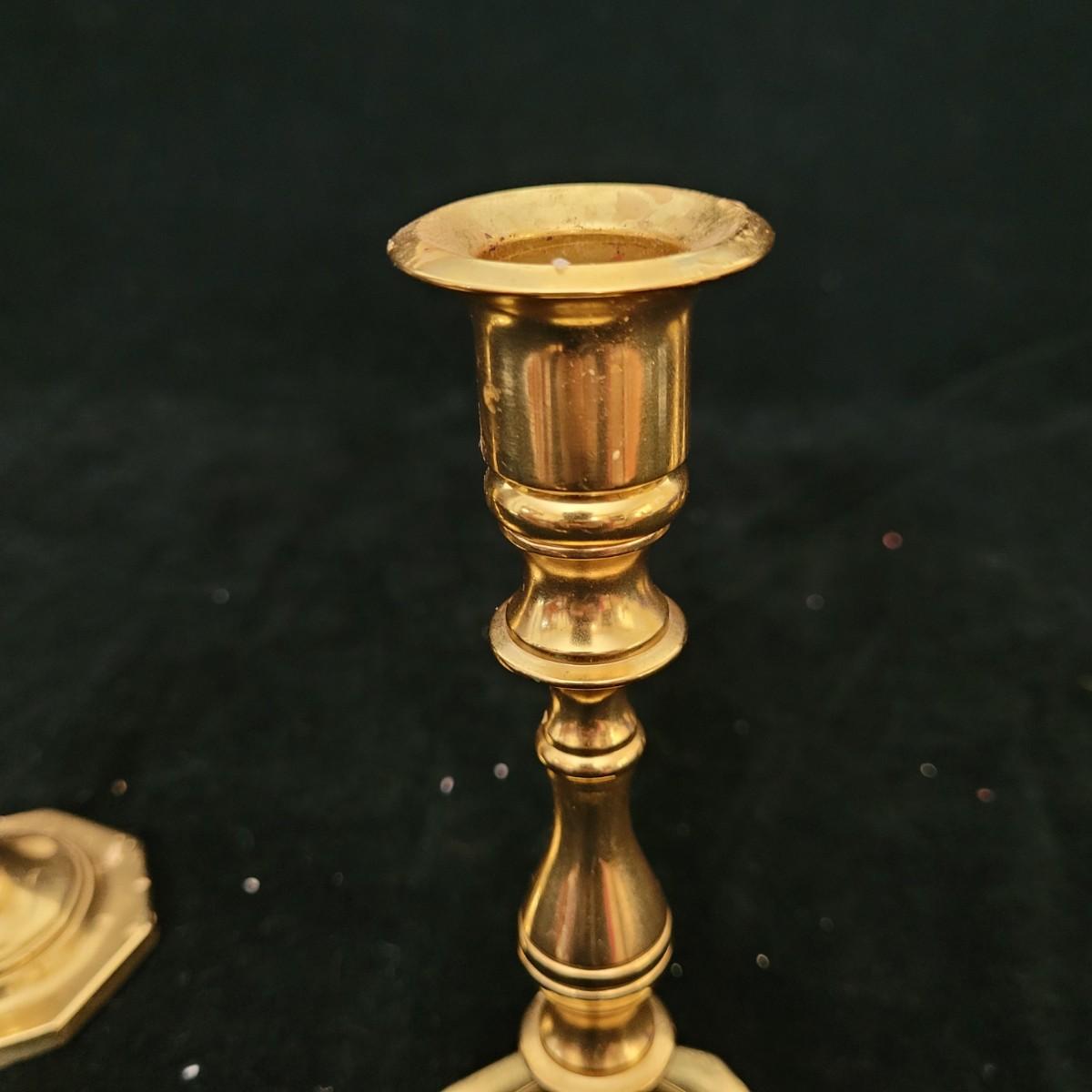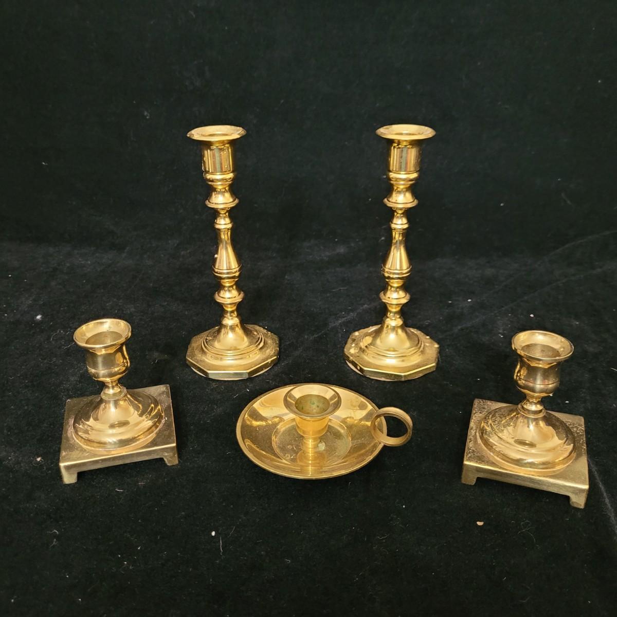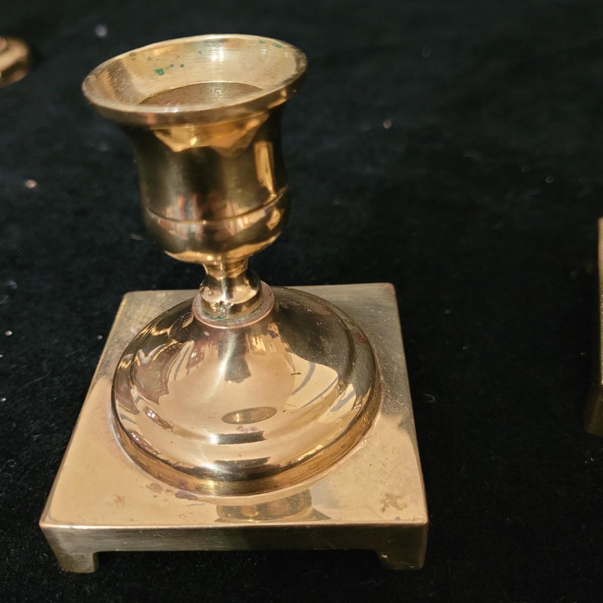 Variety of brass candlesticks, including Baldwin brand, in good to fair condition. Can be cleaned which will likely improve appearance. Tall candlesticks measure approximately 3"DIA x7.5"H. Also included is a metal “taper tipper” and a variety of taper candles.