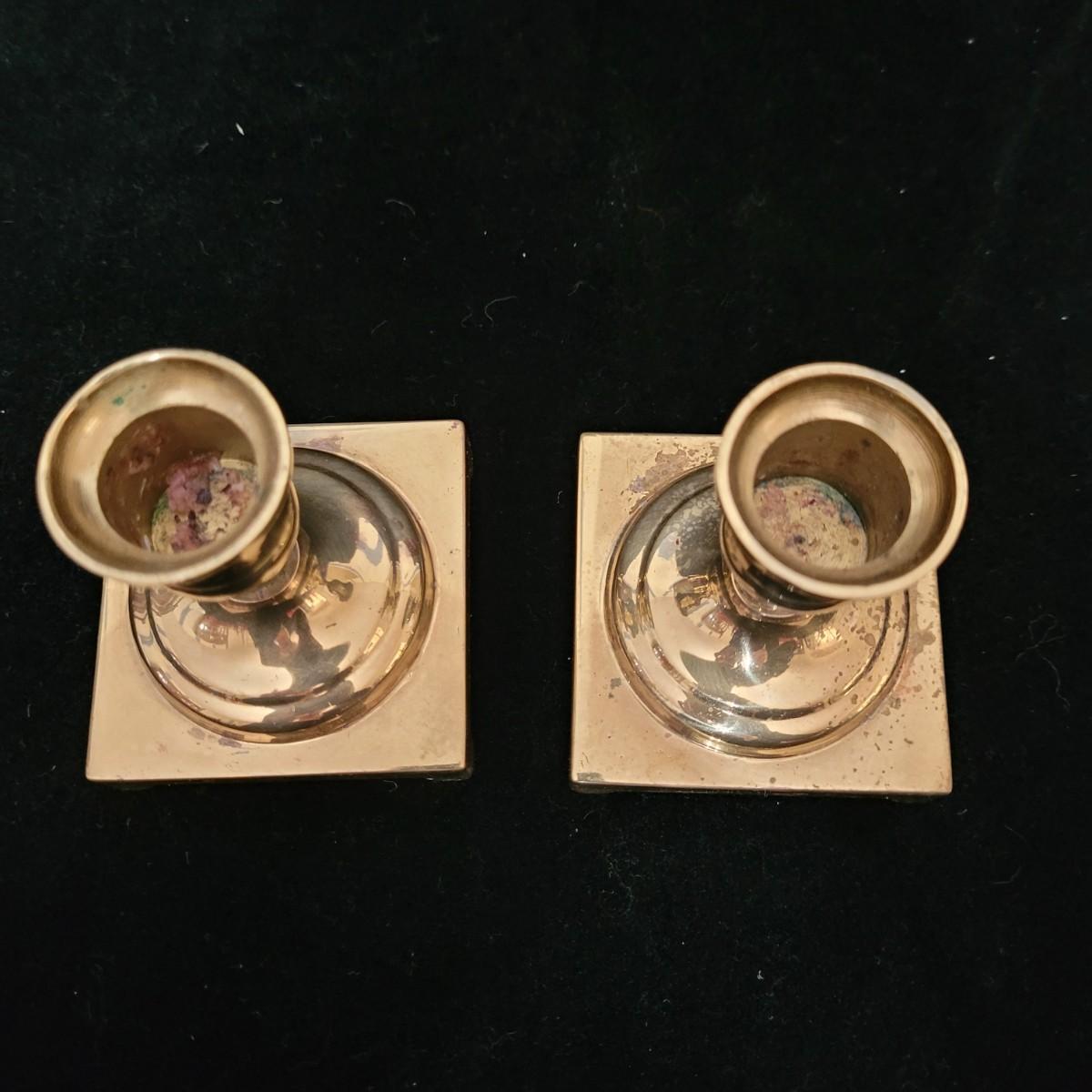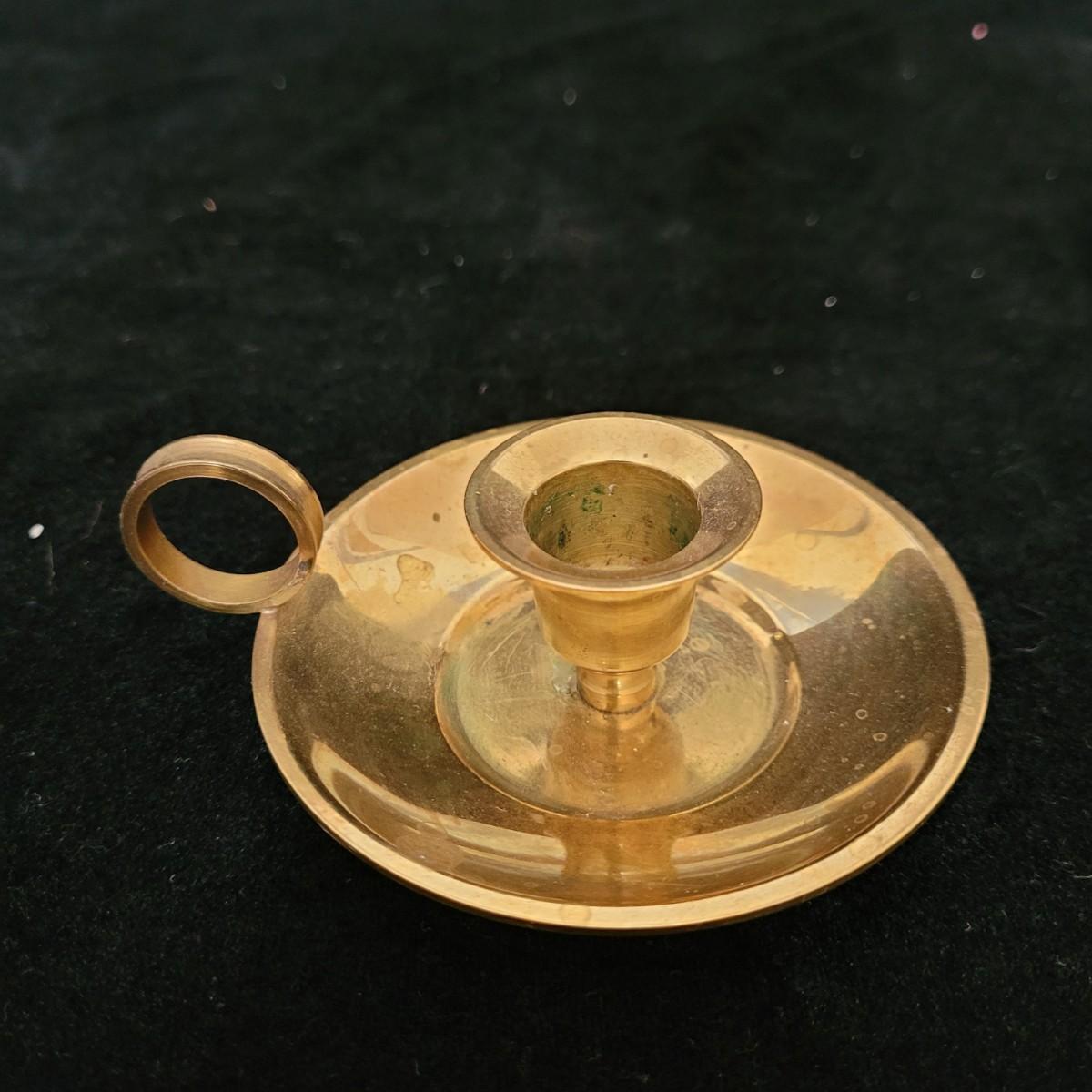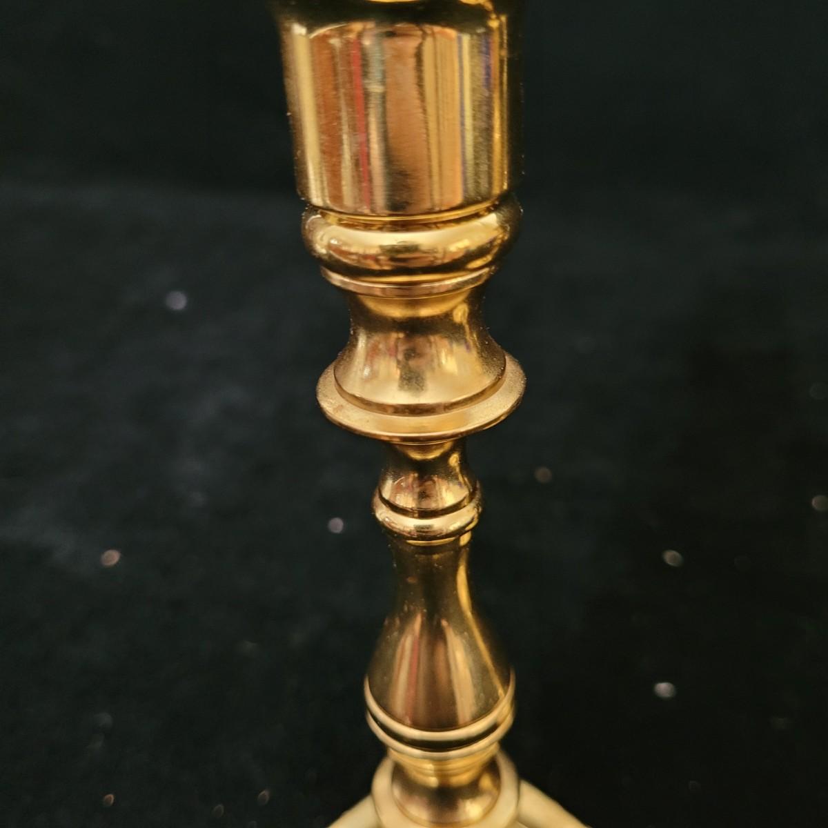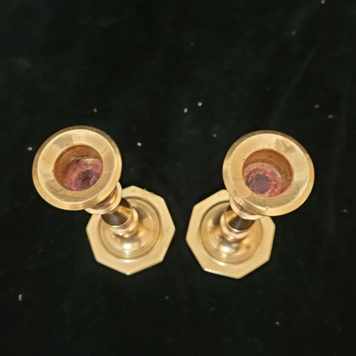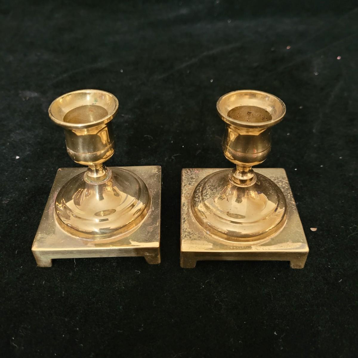 Variety of brass candlesticks, including Baldwin brand, in good to fair condition. Can be cleaned which will likely improve appearance. Tall candlesticks measure approximately 3"DIA x7.5"H. Also included is a metal “taper tipper” and a variety of taper candles.