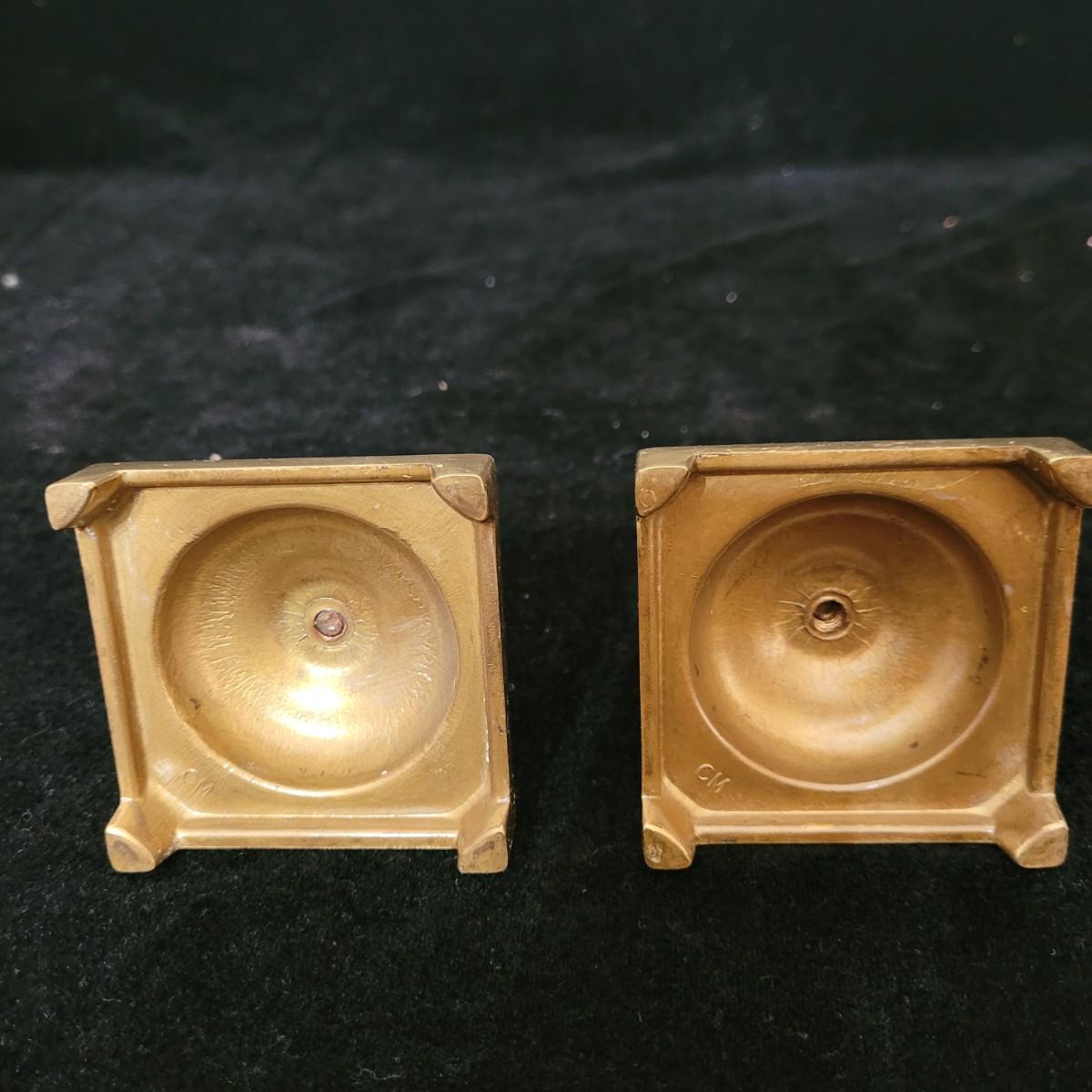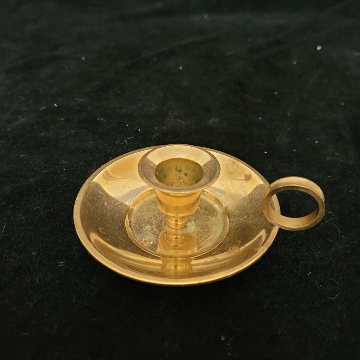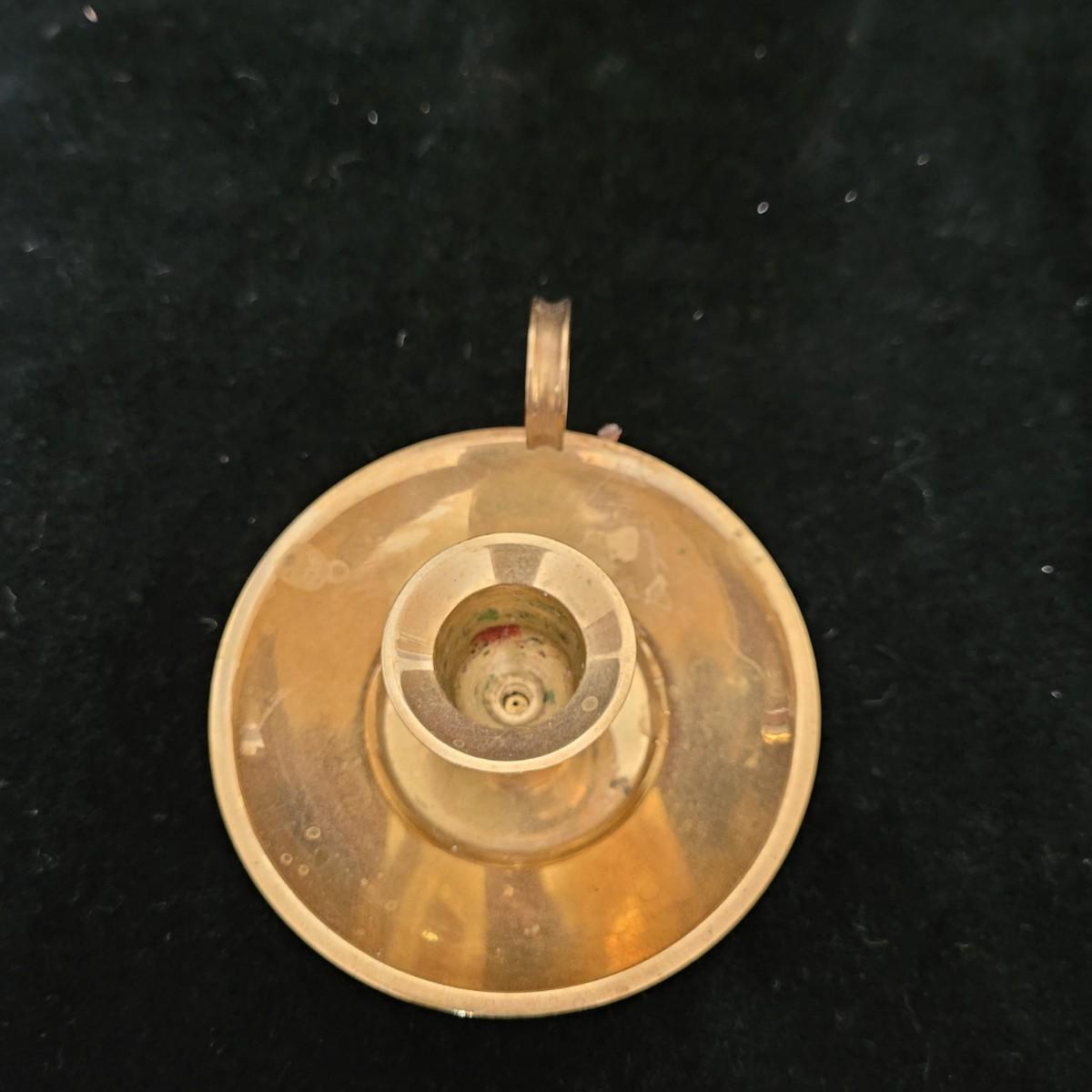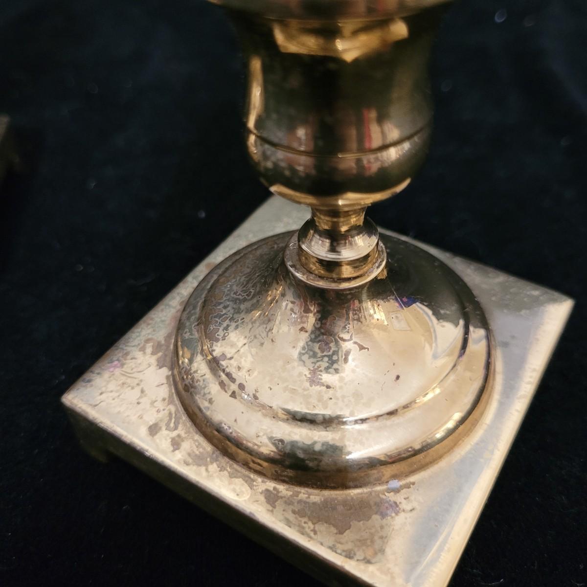 Variety of brass candlesticks, including Baldwin brand, in good to fair condition. Can be cleaned which will likely improve appearance. Tall candlesticks measure approximately 3"DIA x7.5"H. Also included is a metal “taper tipper” and a variety of taper candles.