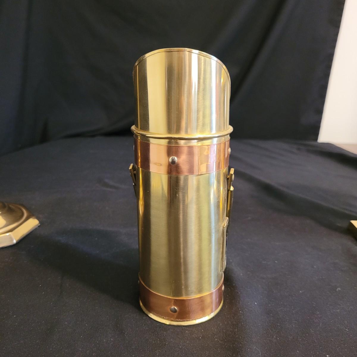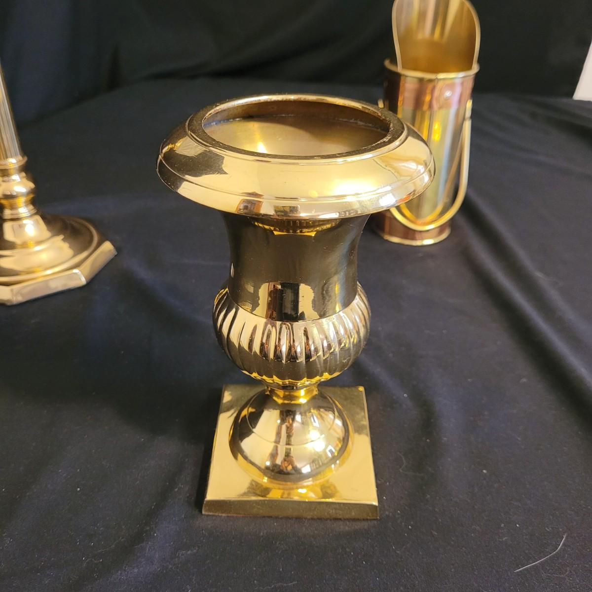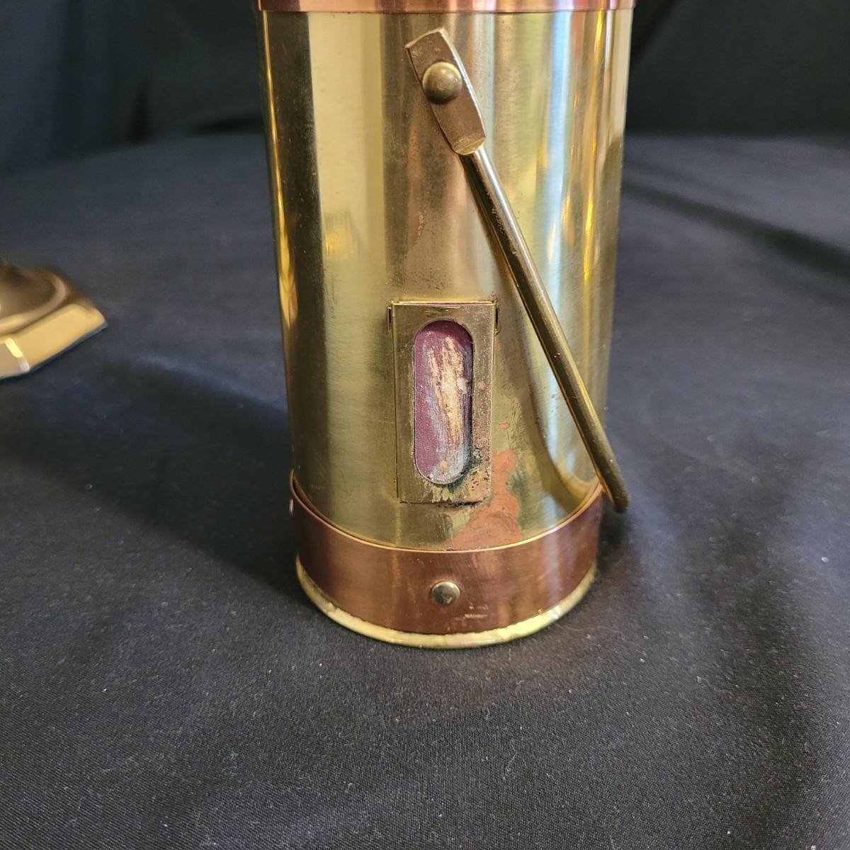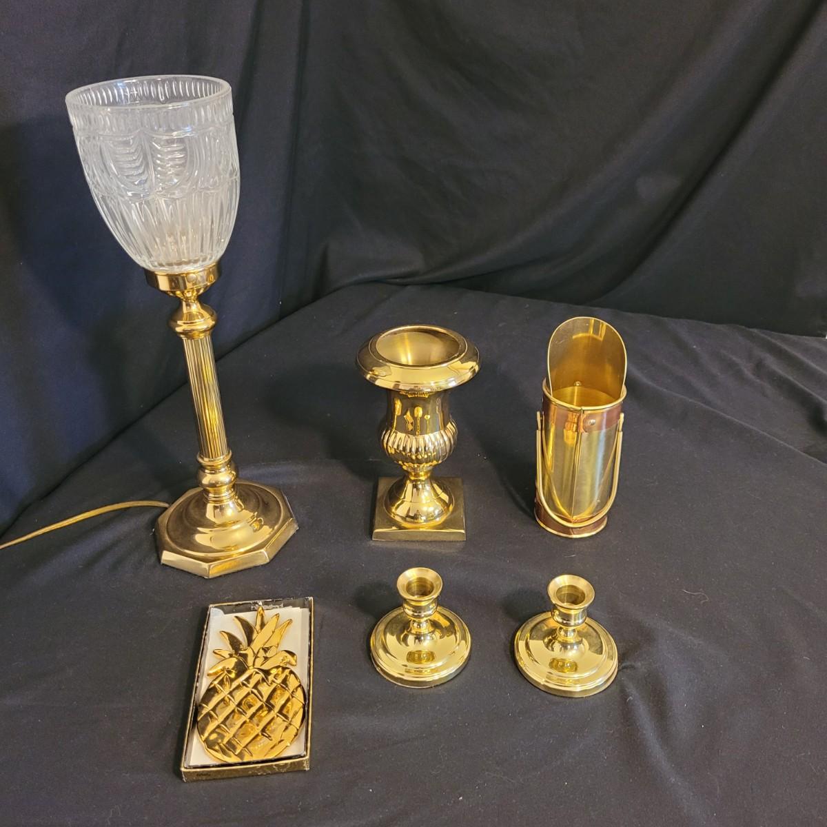 Collection of what appears to be brass decor, including a table lamp, brass and copper matchstick holder, pineapple hanging, two Baldwin candlestick holders and a goblet style vase. Items are in good condition, in need of some light cleaning. Lamp measures approximately 6"D at base x 16"H. Shipping available.