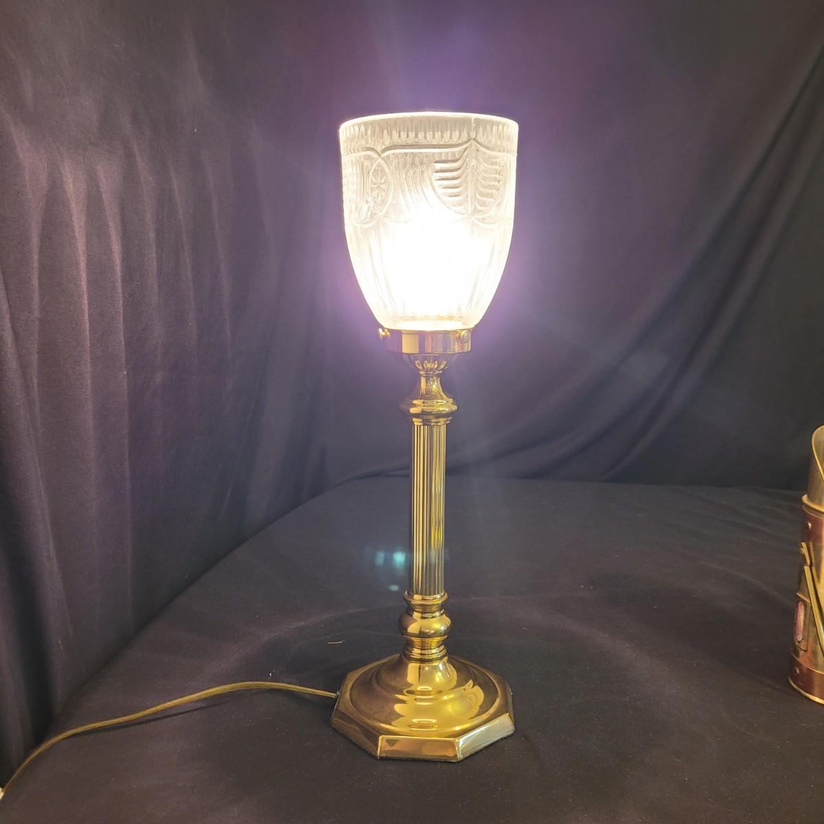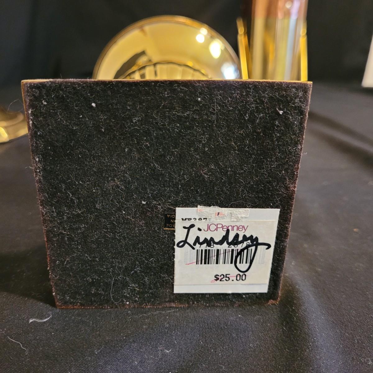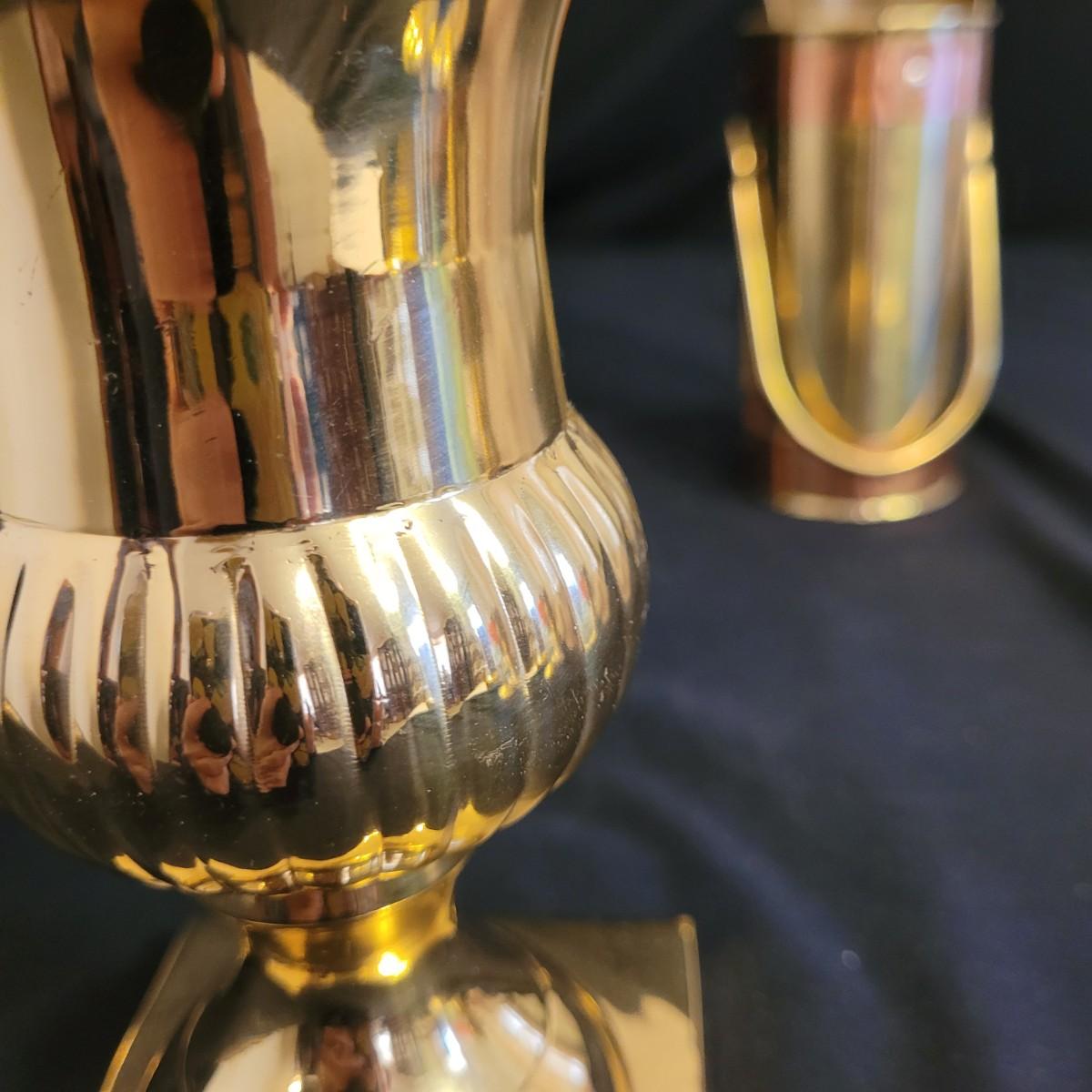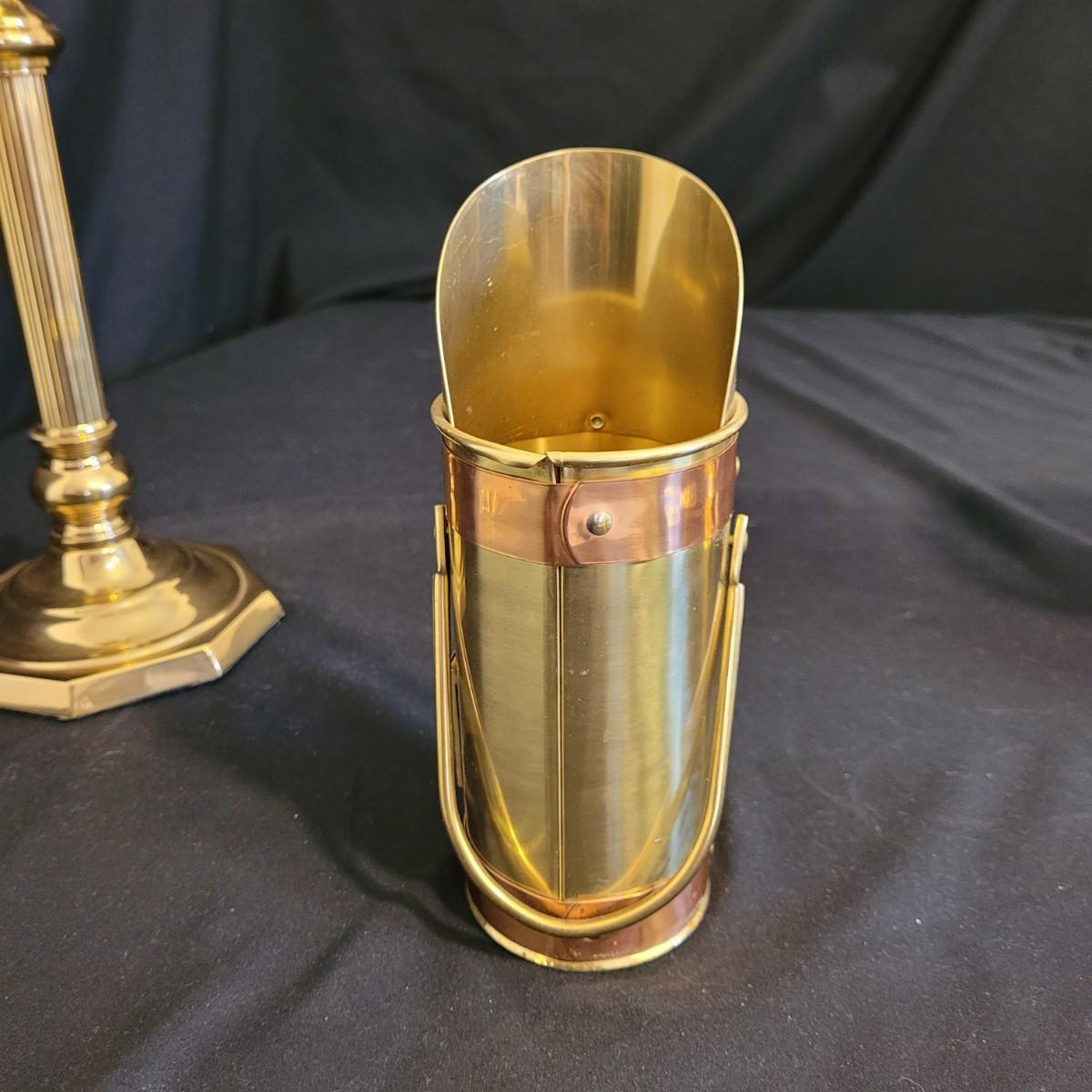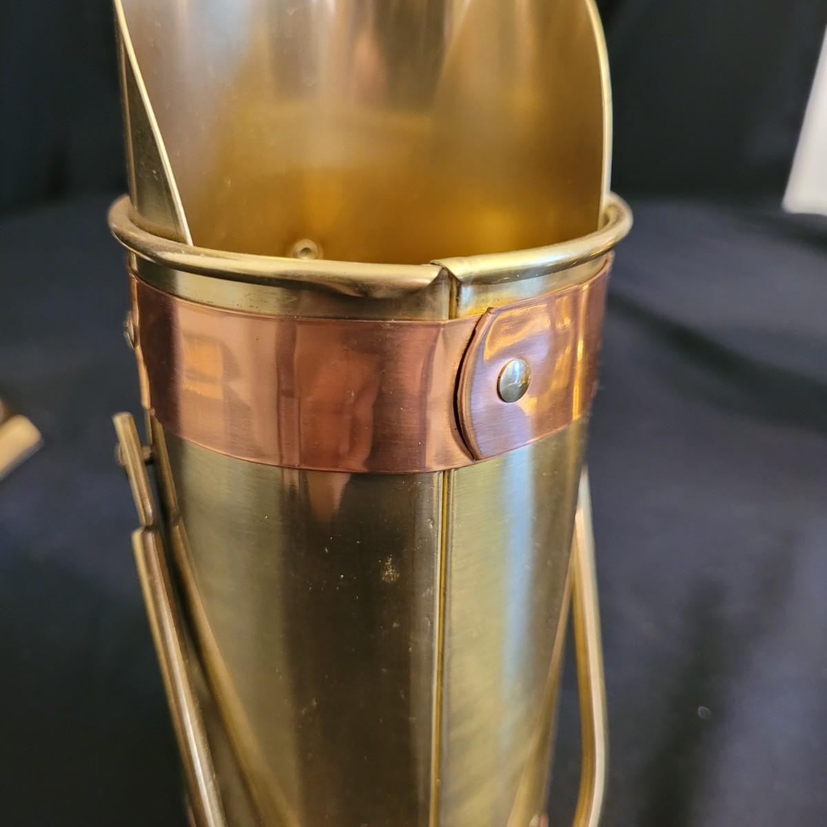 Collection of what appears to be brass decor, including a table lamp, brass and copper matchstick holder, pineapple hanging, two Baldwin candlestick holders and a goblet style vase. Items are in good condition, in need of some light cleaning. Lamp measures approximately 6"D at base x 16"H. Shipping available.